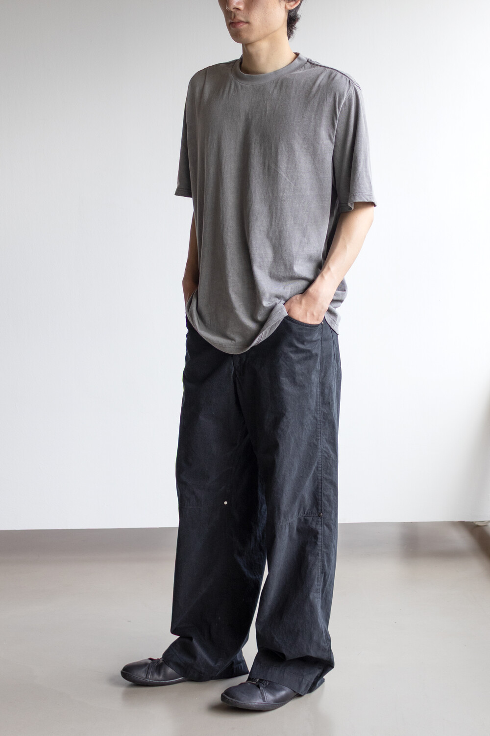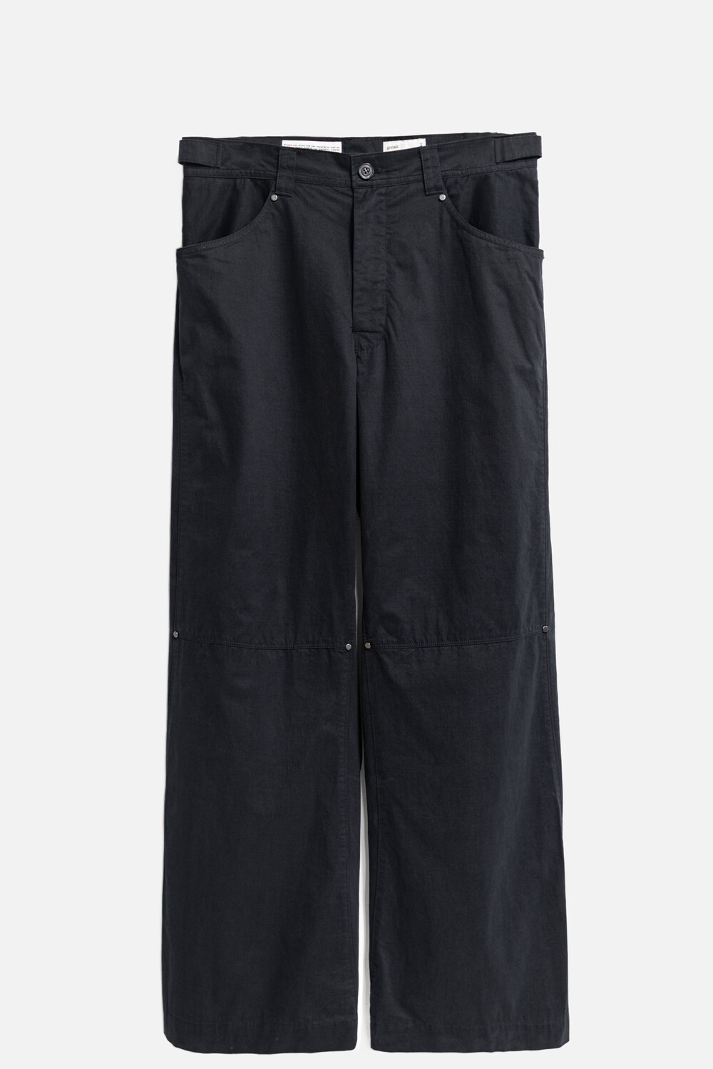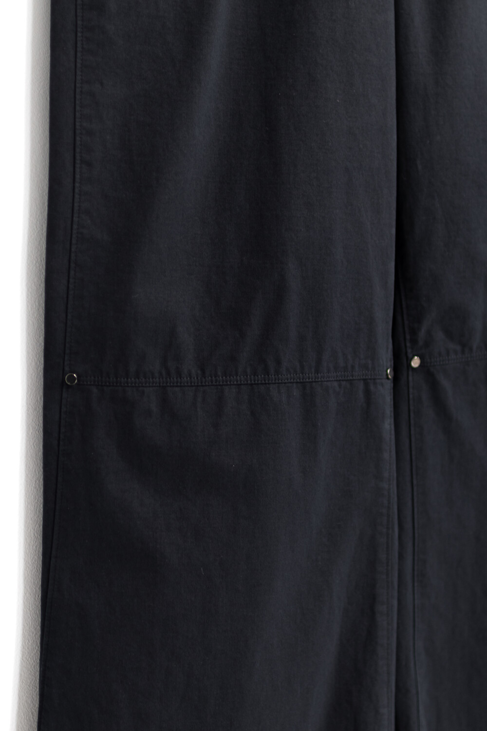 더블 니 팬츠의 주요 구성요소인 무릎 패널을 소거하고 절개라인으로 그리면서 패널 고정리벳은 리벳은 앞주머니와 무릎 절개 부위에 배치하였습니다. 더블니의 재구성 외에, 봉제 시 힘 받는 부위를 고려하여 인아웃심을 굴렸는데, 이러한 패터닝으로 자연스럽고 옅은 플레어 실루엣을 형성합니다.