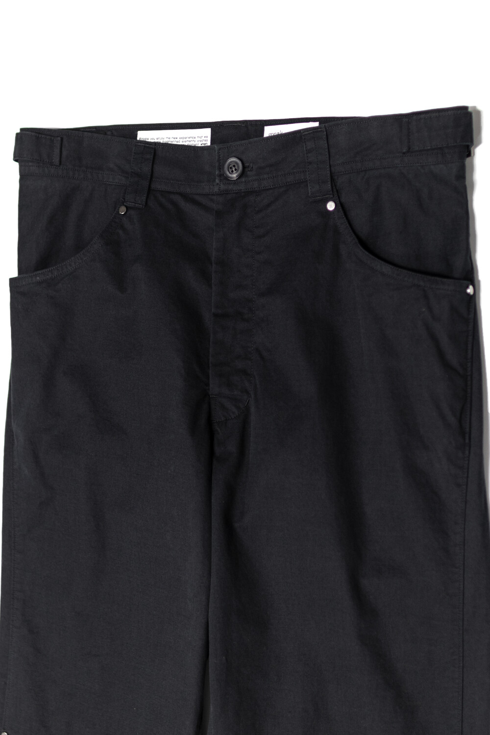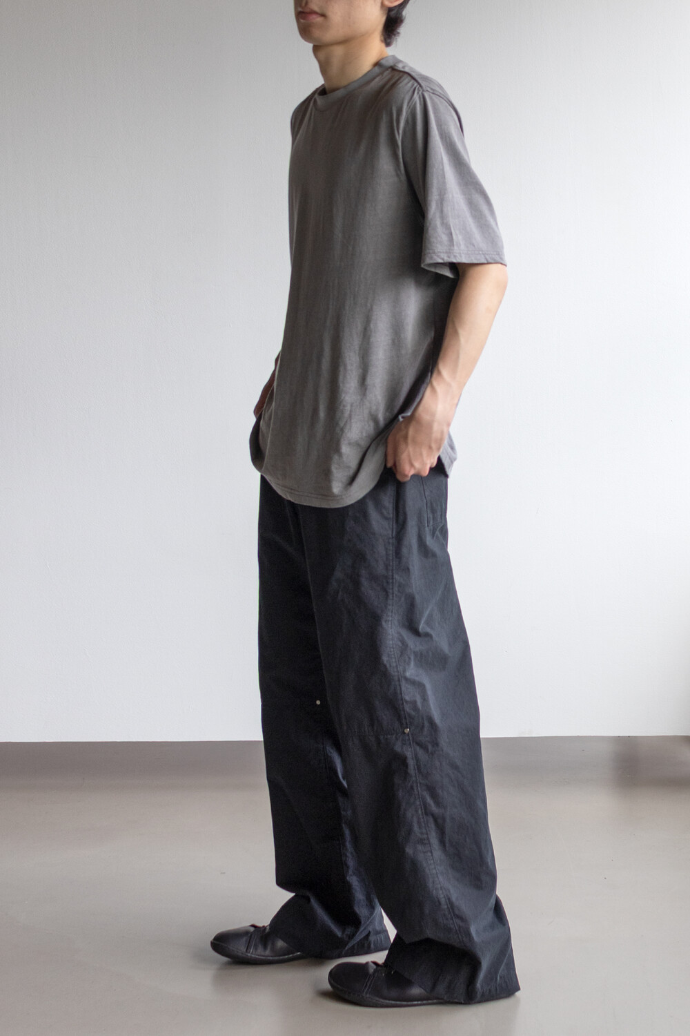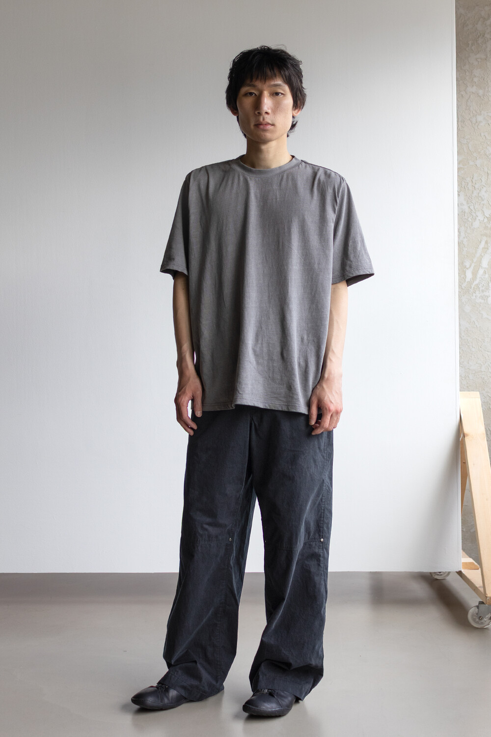 더블 니 팬츠의 주요 구성요소인 무릎 패널을 소거하고 절개라인으로 그리면서 패널 고정리벳은 리벳은 앞주머니와 무릎 절개 부위에 배치하였습니다. 더블니의 재구성 외에, 봉제 시 힘 받는 부위를 고려하여 인아웃심을 굴렸는데, 이러한 패터닝으로 자연스럽고 옅은 플레어 실루엣을 형성합니다.