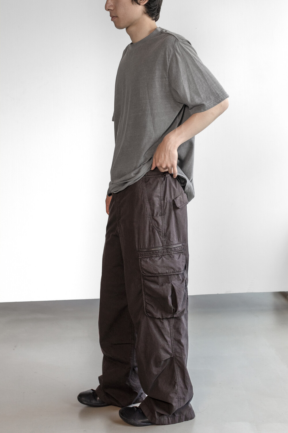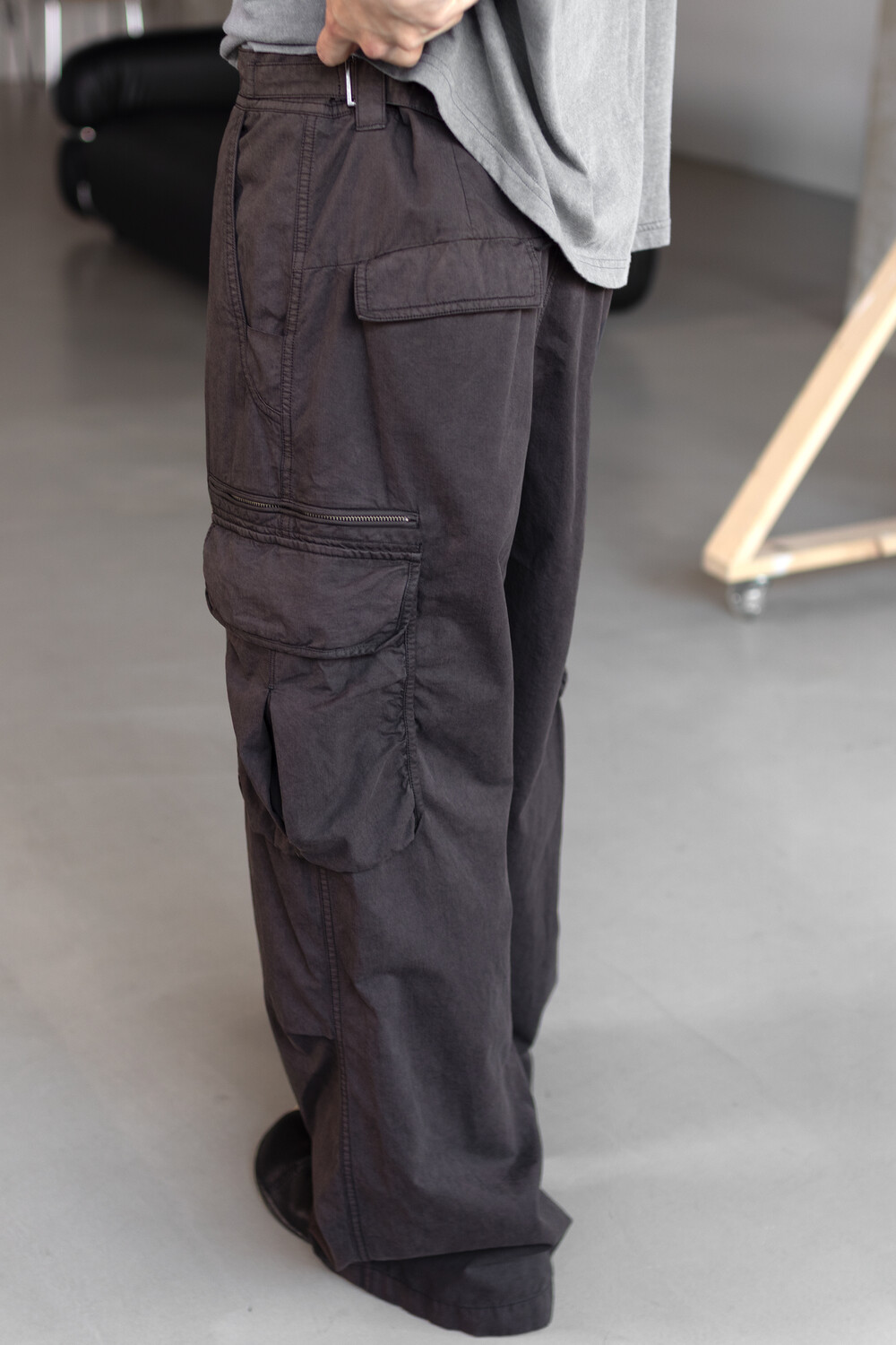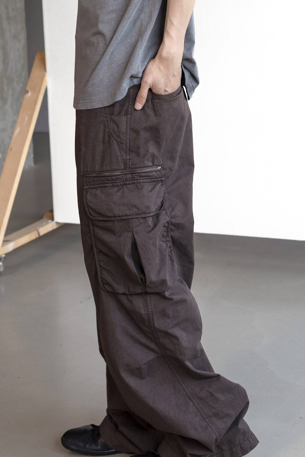 각기 다른 8개의 포켓과 여유 있는 실루엣, 완성 후 가먼트 다잉하는 방식으로 불균일하고 깊은 색감을 갖는 <8p zip cargo pants>입니다.
