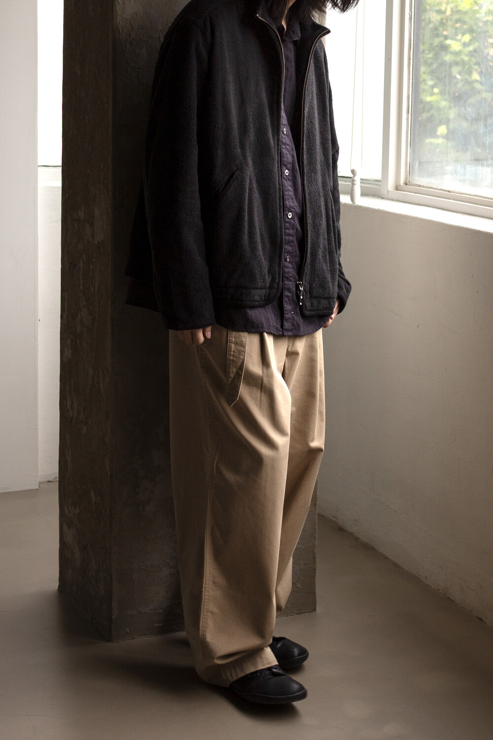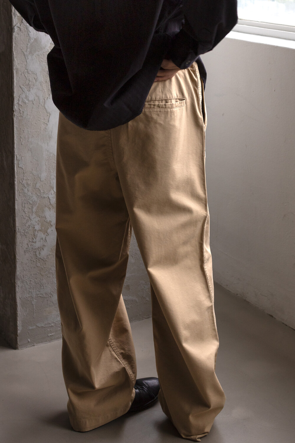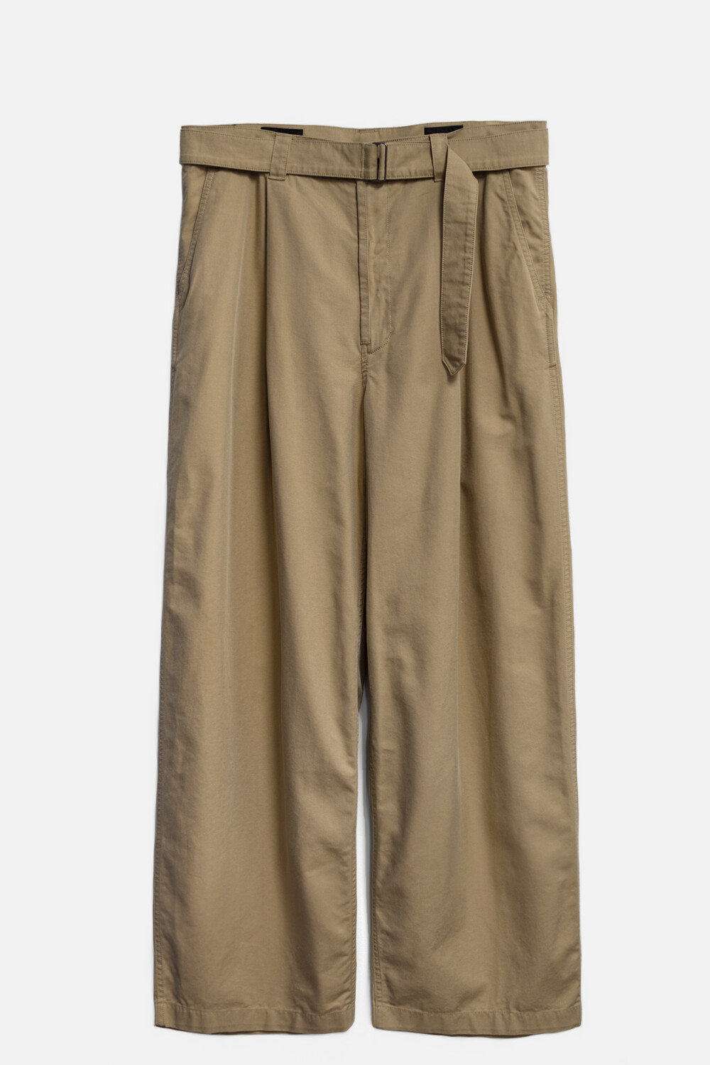 유연하면서 내구성 있는, 코튼/레이온 원단을 사용. 상동에 깊은 턱과 재원단 벨트로 장식한 <bleted chino pants>입니다.