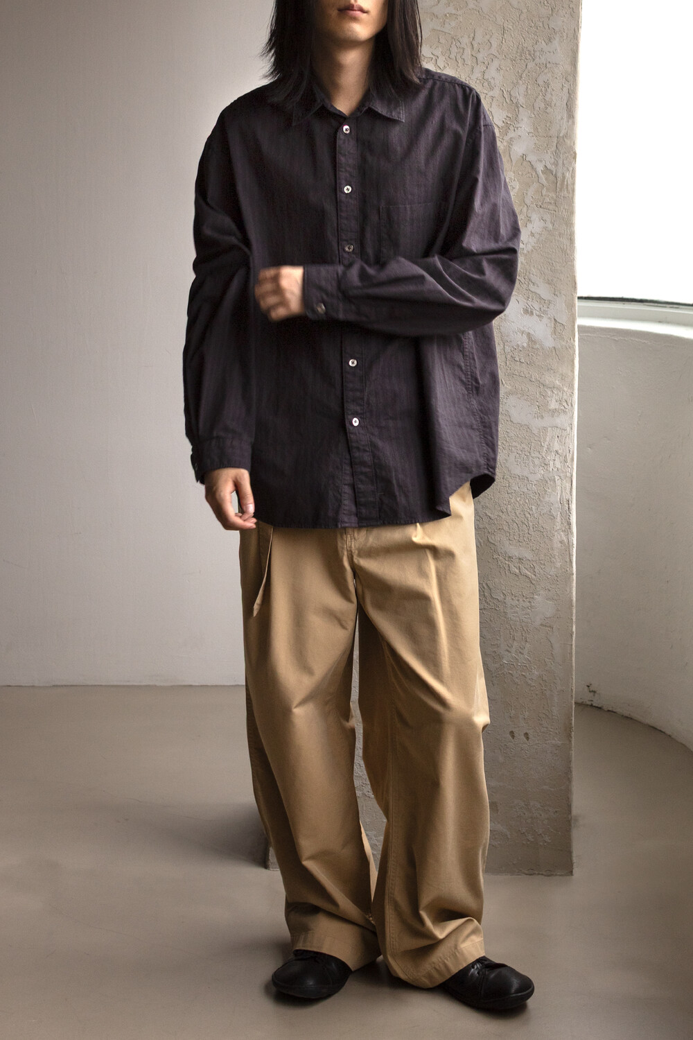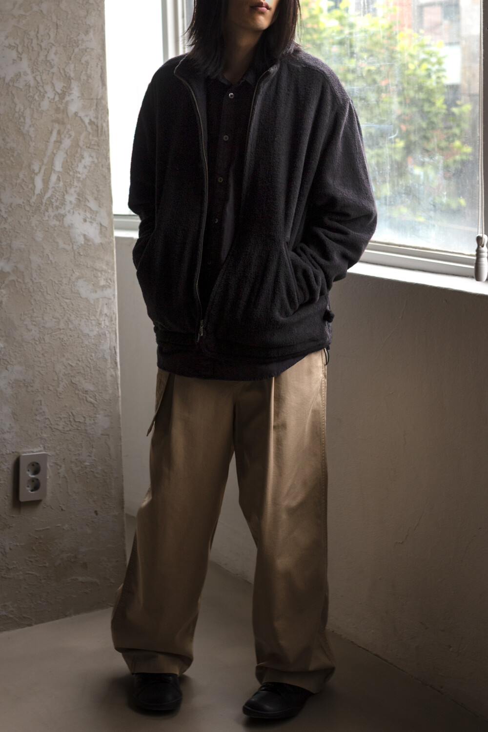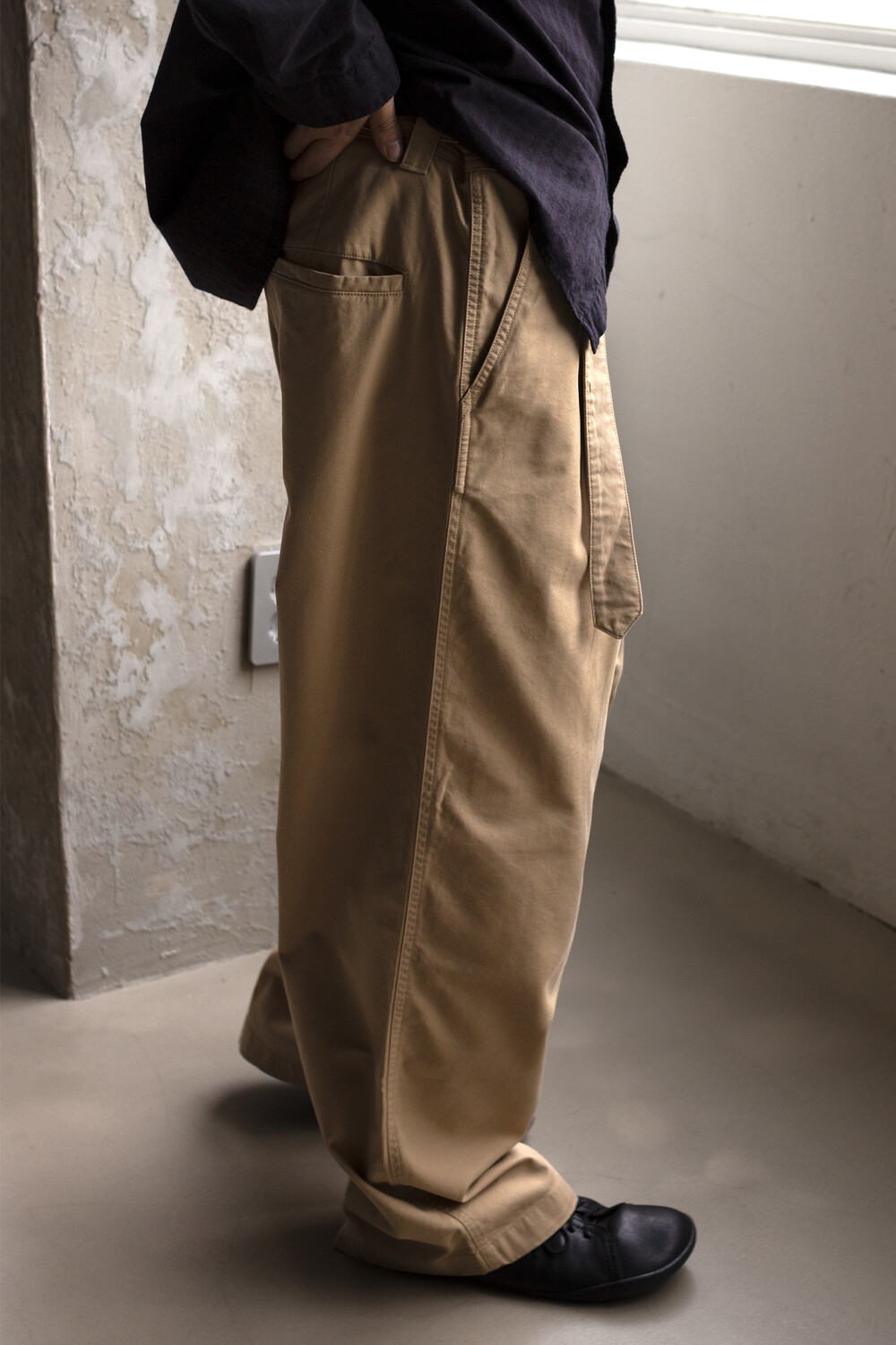 유연하면서 내구성 있는, 코튼/레이온 원단을 사용. 상동에 깊은 턱과 재원단 벨트로 장식한 <bleted chino pants>입니다.