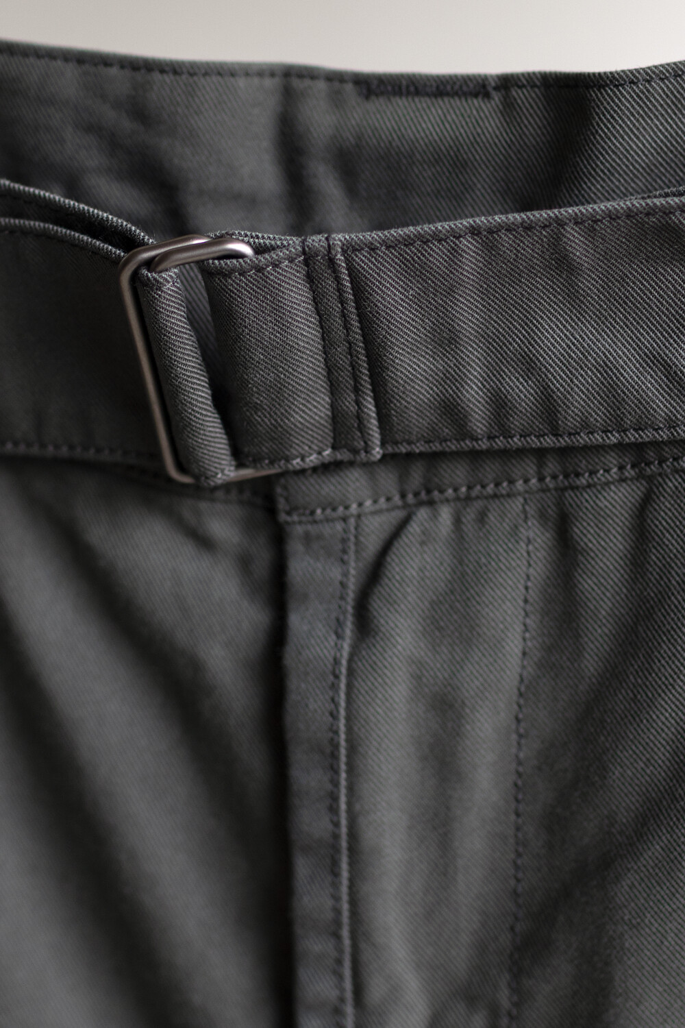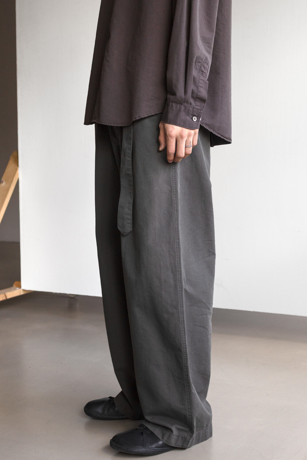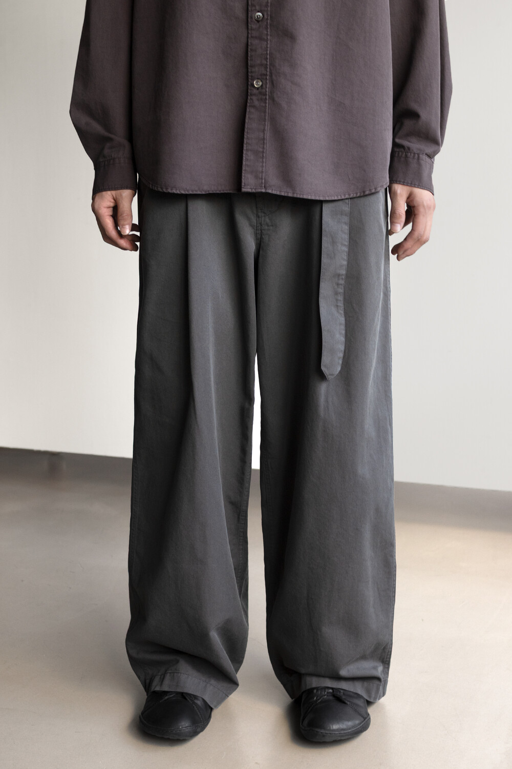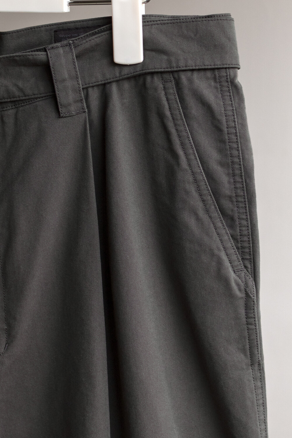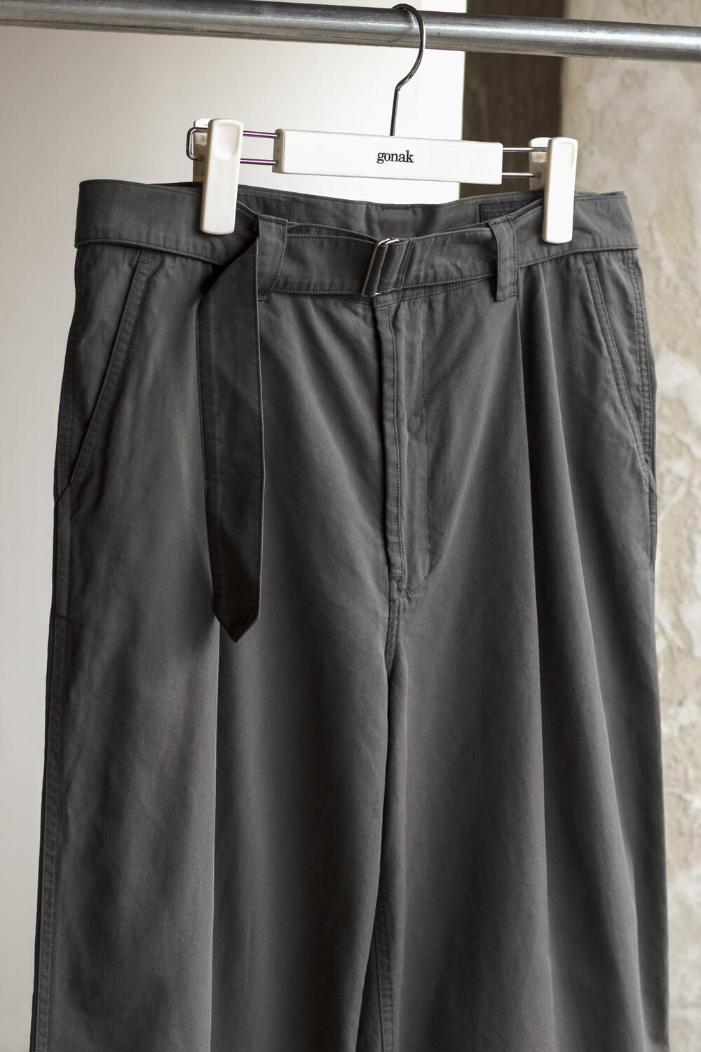 유연하면서 내구성 있는, 코튼/레이온 원단을 사용. 상동에 깊은 턱과 재원단 벨트로 장식한 <bleted chino pants>입니다.