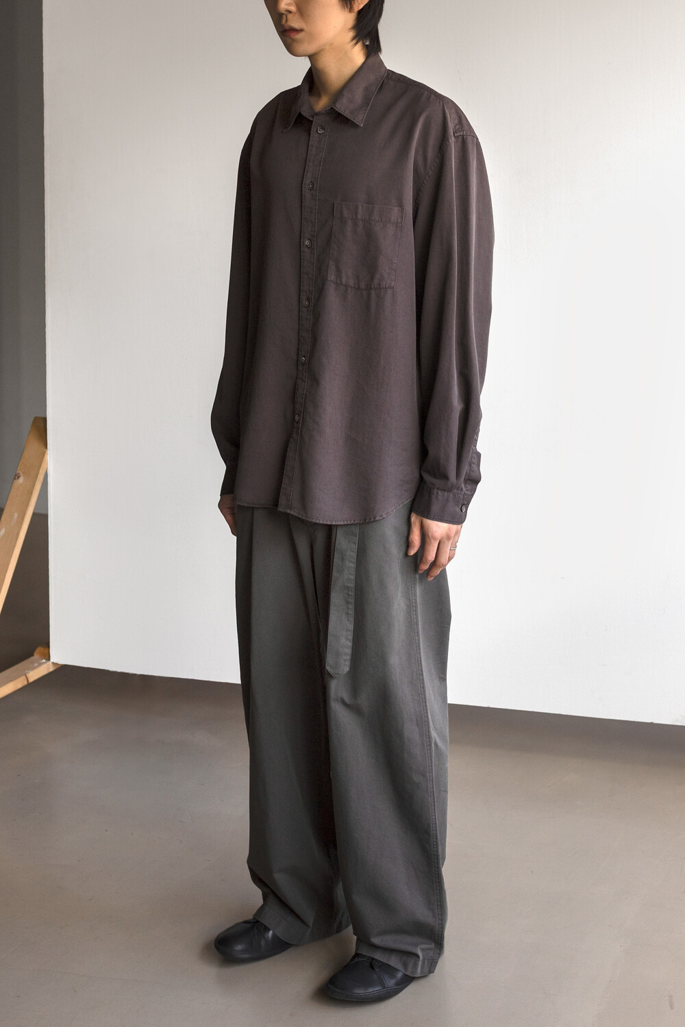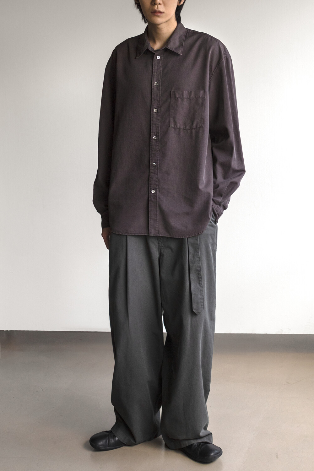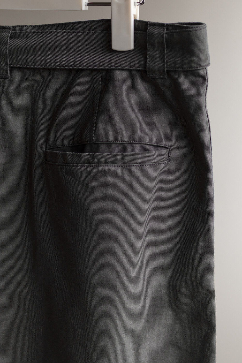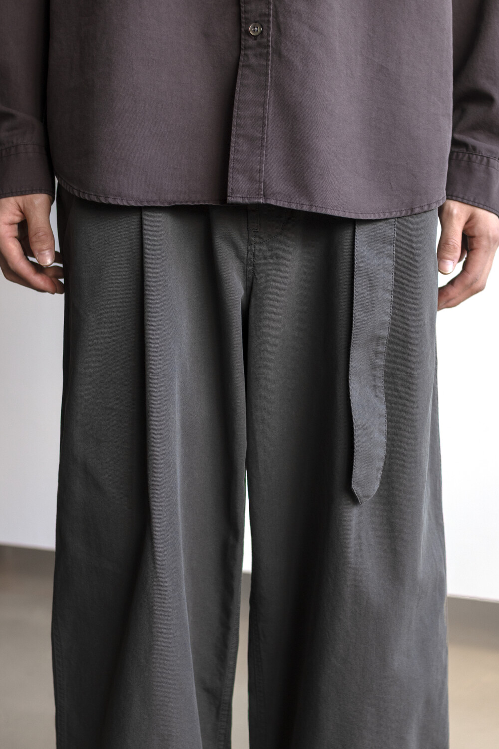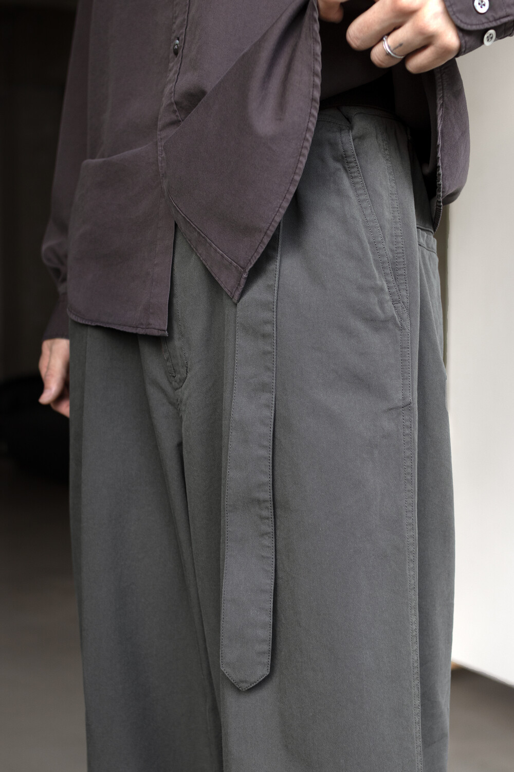 유연하면서 내구성 있는, 코튼/레이온 원단을 사용. 상동에 깊은 턱과 재원단 벨트로 장식한 <bleted chino pants>입니다.