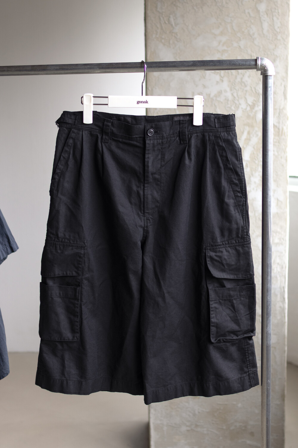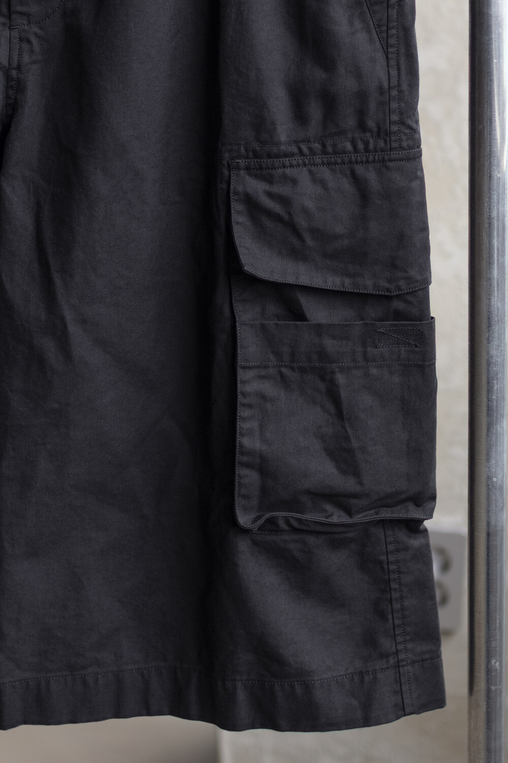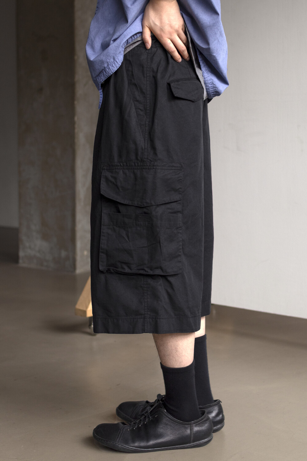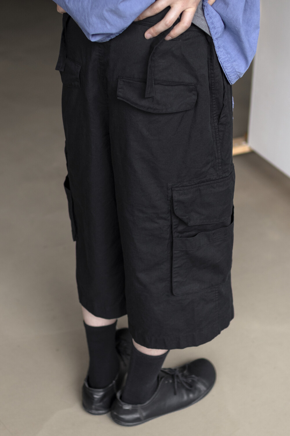 내구성과 유연함을 고루 갖춘 코튼/레이온 혼방 소재를 겉감으로, 측면에 이중 구조의 카고 주머니가 설치된 <Bermuda cargo pants>입니다.