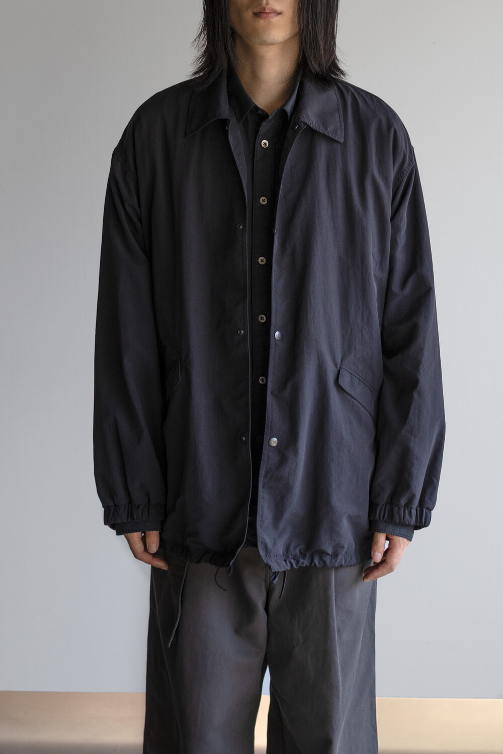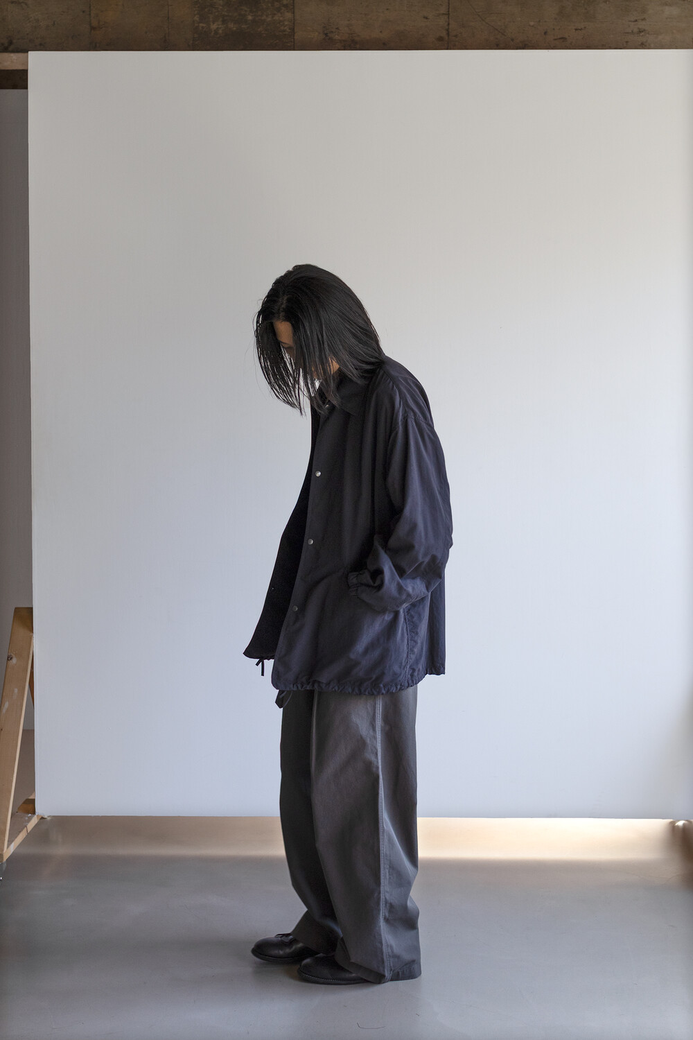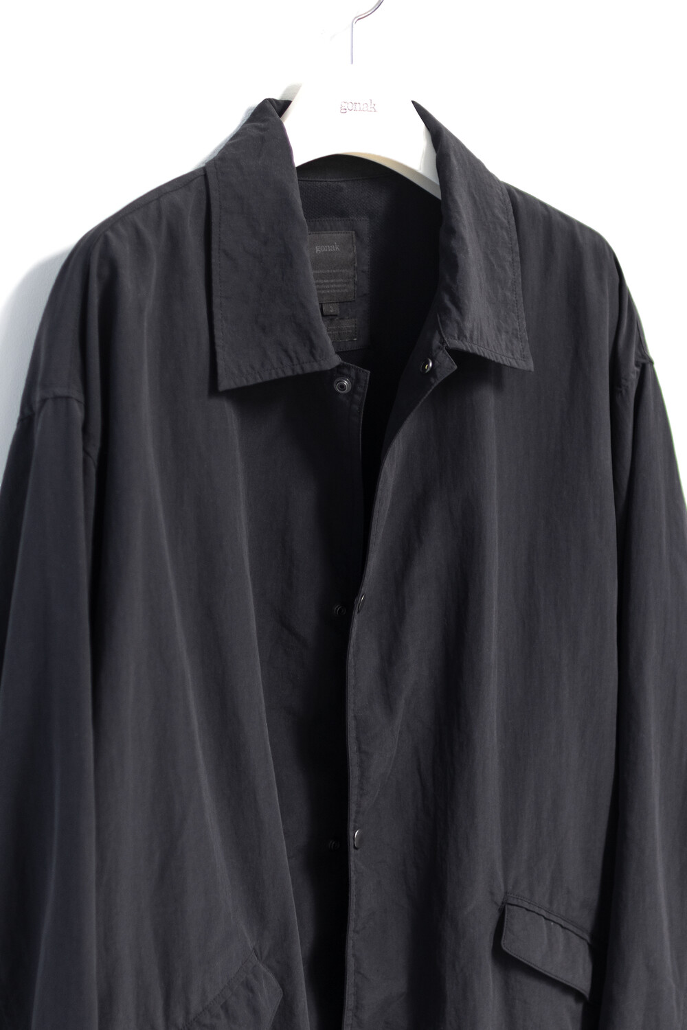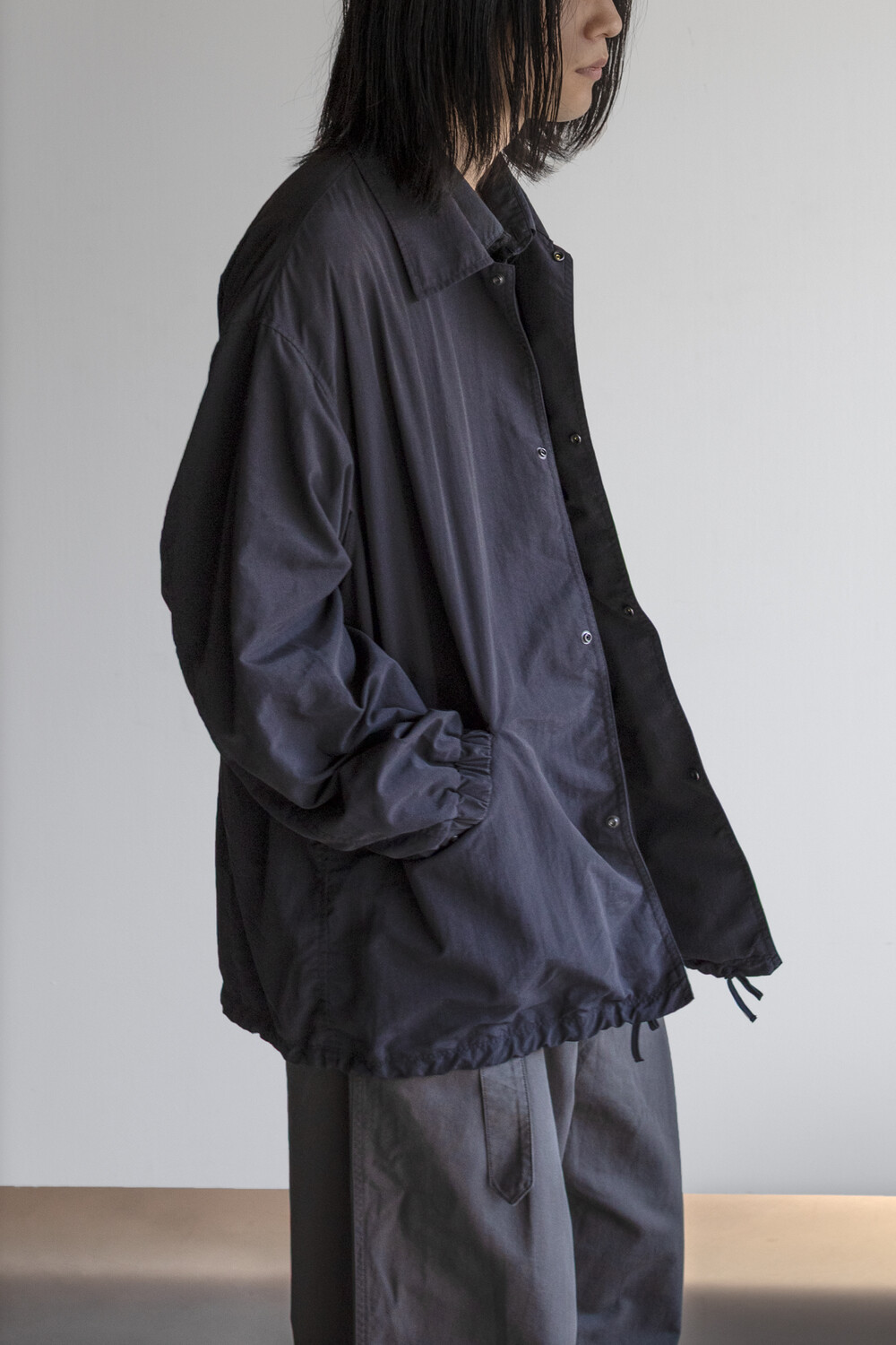 카라와 스냅 방식의 프론트 여밈, 밑단의 끈 조임을 기본 구성으로 하는 코치자켓을 gonak의 무드로 해석하였습니다.