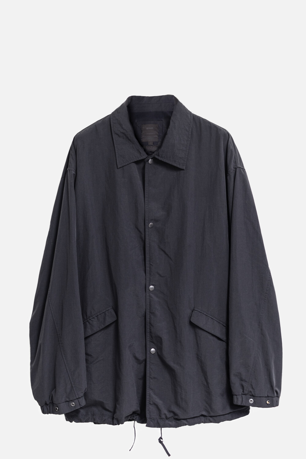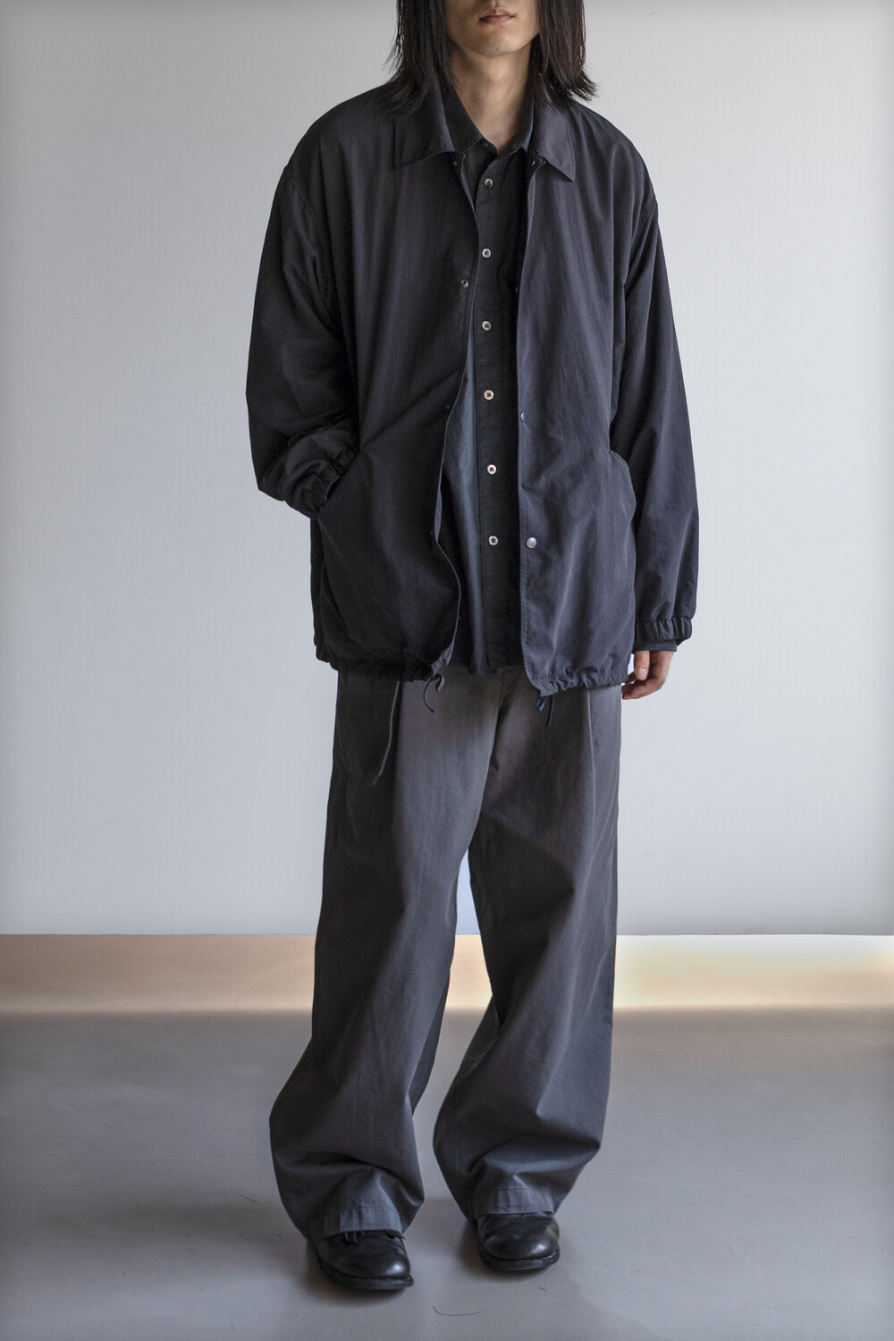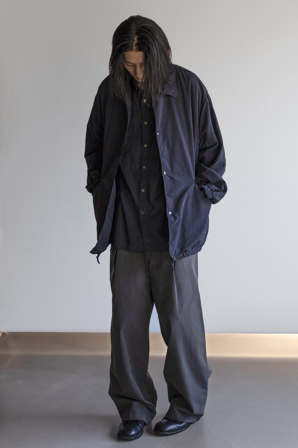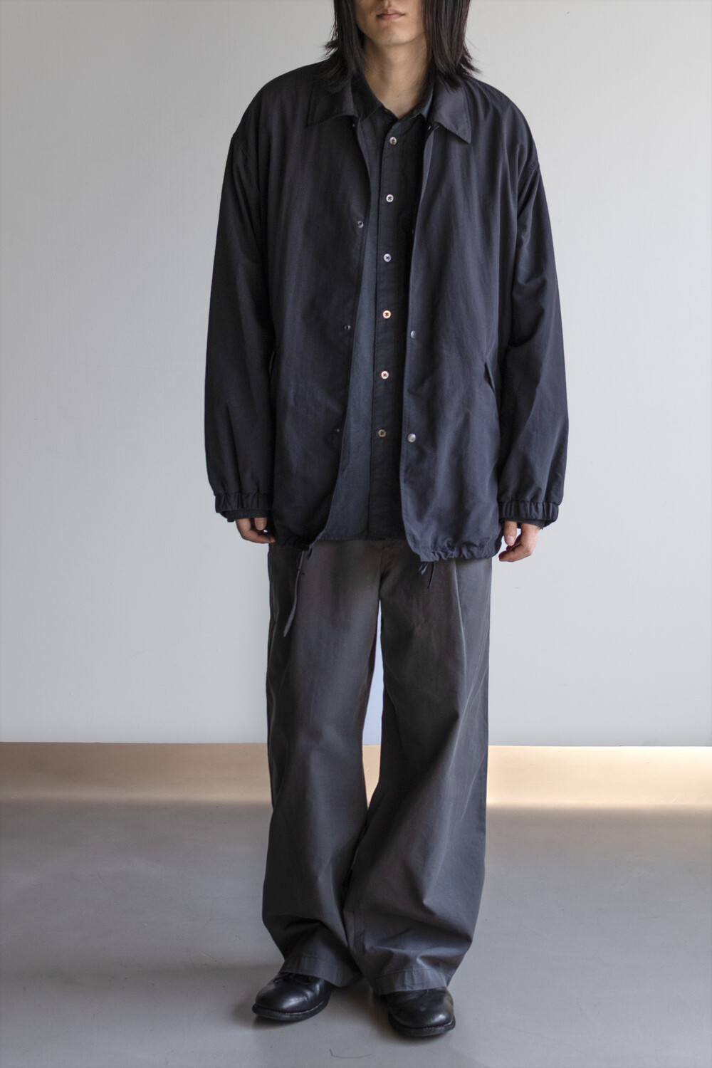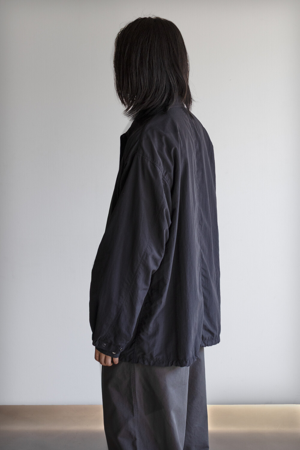 카라와 스냅 방식의 프론트 여밈, 밑단의 끈 조임을 기본 구성으로 하는 코치자켓을 gonak의 무드로 해석하였습니다.