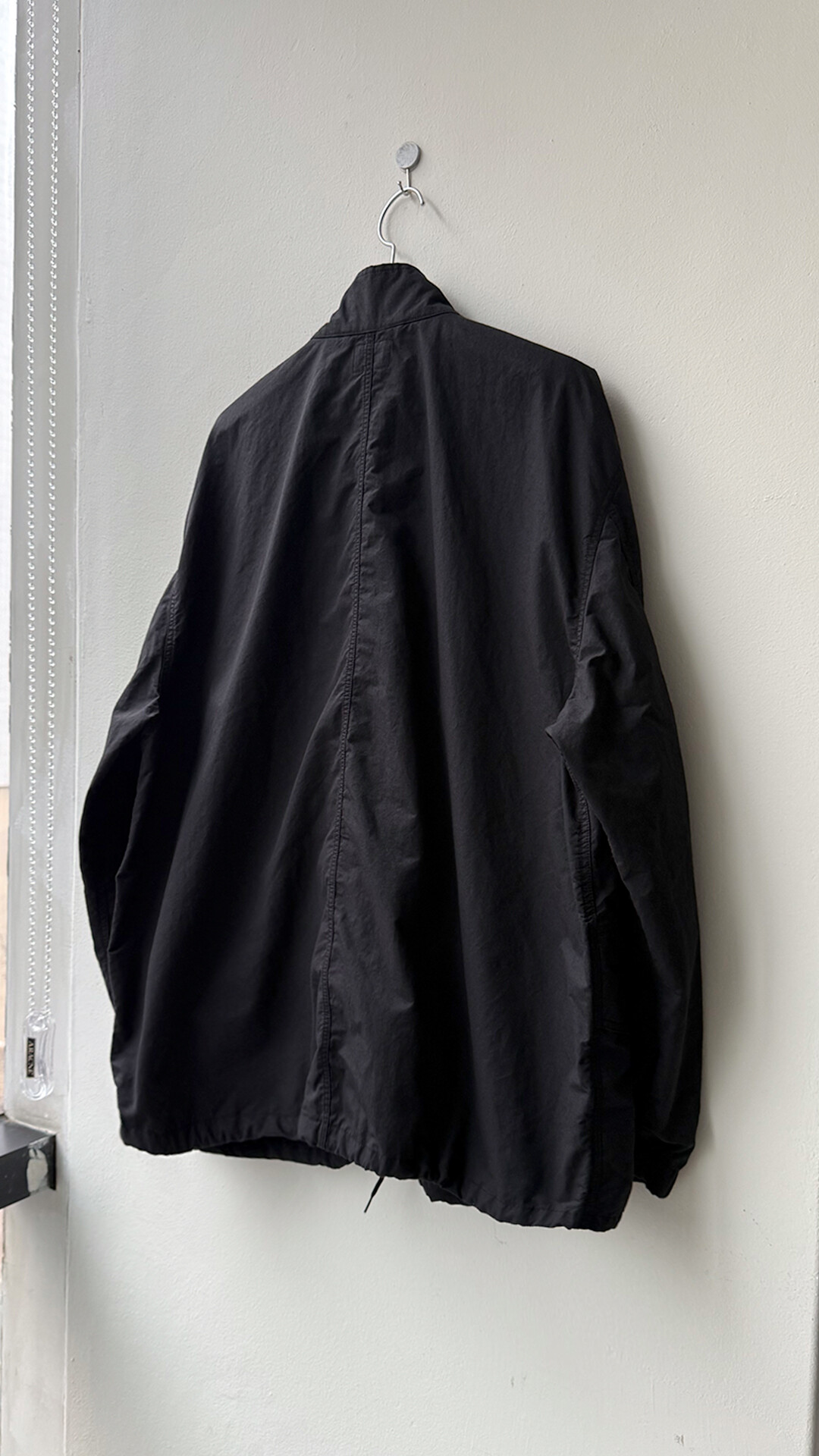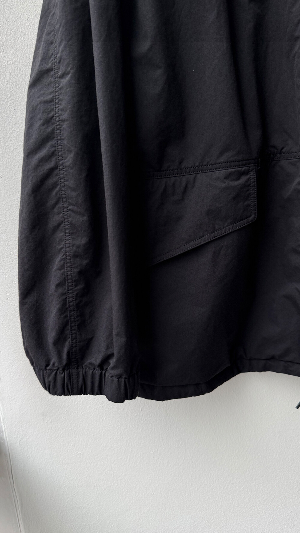 - 소재감과 궁합이 좋은 큰사이즈의 금속 지퍼와 지퍼를 숨기는 식의 프론트 구성. 히든 스냅, 밑단에서는 약간 나오는 조절 끈 등의 무심한 듯한 배치로 러프한 분위기.