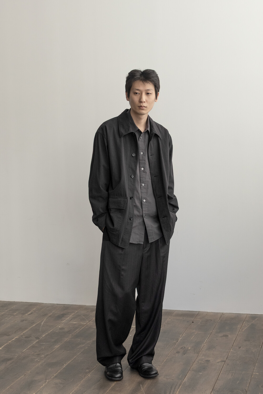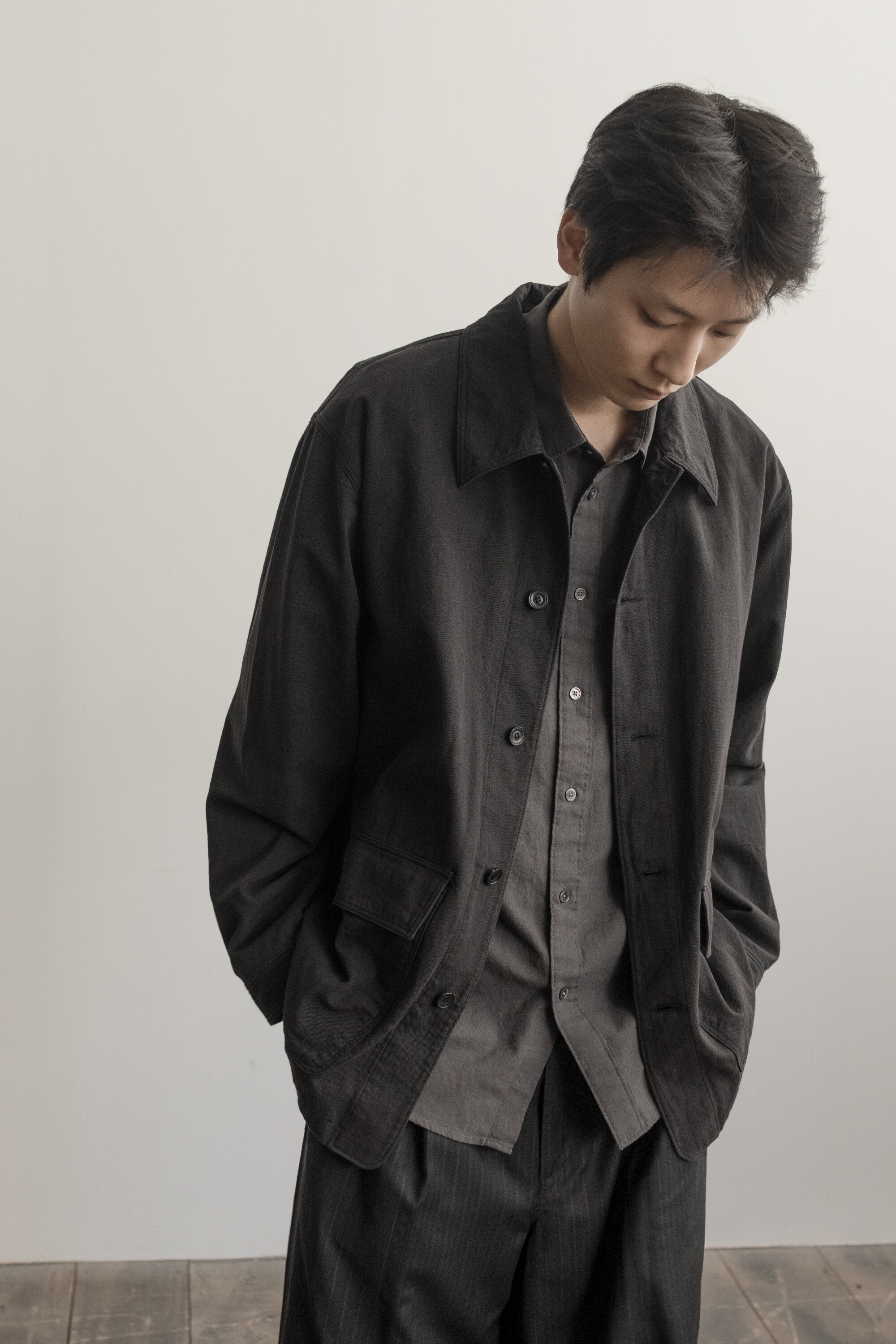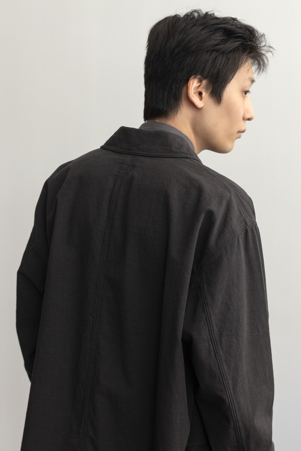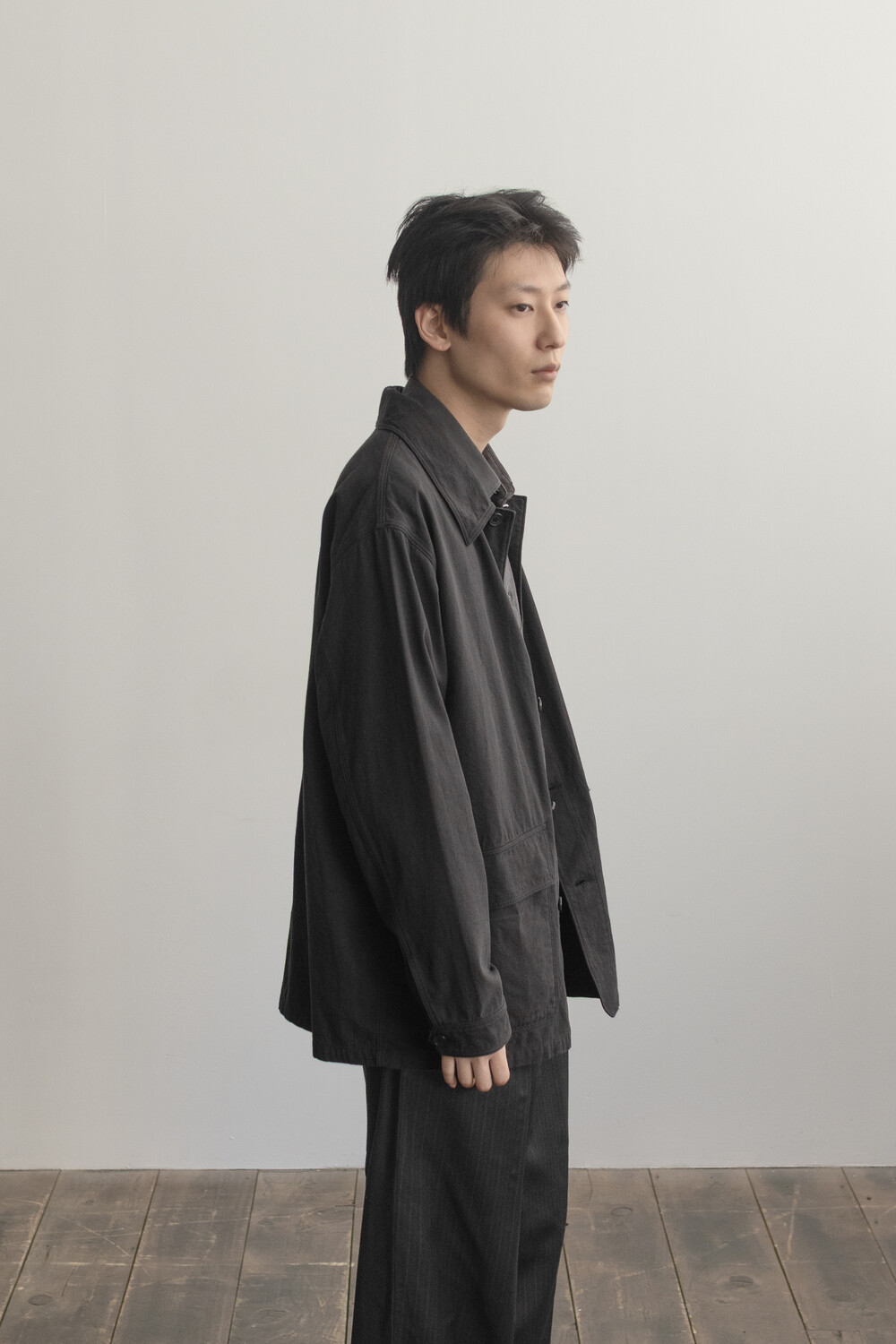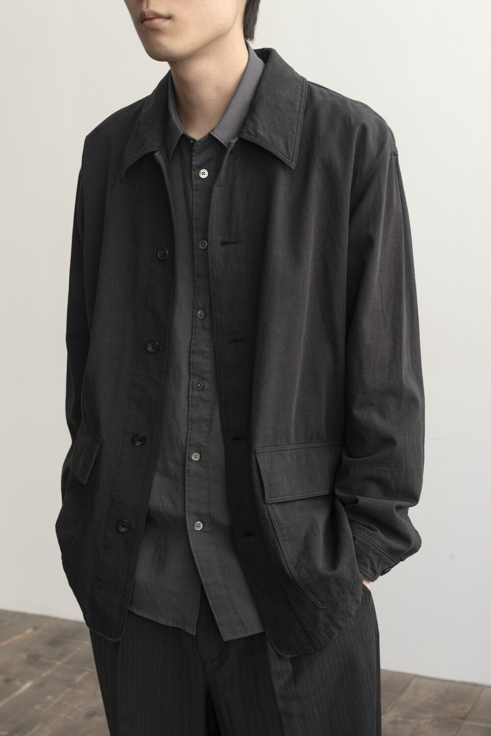 워크 자켓의 맥락에서 이어지는 포켓의 배치와 여밈의 맥락은 가져오되, 일(작업)을 위한 단단하고 고시감 있는 소재와 작업 능률을 위한 저스트한 사이즈감은 덜어냈습니다. 대신 우리가 좋아하는 편안함과 유연함을 중심에 두고, 적당히 여유 있고 차분한 실루엣으로 재구성했습니다.