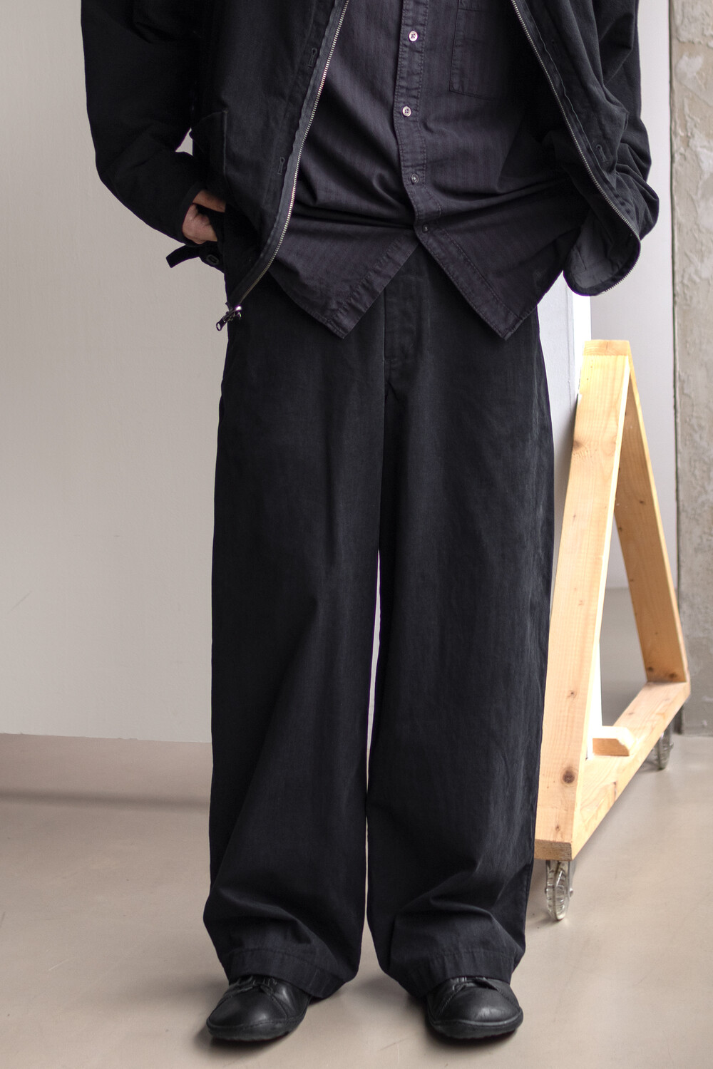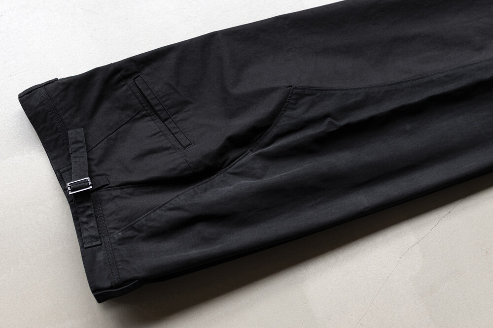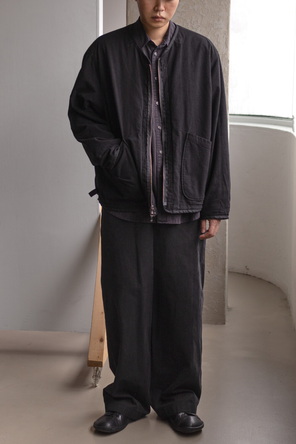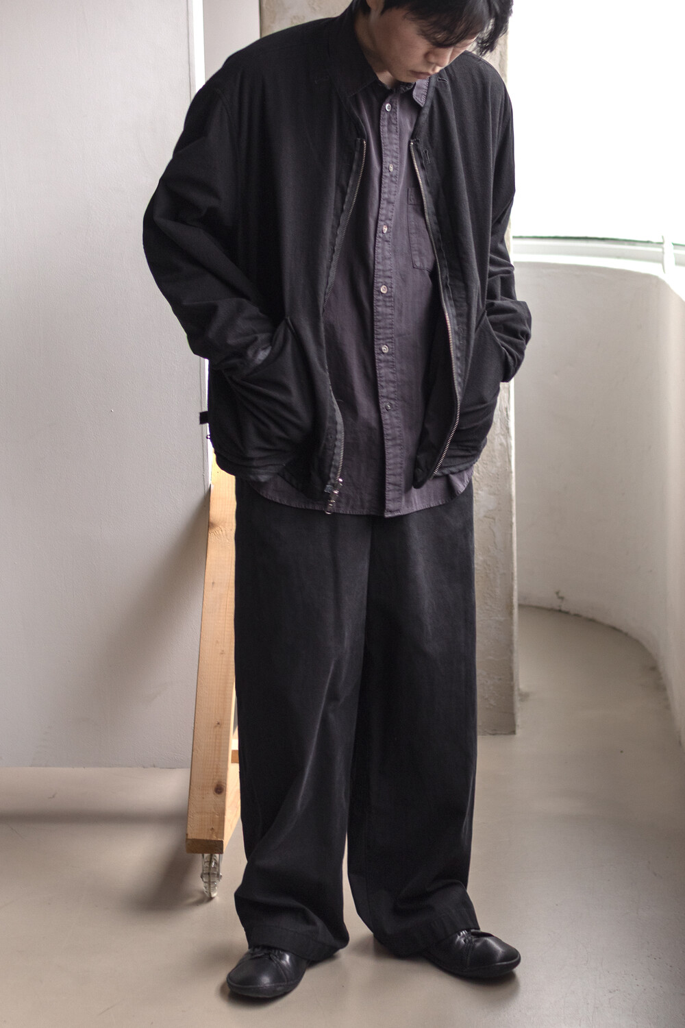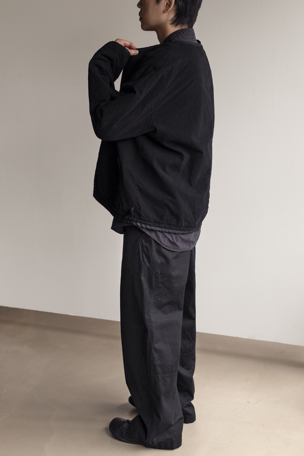 소재는 코튼/레이온이 약 8:2로 짜여진 직물로 코튼 특유의 텍스쳐가 베이스가 되지만, 레이온의 유연함이 있습니다. 적당히 힘이 있으면서 흐르는 실루엣과 편안한 착용감이 입니다. 다시, 앞판의 소재에는 미세하게 피치를 내어 융이 서게 함으로 텍스쳐 배색을 만들었는데 앞단의 구분이 깊어지면서 피셔맨을 찾을 수 있다고 생각합니다.