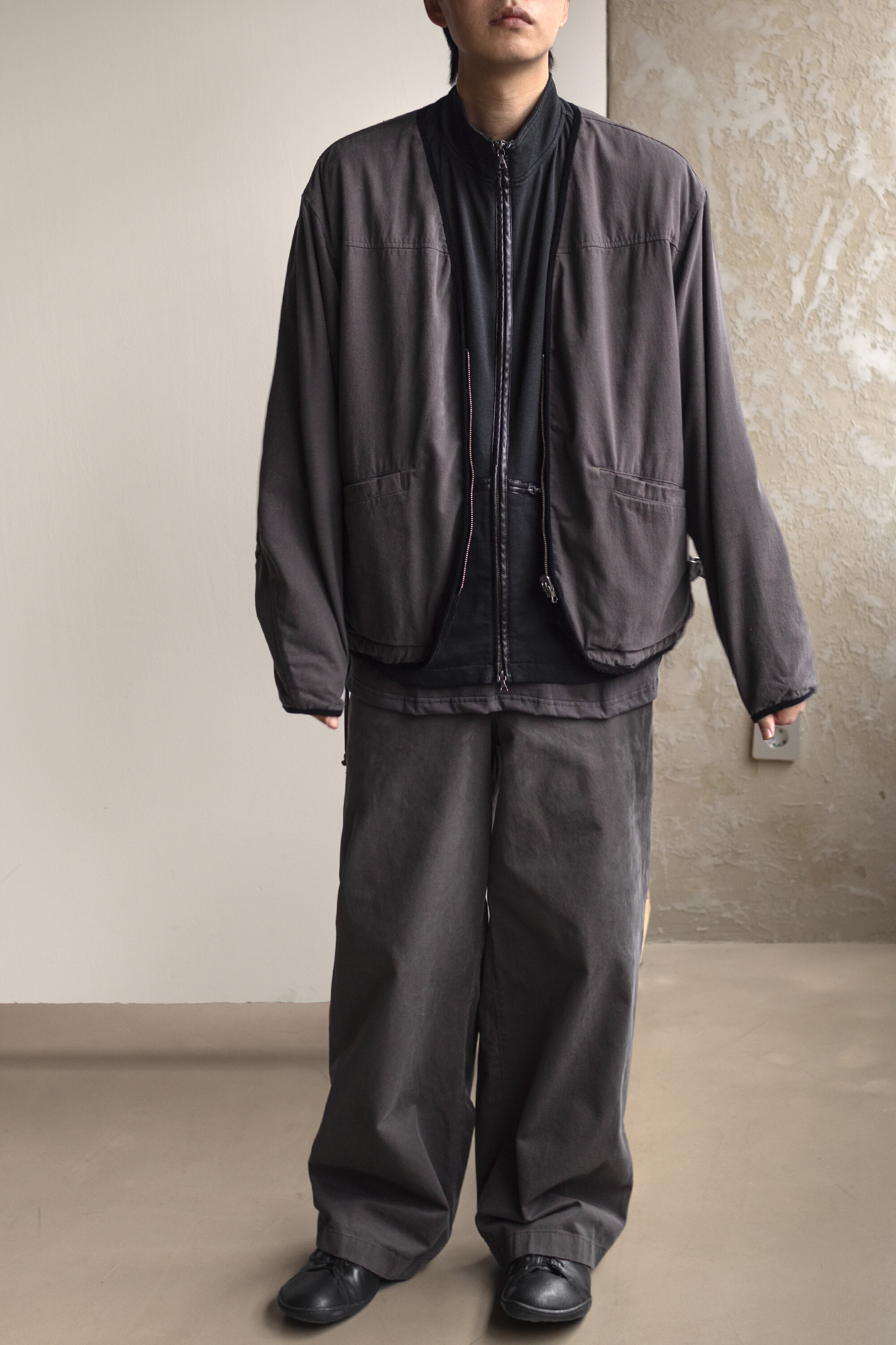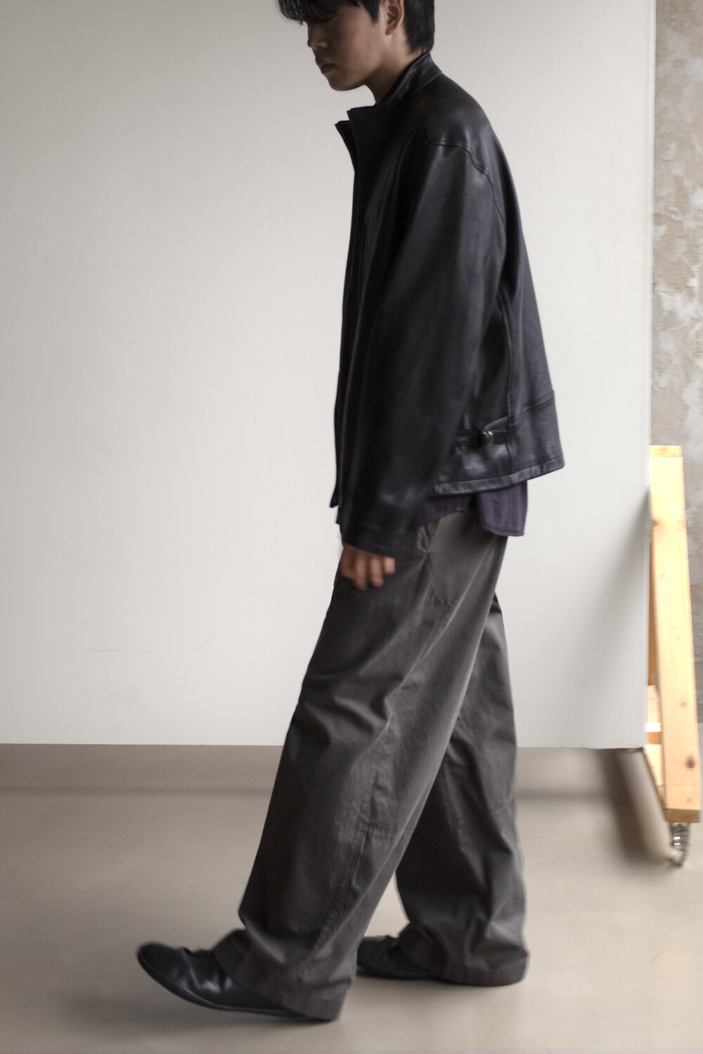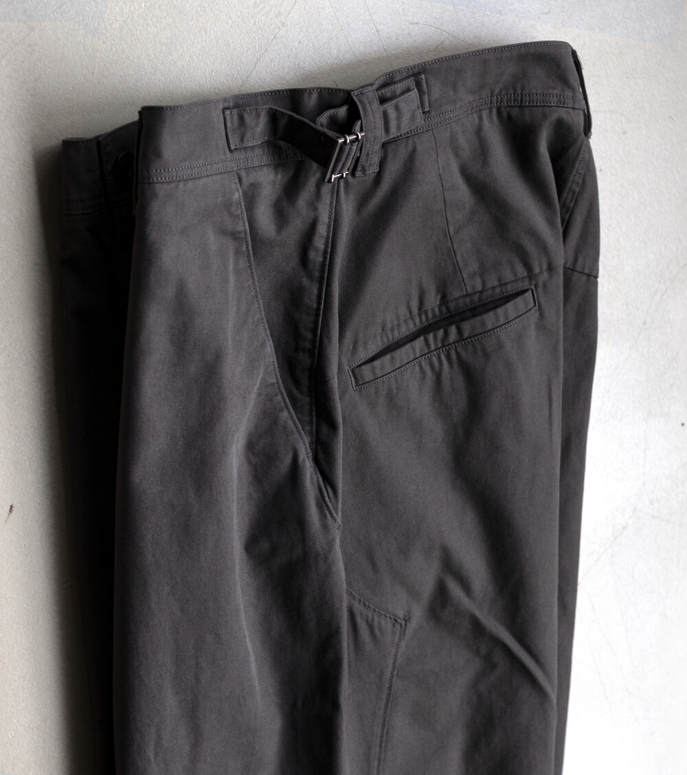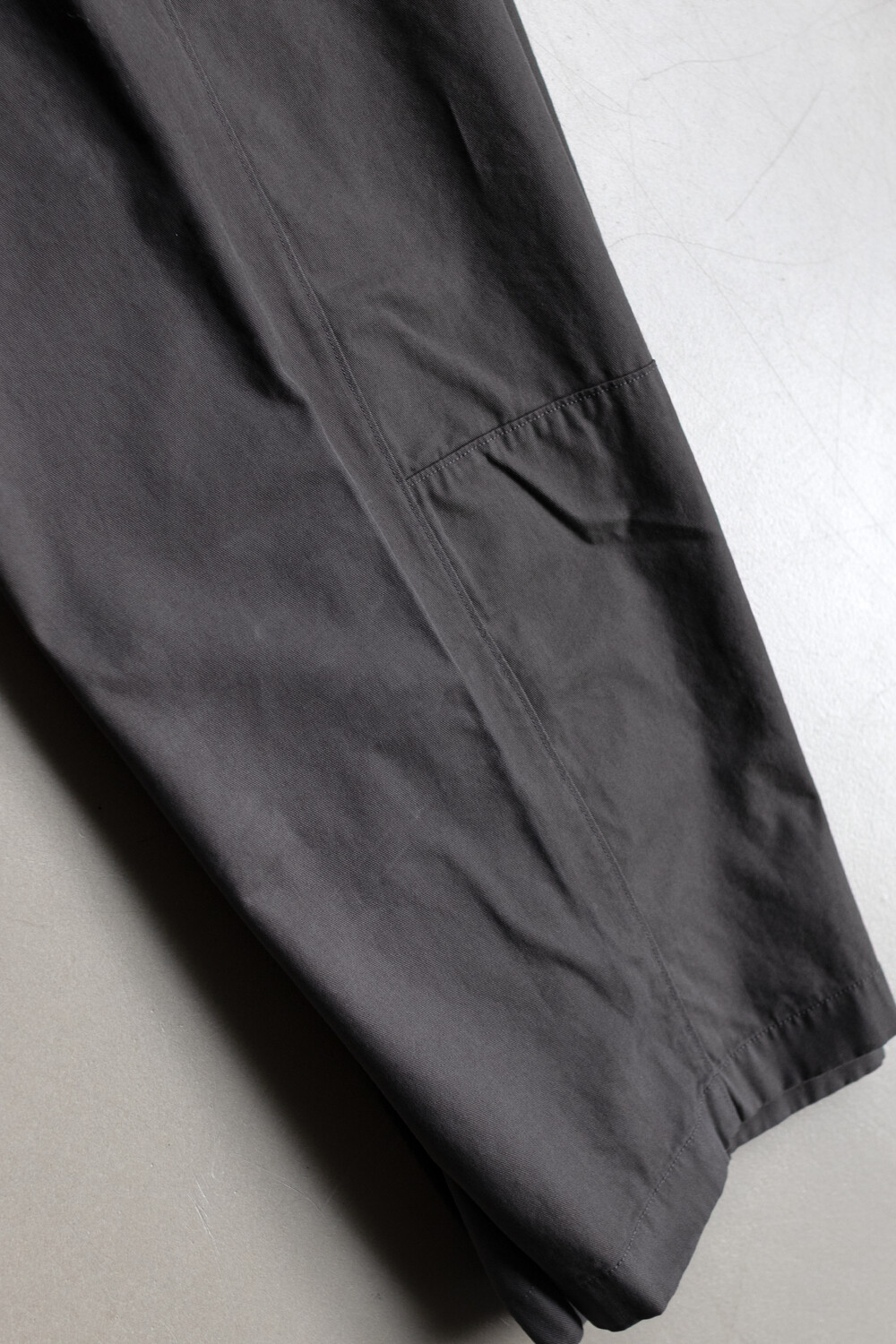 소재는 코튼/레이온이 약 8:2로 짜여진 직물로 코튼 특유의 텍스쳐가 베이스가 되지만, 레이온의 유연함이 있습니다. 적당히 힘이 있으면서 흐르는 실루엣과 편안한 착용감이 입니다. 다시, 앞판의 소재에는 미세하게 피치를 내어 융이 서게 함으로 텍스쳐 배색을 만들었는데 앞단의 구분이 깊어지면서 피셔맨을 찾을 수 있다고 생각합니다.