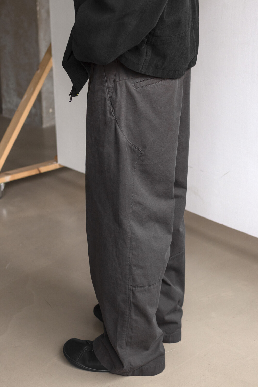 이런 연상을 토대로. 주머니와 이어지는 것처럼 보이는 아웃심이 뒷판으로 넘어가 앞/뒤의 구분을 만들고