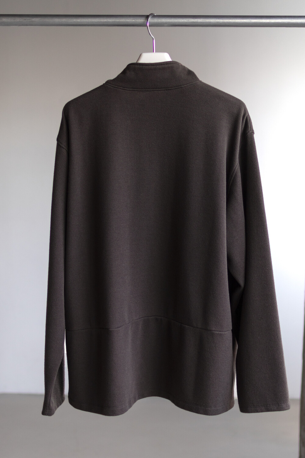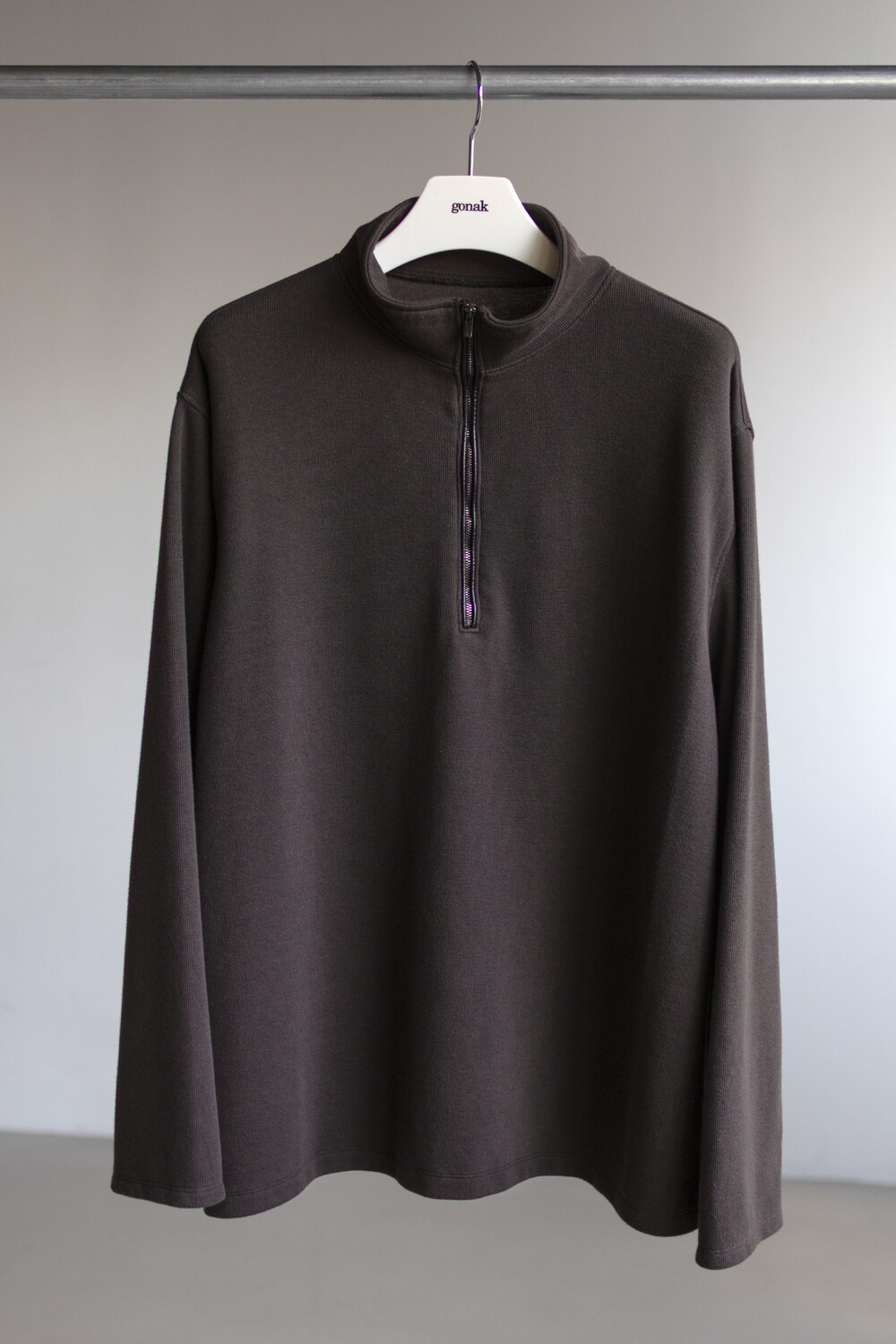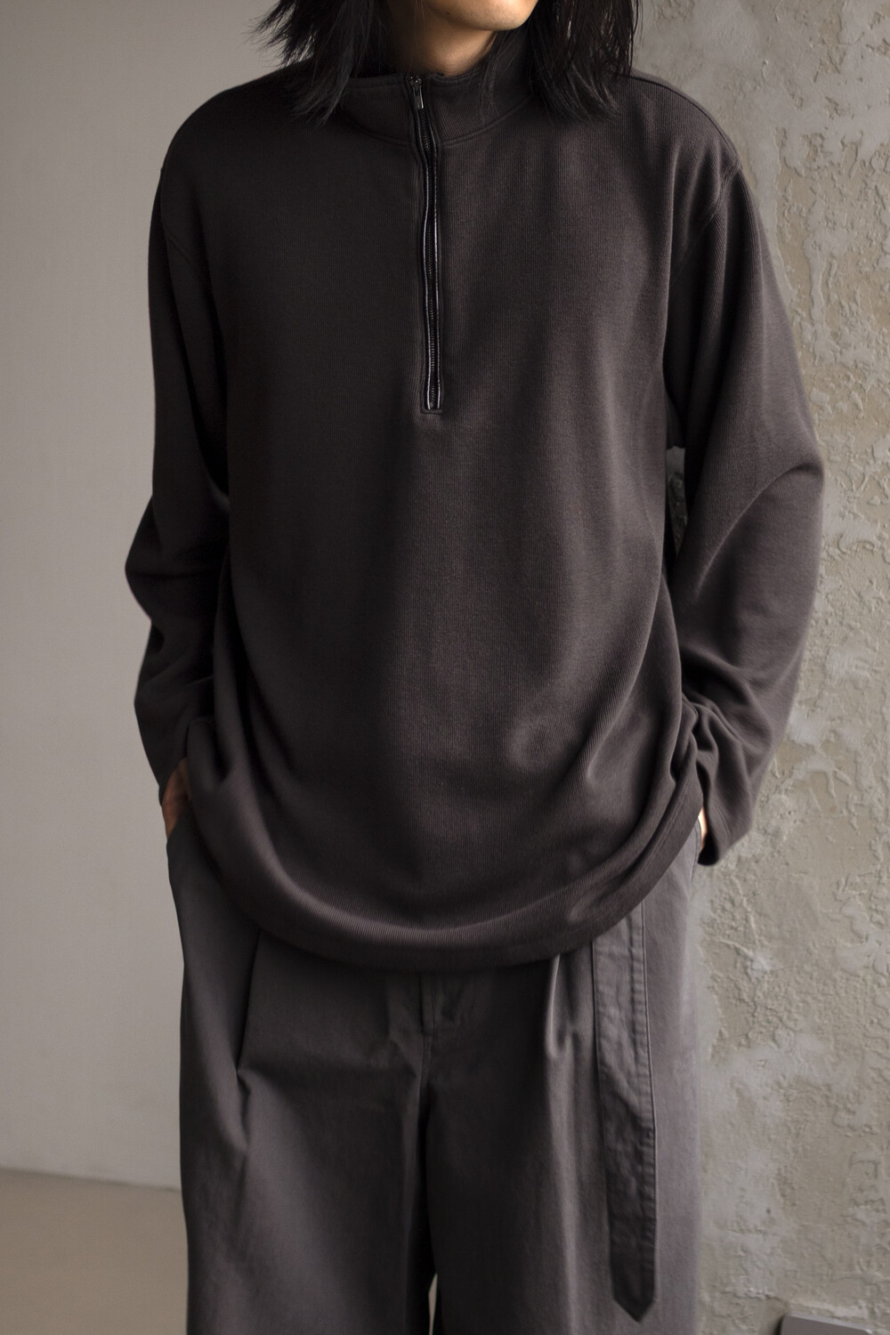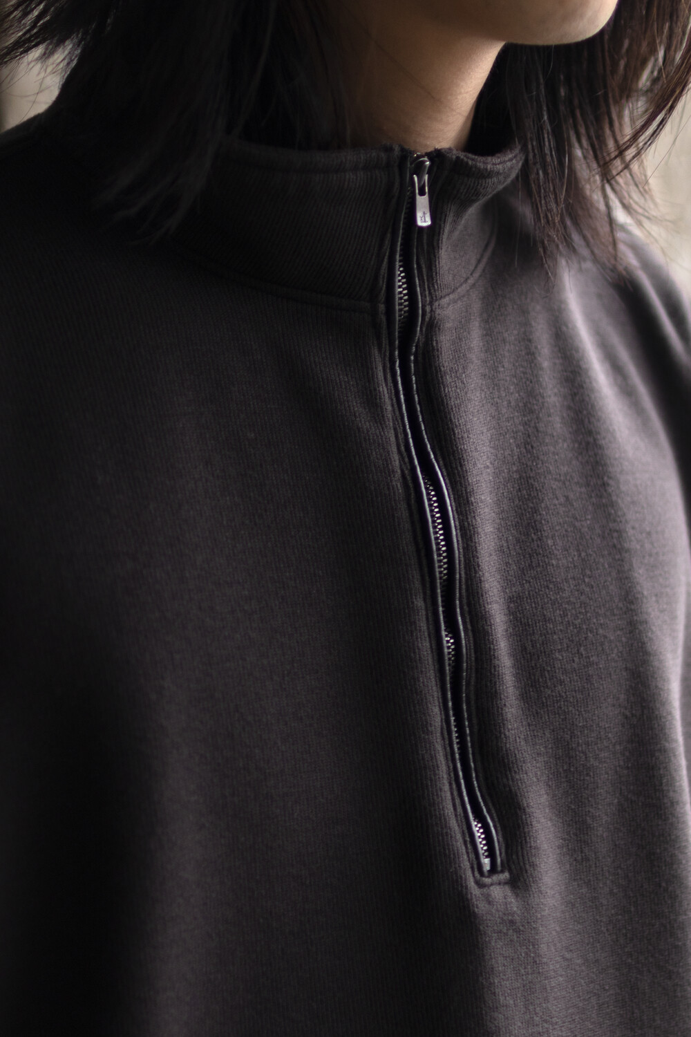 하프 집 풀오버를 베이스로 지퍼 양단에 텍스쳐 배색을 주는 트리밍이 설치된 <half zip up>입니다.