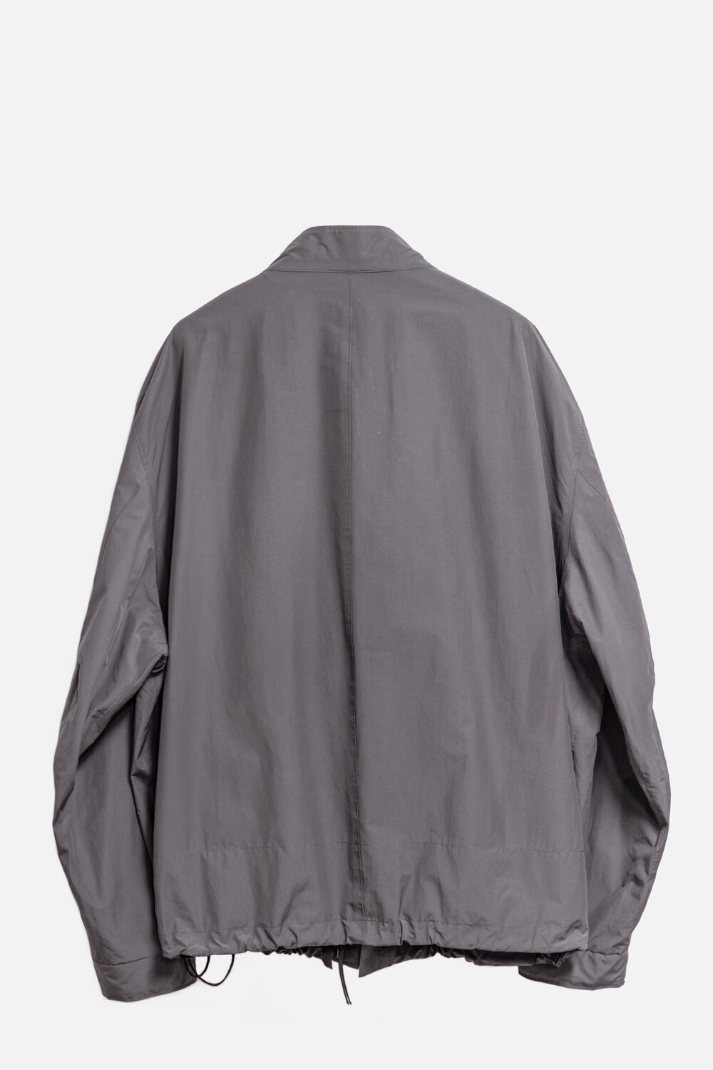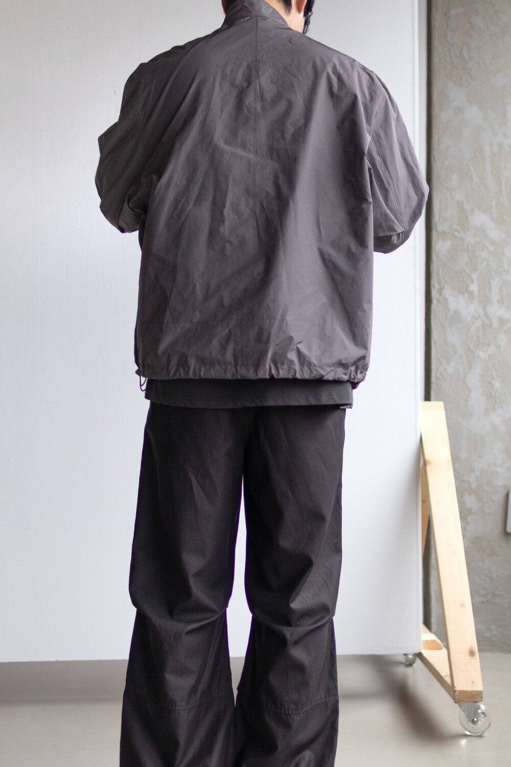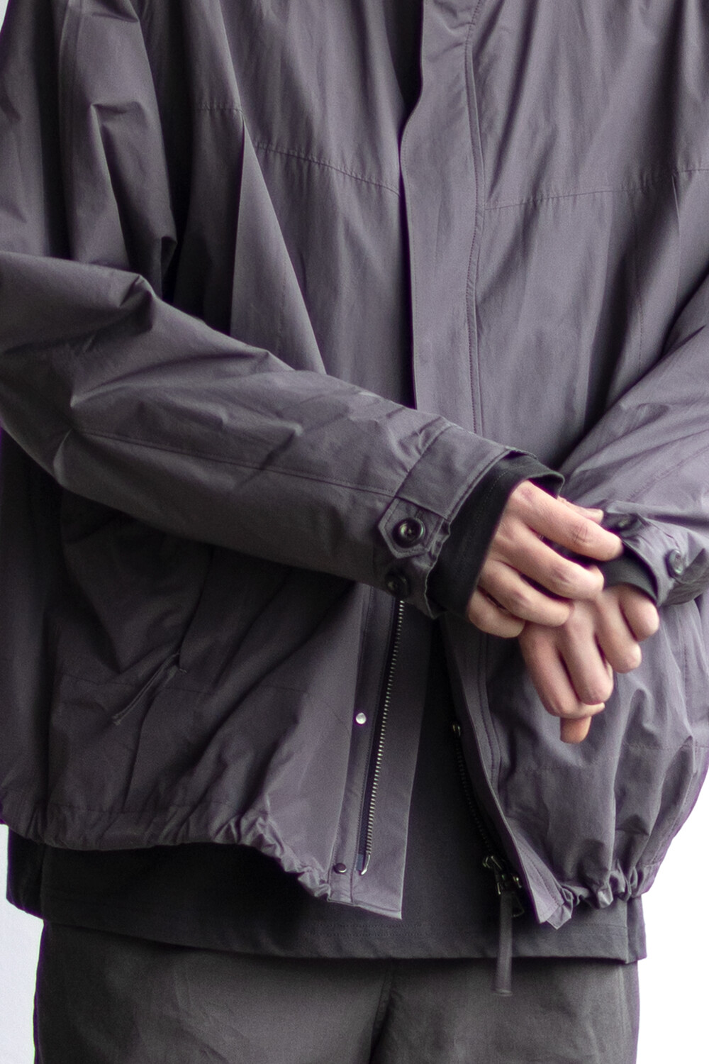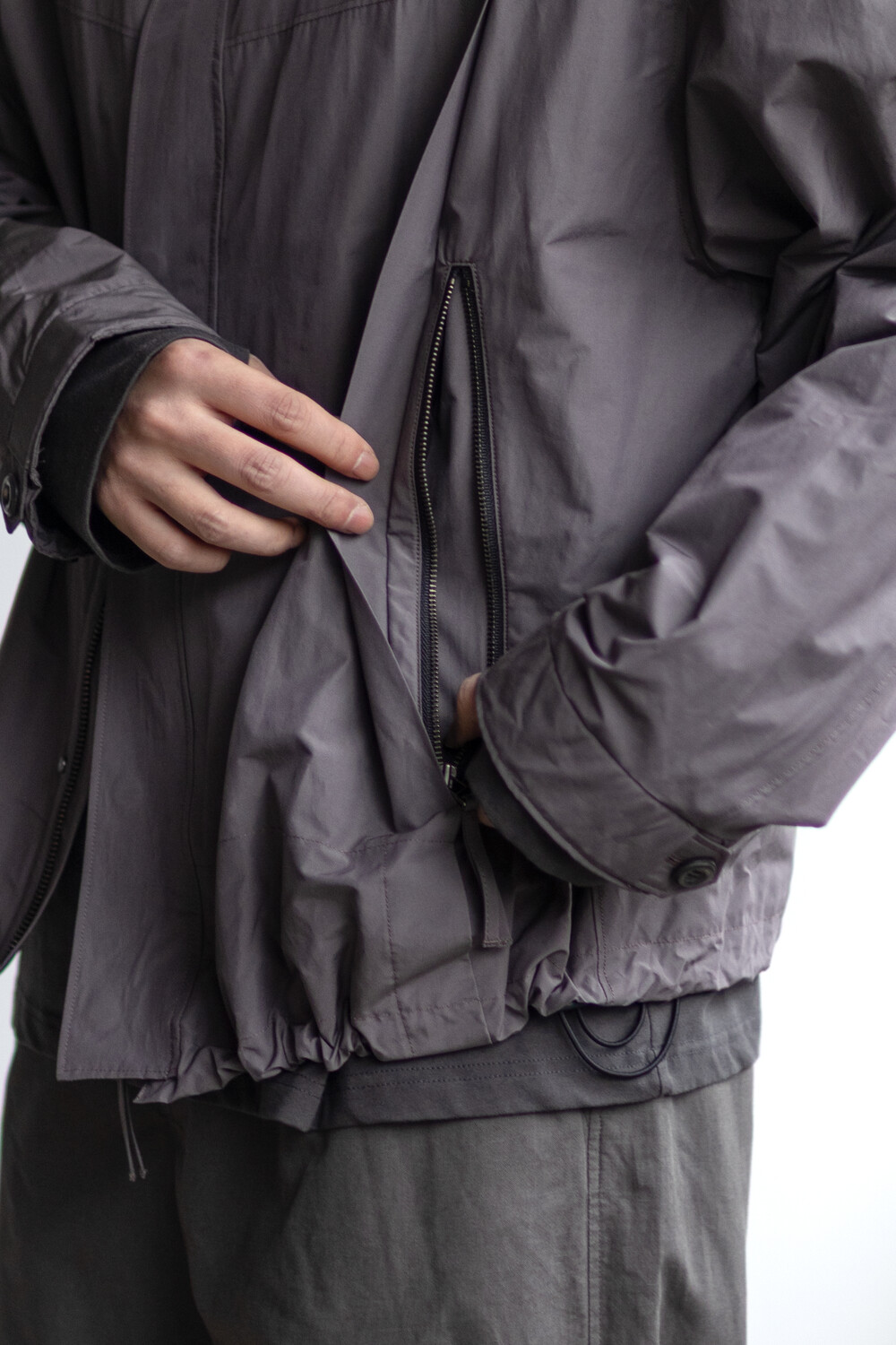 여유있는 품과 함께 깊은 넥라인, 앞판의 주머니를 감춘 겹침분, 소매의 턱 분량, 스트링 조임 분량이 가볍고 유연한 소재와 만나 자연스럽고 유려한 실루엣을 형성합니다.
