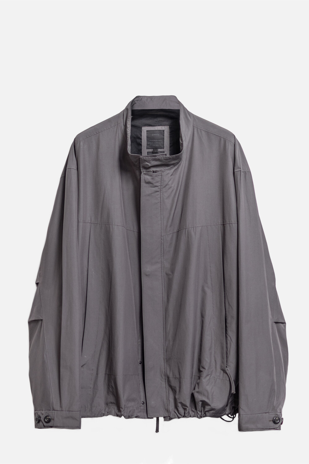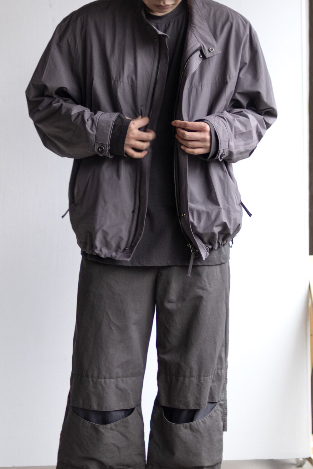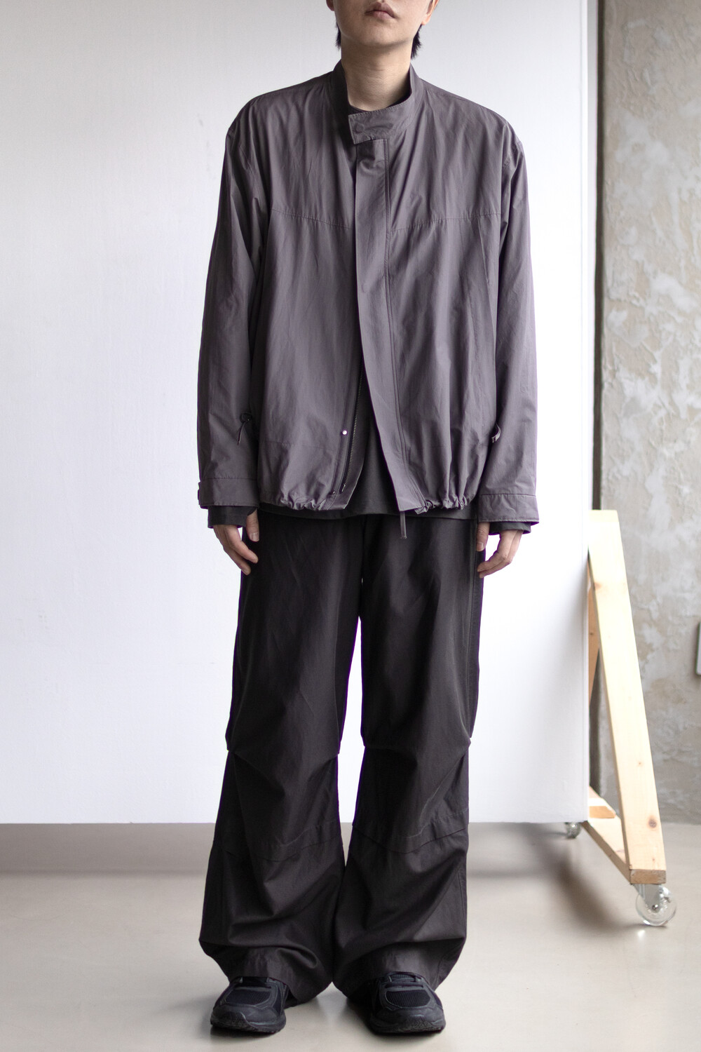 여유있는 품과 함께 깊은 넥라인, 앞판의 주머니를 감춘 겹침분, 소매의 턱 분량, 스트링 조임 분량이 가볍고 유연한 소재와 만나 자연스럽고 유려한 실루엣을 형성합니다.
