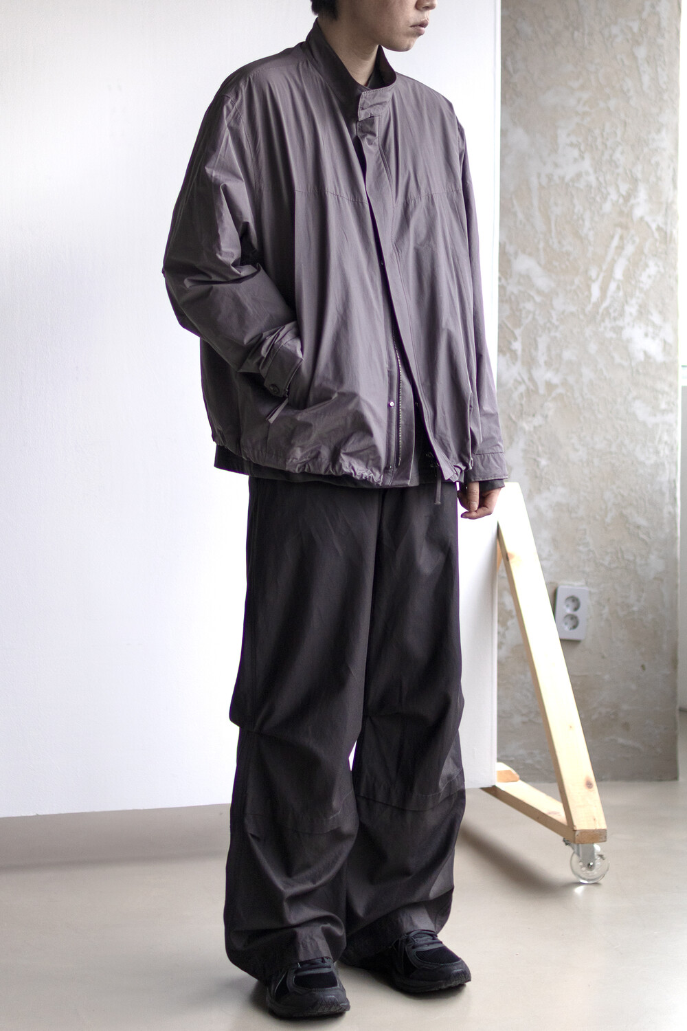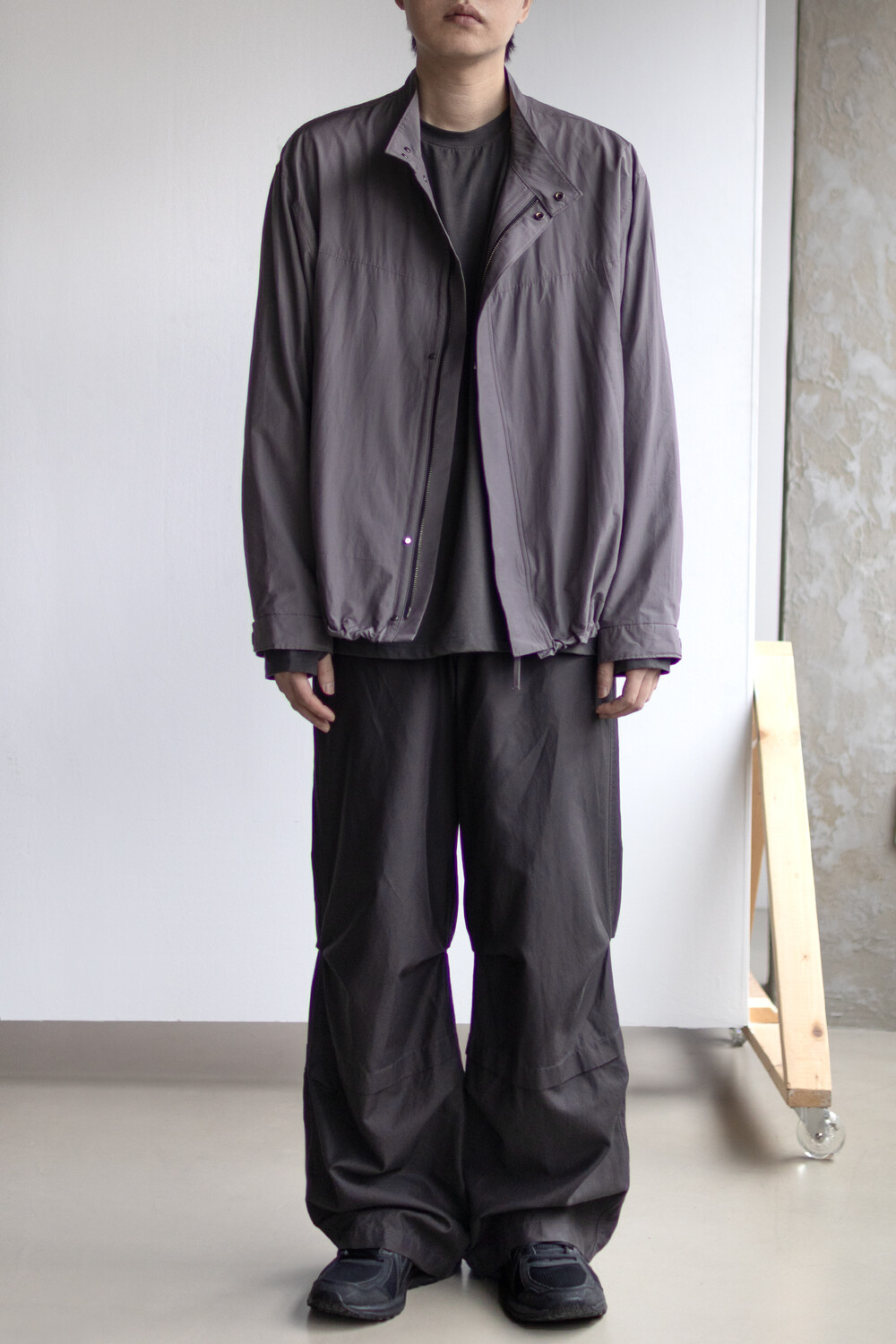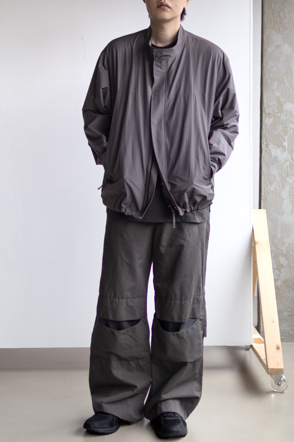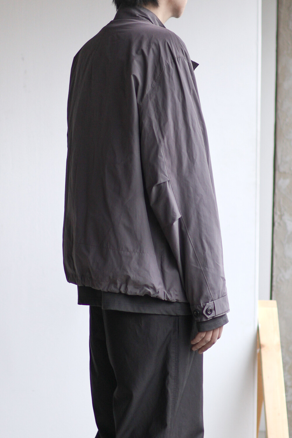 여유있는 품과 함께 깊은 넥라인, 앞판의 주머니를 감춘 겹침분, 소매의 턱 분량, 스트링 조임 분량이 가볍고 유연한 소재와 만나 자연스럽고 유려한 실루엣을 형성합니다.
