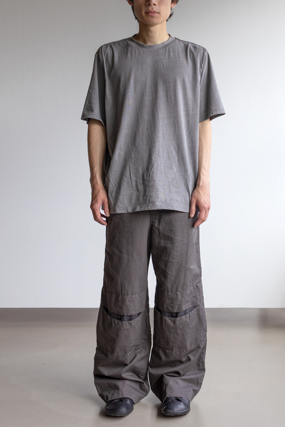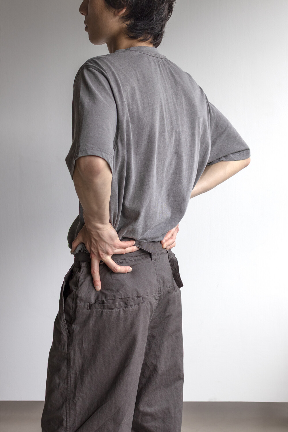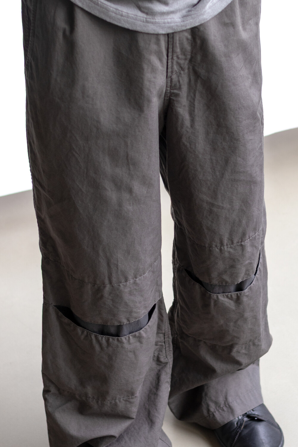 열리는 무릎단을 중심으로, 흐르는 실루엣. 자연스러운 퍼커링에 중점을 둔 <오픈 니 팬츠>입니다.