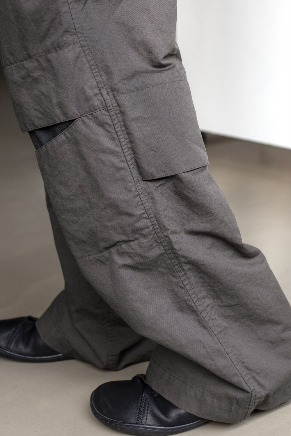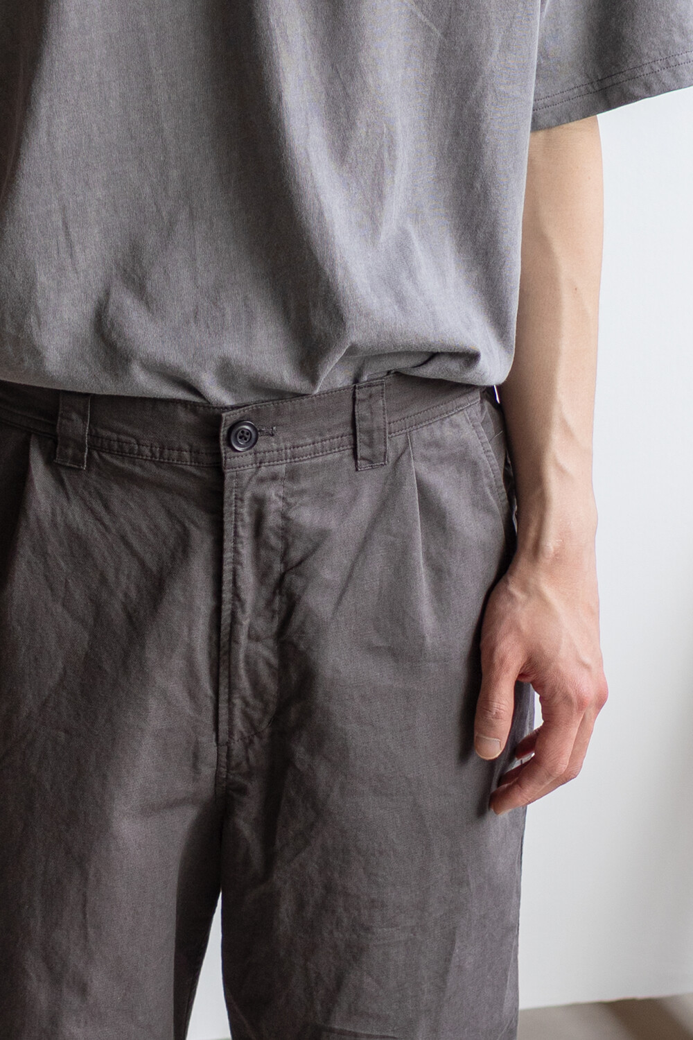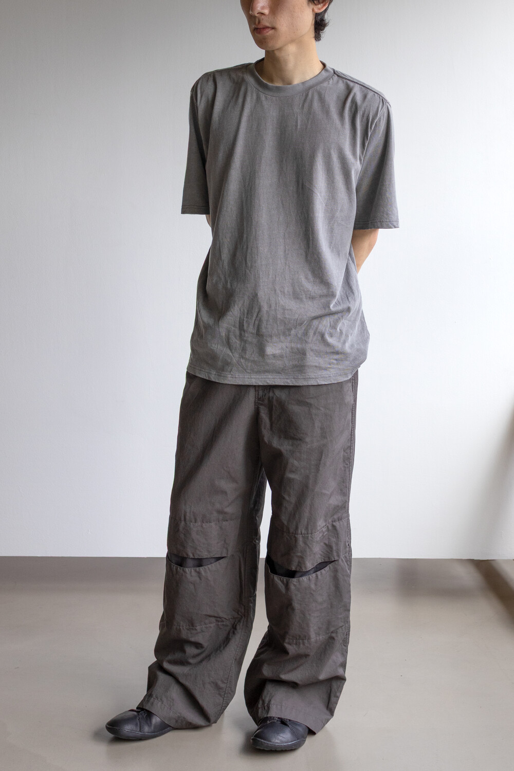 열리는 무릎단을 중심으로, 흐르는 실루엣. 자연스러운 퍼커링에 중점을 둔 <오픈 니 팬츠>입니다.