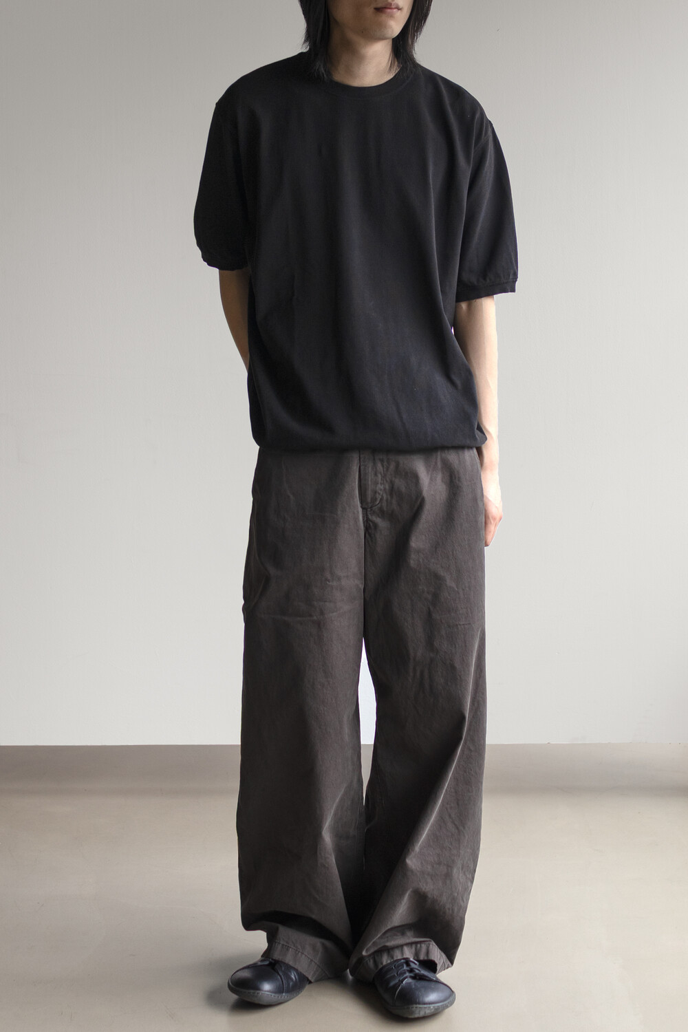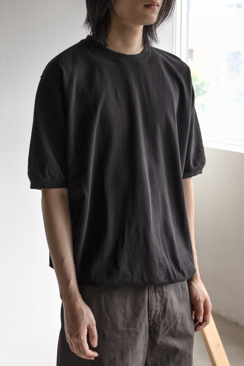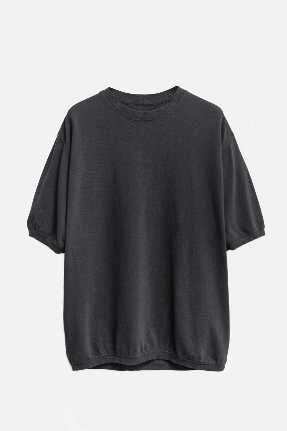 20수 피케 원단을 베이스로 넥/소매/밑단에 립을 설치, 가먼트 다잉으로 깊이 있는 색을 입힌 <pique round sleeve>입니다. 니트류 준비 중에 여름 시즌 더 쾌적하고 관리가 편한 쪽으로 중점을 두게 되어 니트 → 피케 조직으로 제작했습니다.
