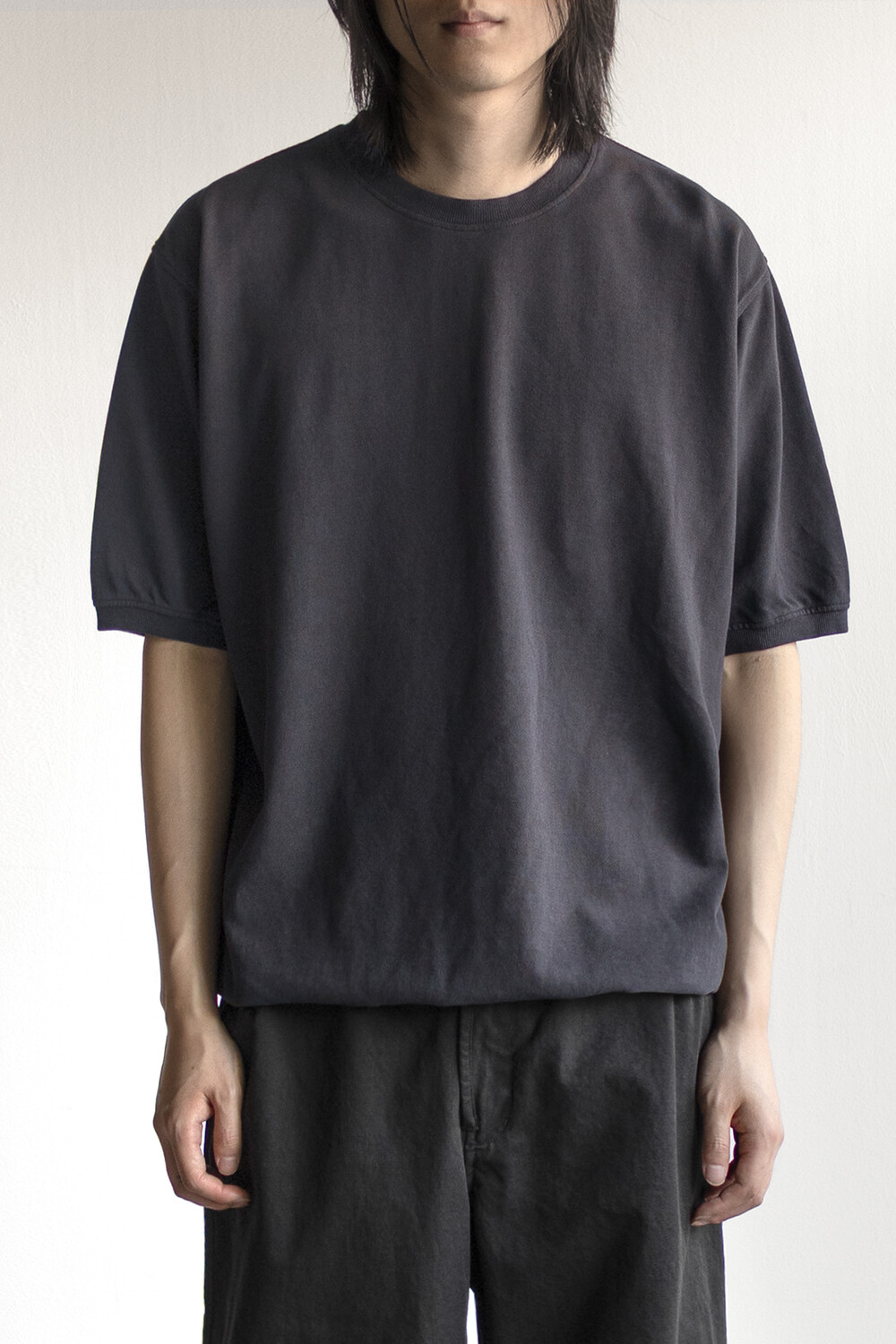 20수 피케 원단을 베이스로 넥/소매/밑단에 립을 설치, 가먼트 다잉으로 깊이 있는 색을 입힌 <pique round sleeve>입니다. 니트류 준비 중에 여름 시즌 더 쾌적하고 관리가 편한 쪽으로 중점을 두게 되어 니트 → 피케 조직으로 제작했습니다.