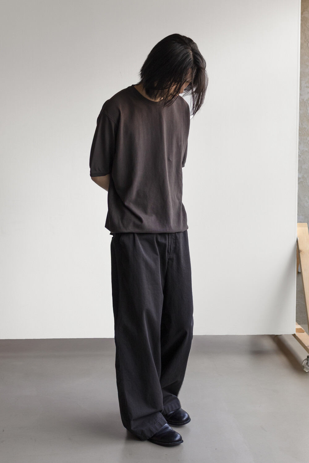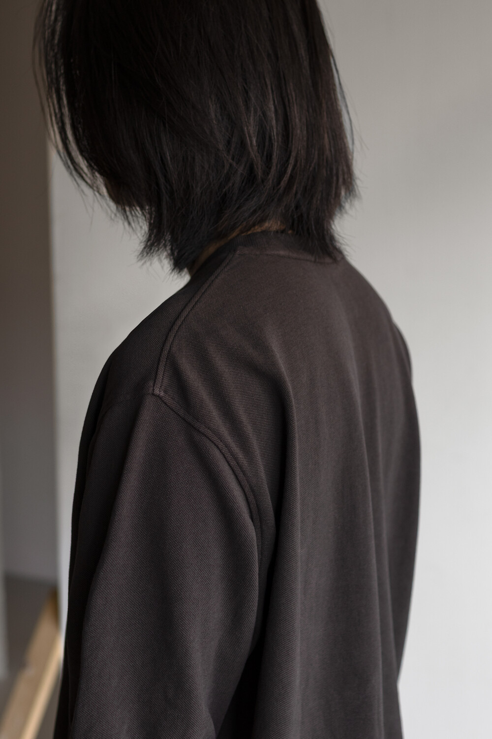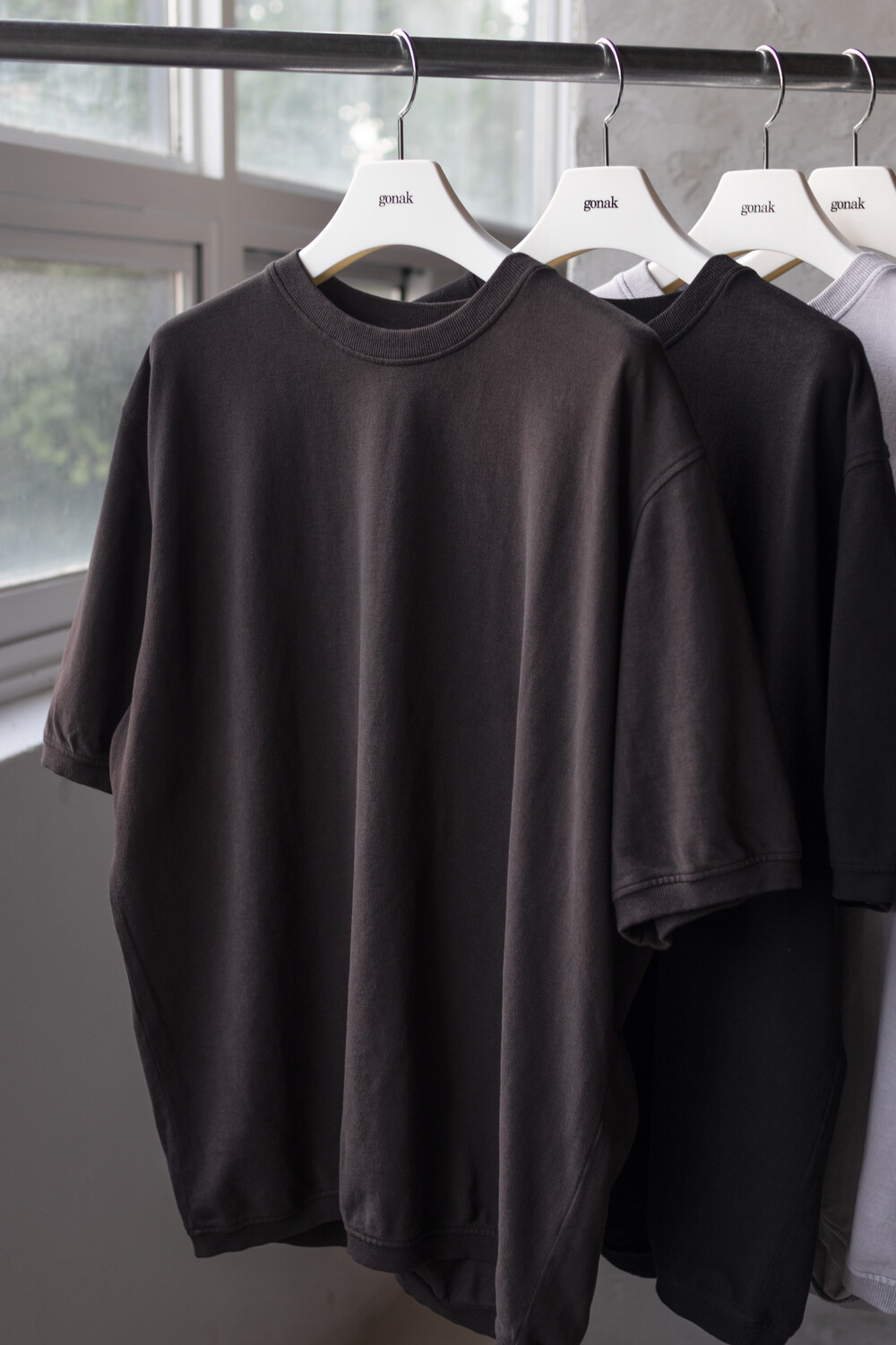 20수 피케 원단을 베이스로 넥/소매/밑단에 립을 설치, 가먼트 다잉으로 깊이 있는 색을 입힌 <pique round sleeve>입니다. 니트류 준비 중에 여름 시즌 더 쾌적하고 관리가 편한 쪽으로 중점을 두게 되어 니트 → 피케 조직으로 제작했습니다.