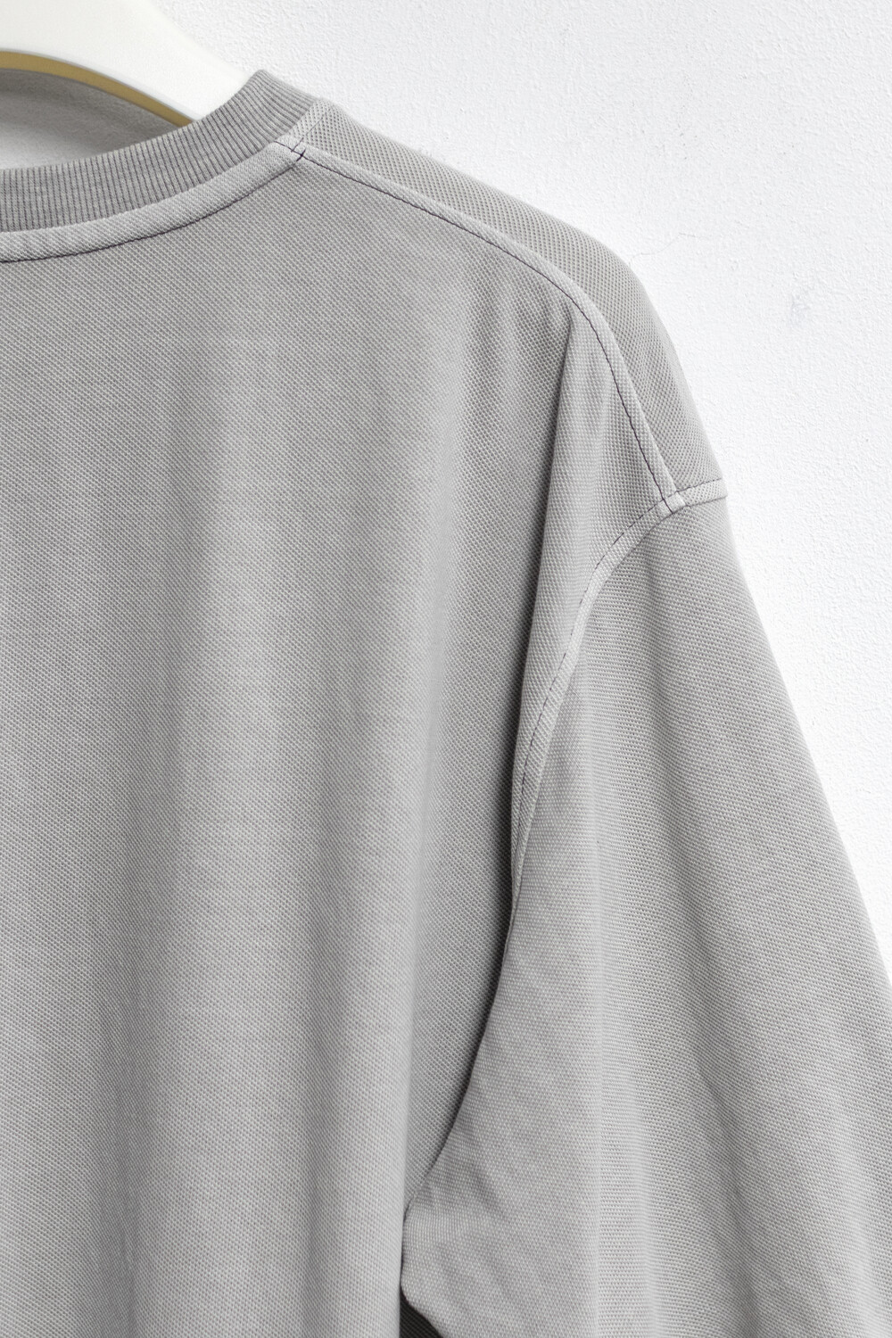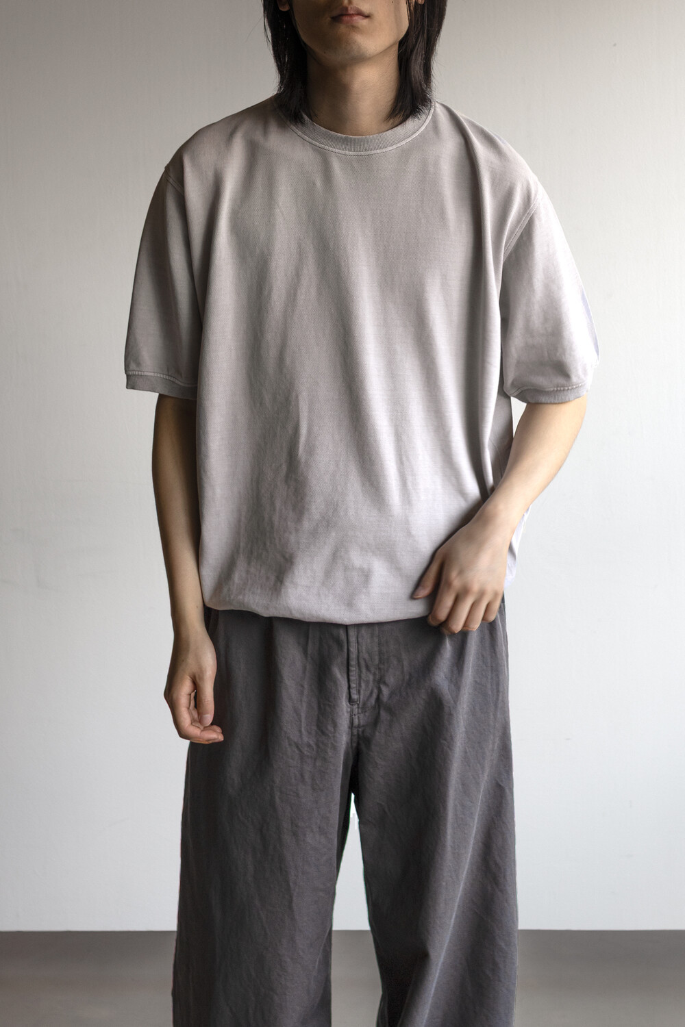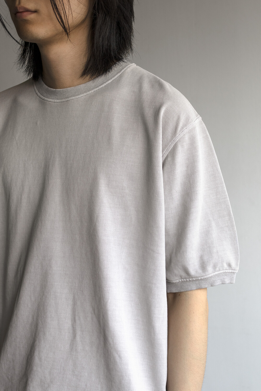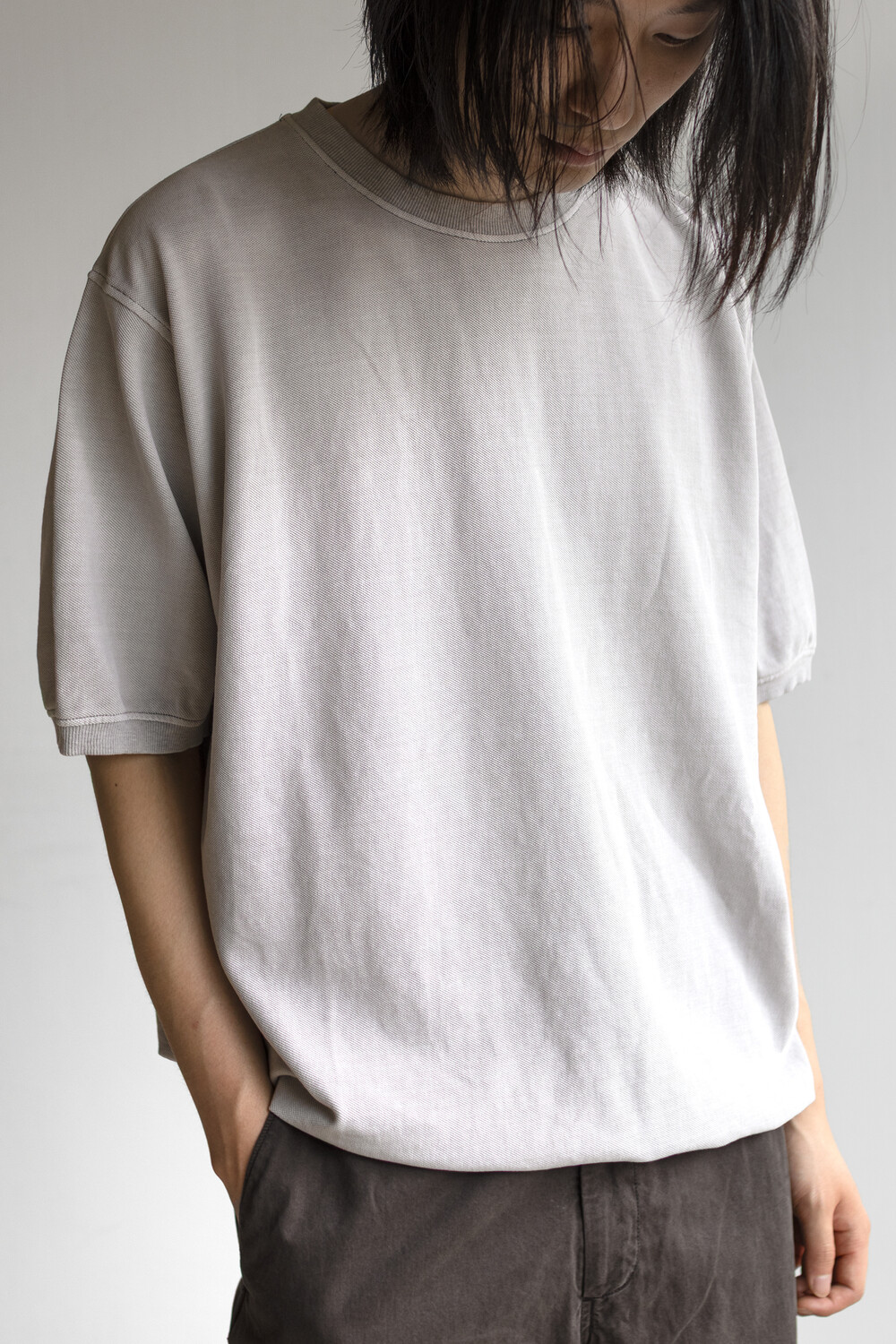 20수 피케 원단을 베이스로 넥/소매/밑단에 립을 설치, 가먼트 다잉으로 깊이 있는 색을 입힌 <pique round sleeve>입니다. 니트류 준비 중에 여름 시즌 더 쾌적하고 관리가 편한 쪽으로 중점을 두게 되어 니트 → 피케 조직으로 제작했습니다.