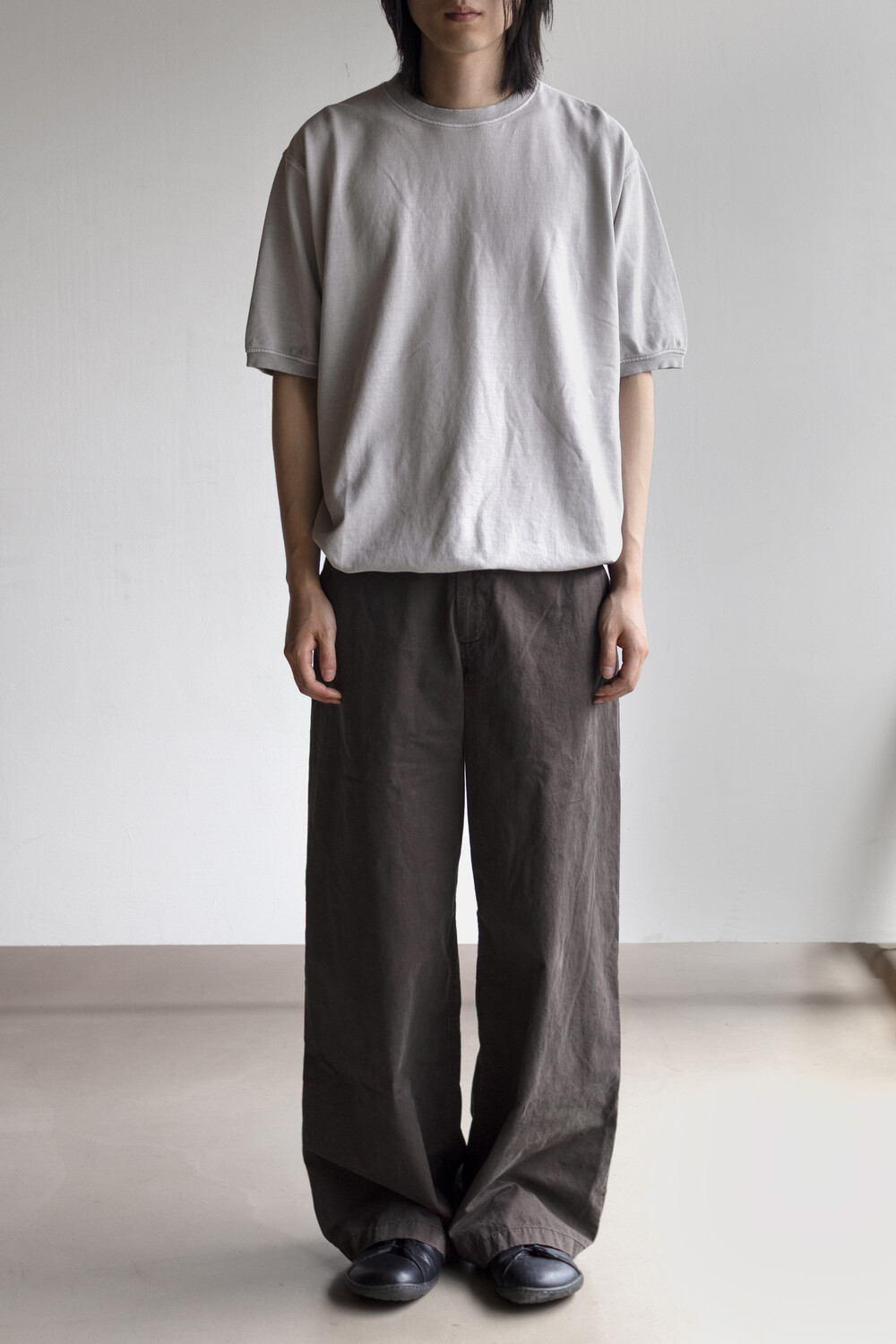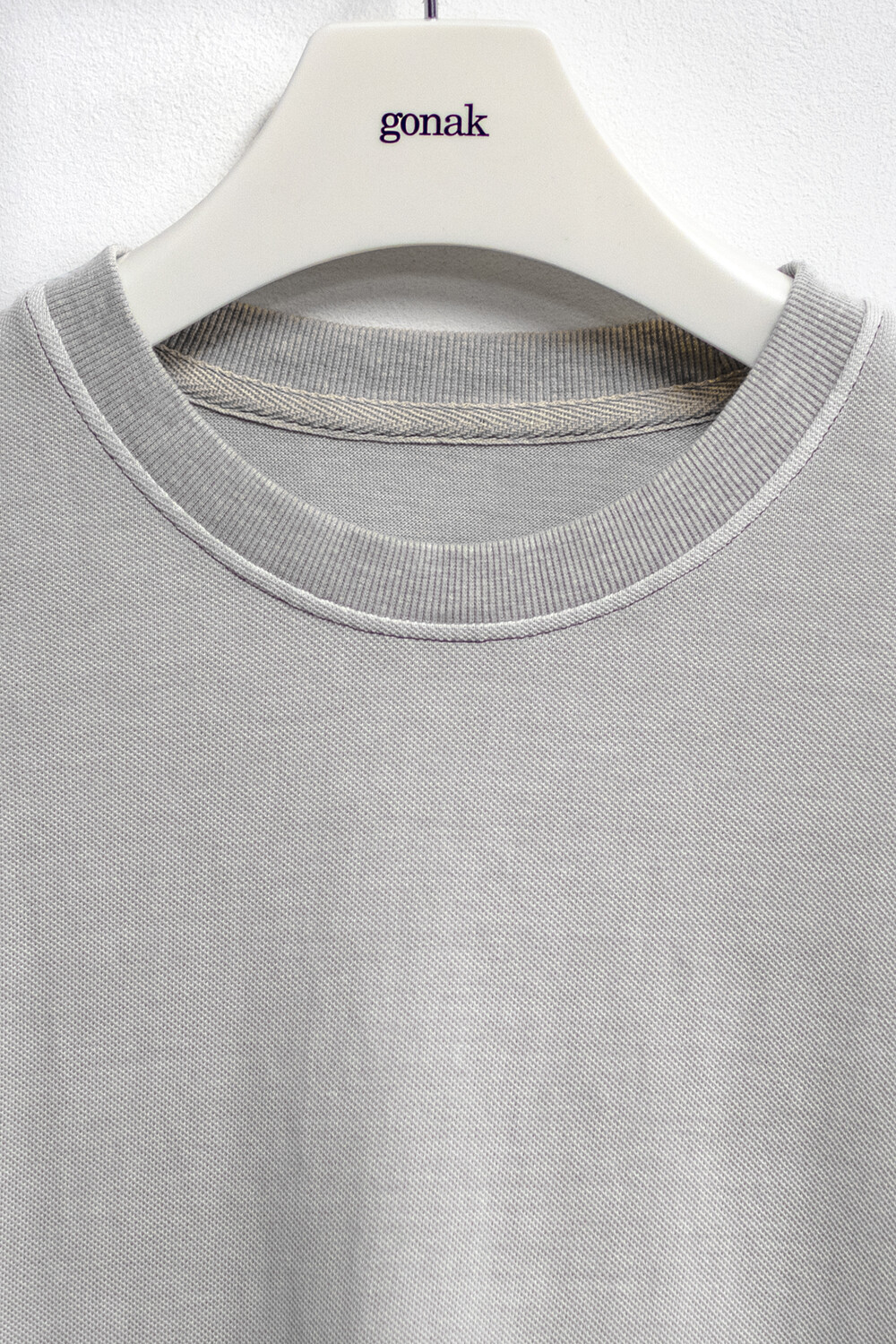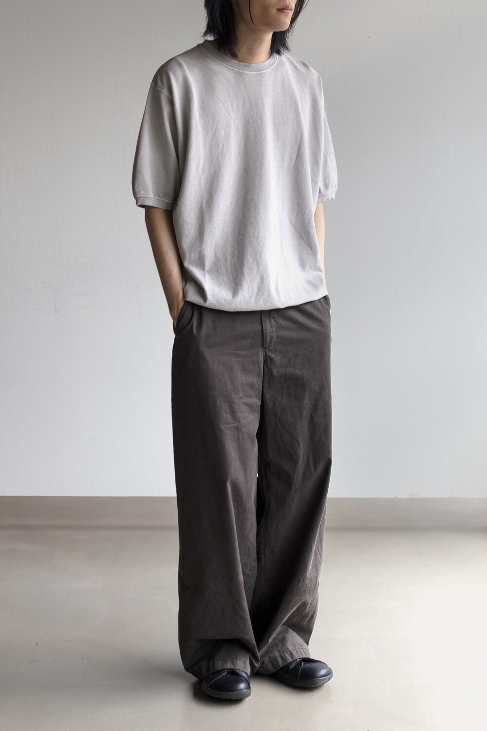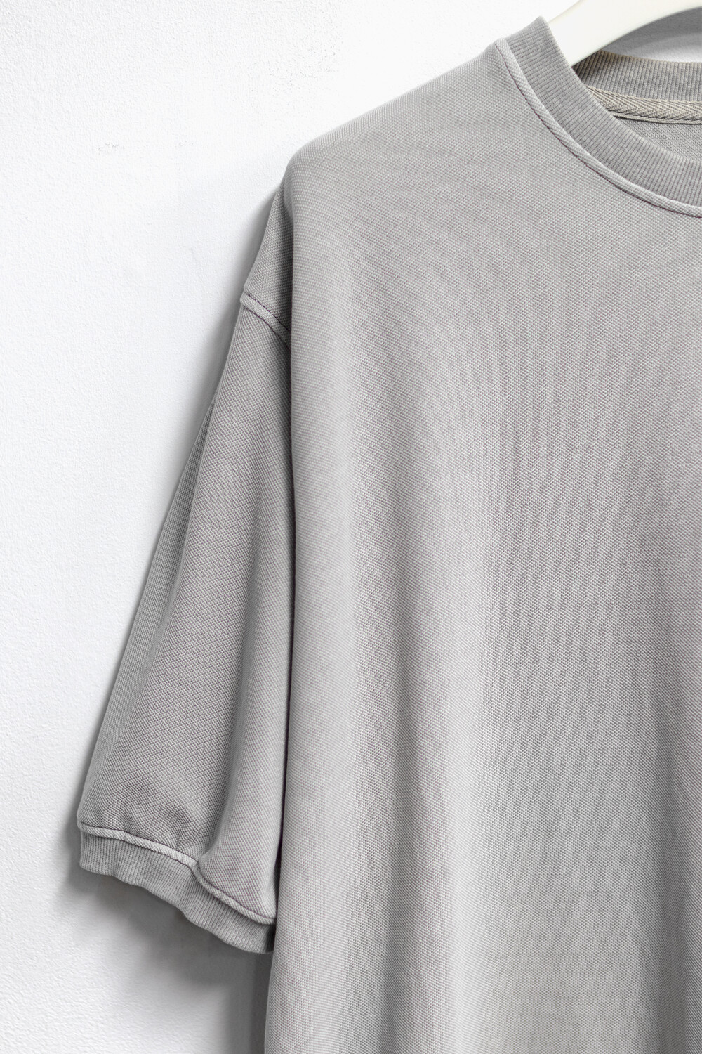 20수 피케 원단을 베이스로 넥/소매/밑단에 립을 설치, 가먼트 다잉으로 깊이 있는 색을 입힌 <pique round sleeve>입니다. 니트류 준비 중에 여름 시즌 더 쾌적하고 관리가 편한 쪽으로 중점을 두게 되어 니트 → 피케 조직으로 제작했습니다.