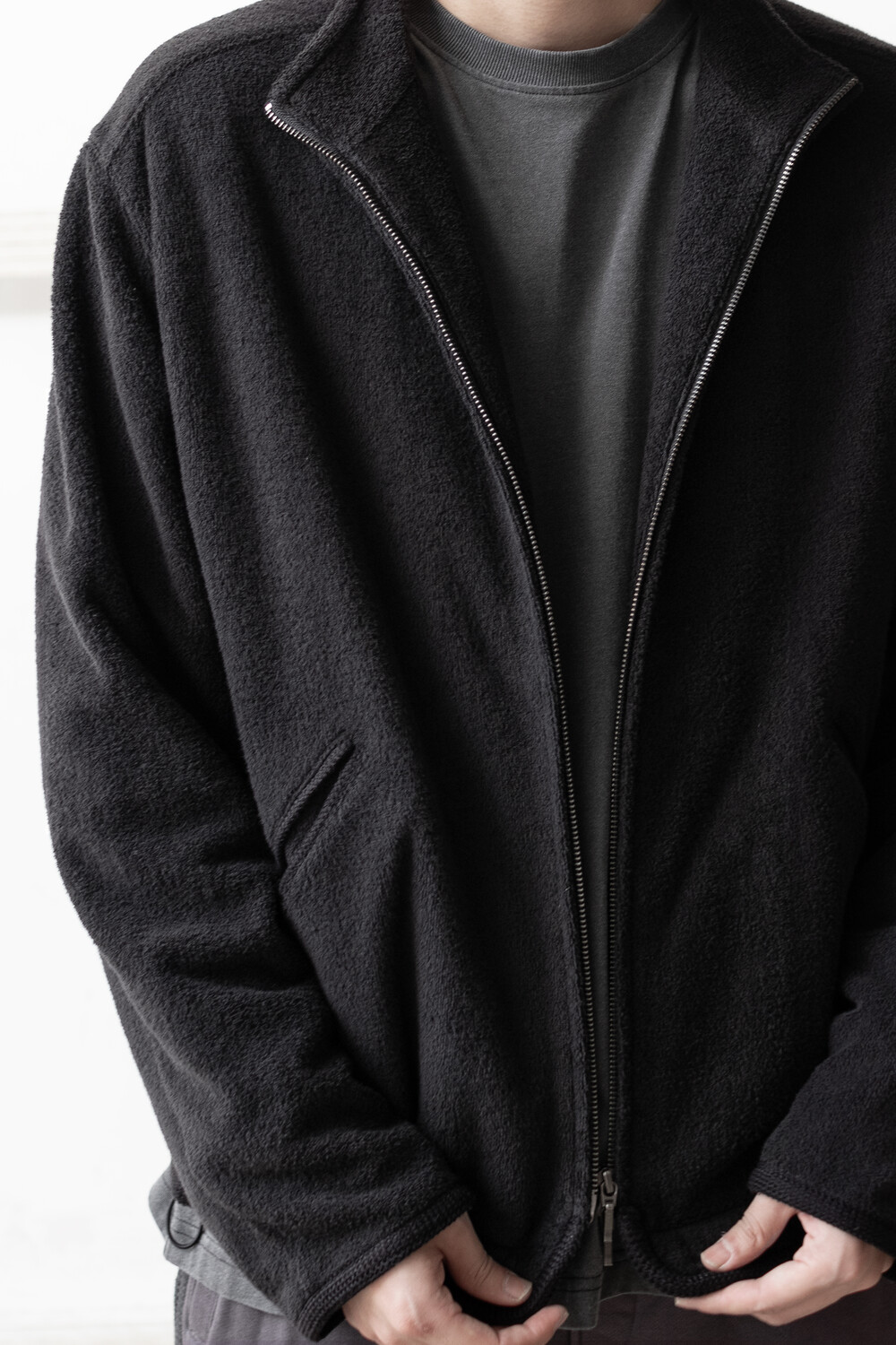 매트한 양기모 면테리 조직과 소매/밑단과 주머니 부위에 원단 배색을 준 <테리 집업 자켓>입니다.