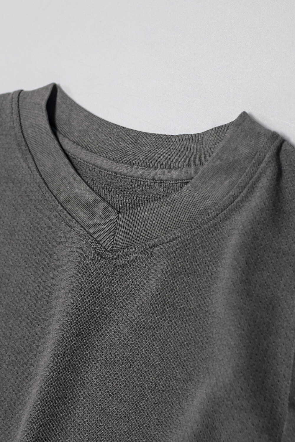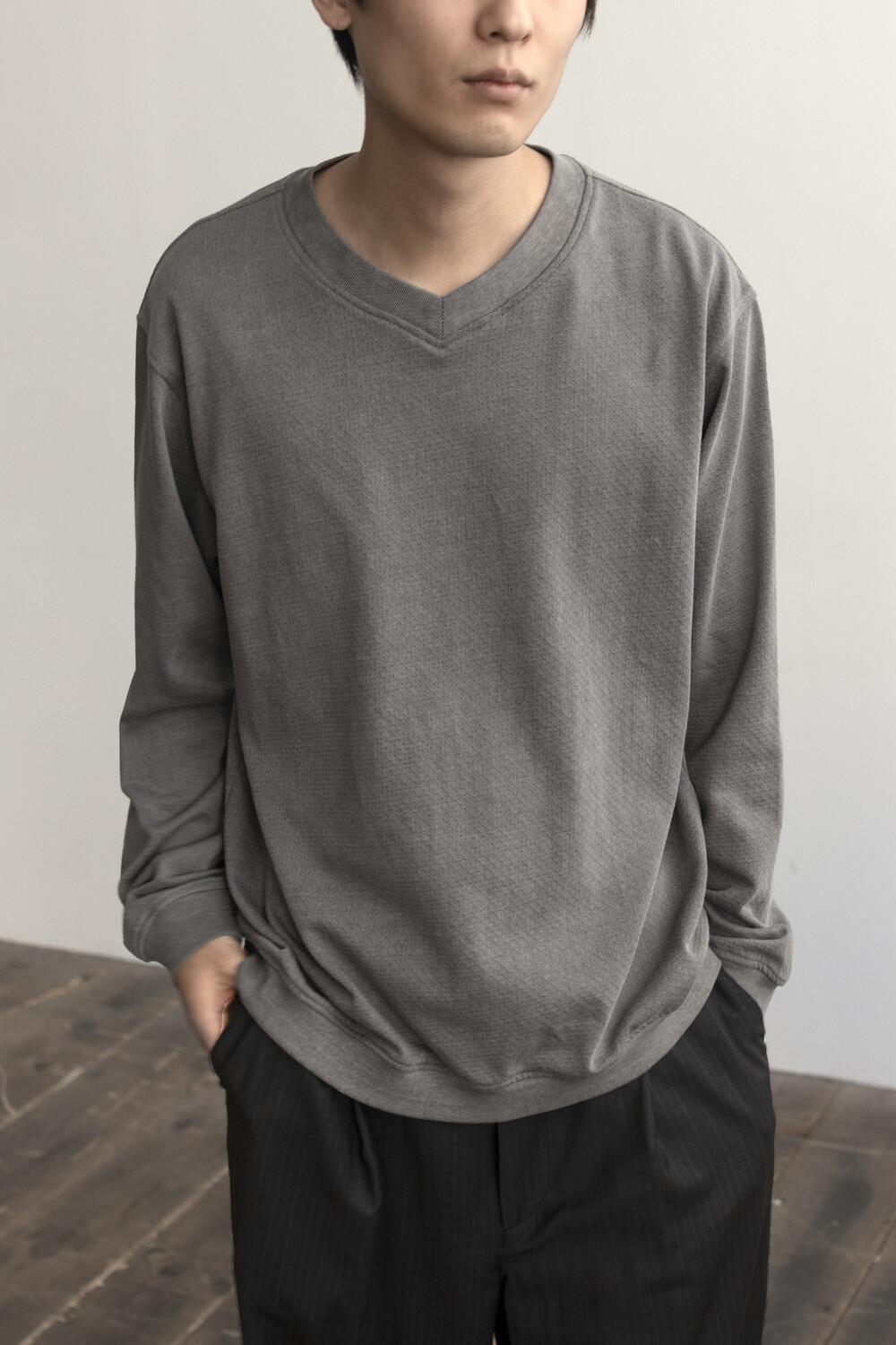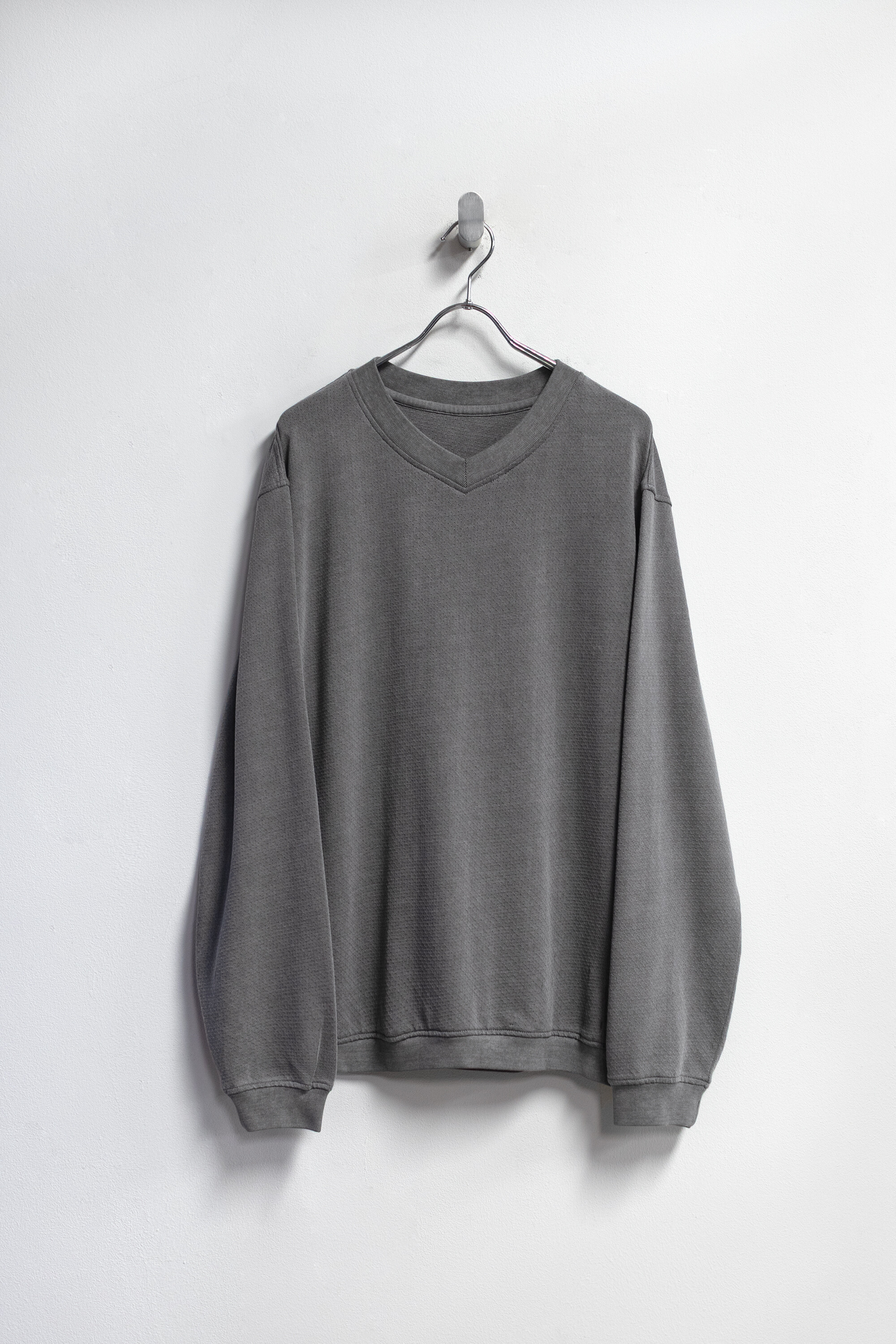피그먼트 염색 및 후가공으로 다시 구멍을 조여 촘촘하고 균일한 도트 패턴을 갖는 <브이넥 슬리브>입니다.