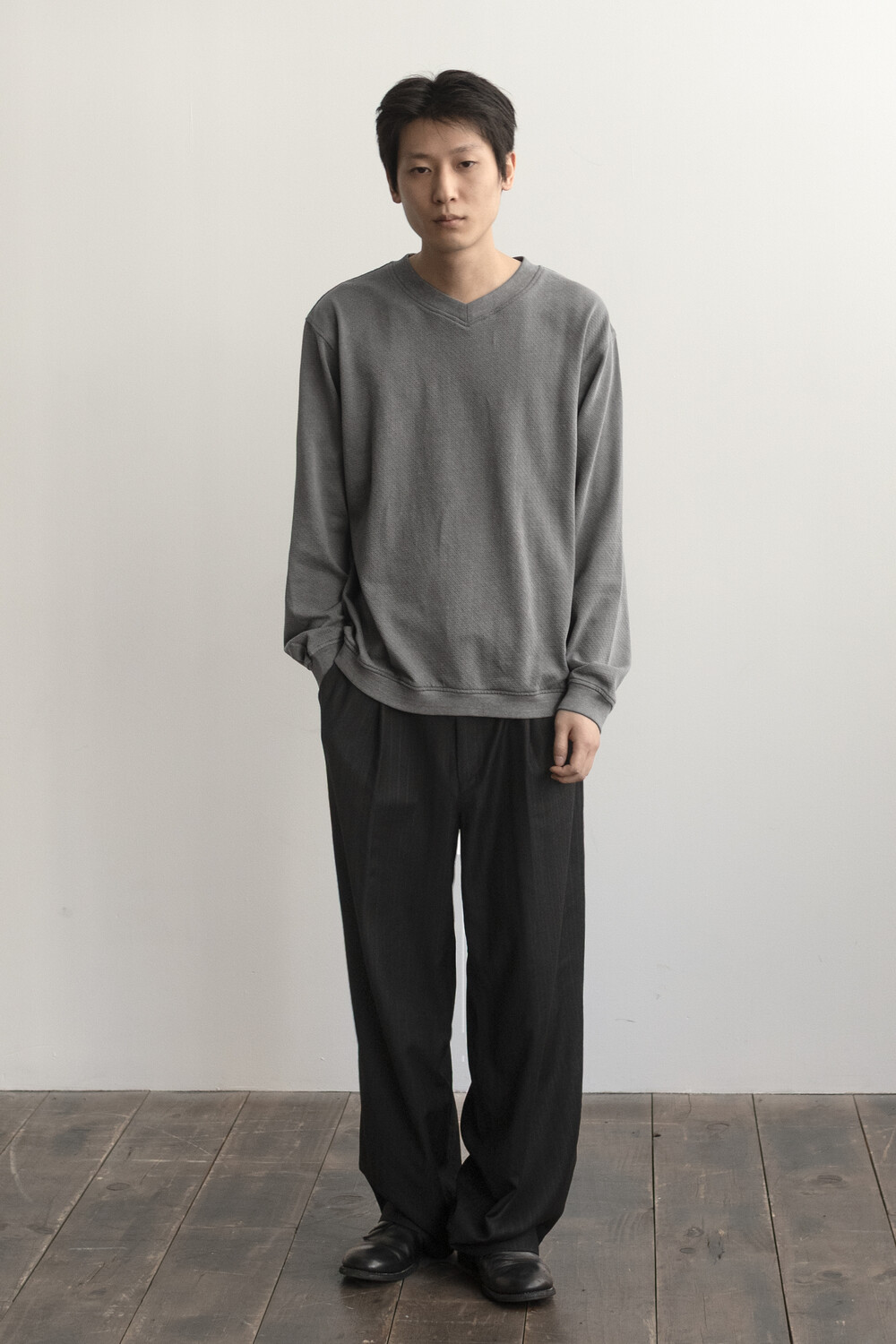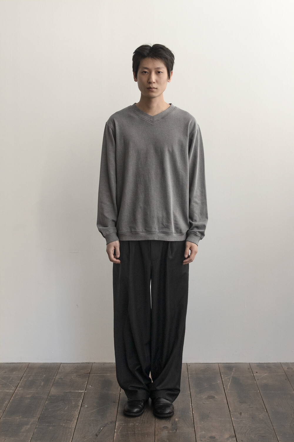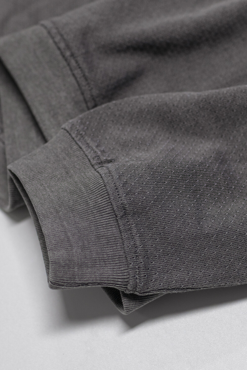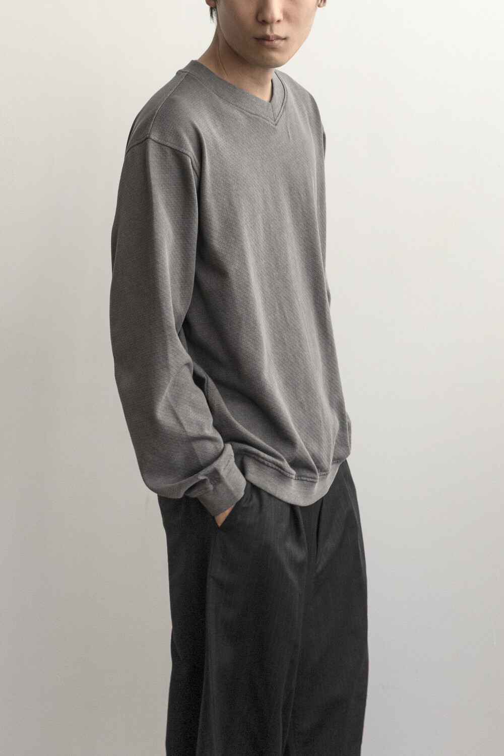 피그먼트 염색 및 후가공으로 다시 구멍을 조여 촘촘하고 균일한 도트 패턴을 갖는 <브이넥 슬리브>입니다.