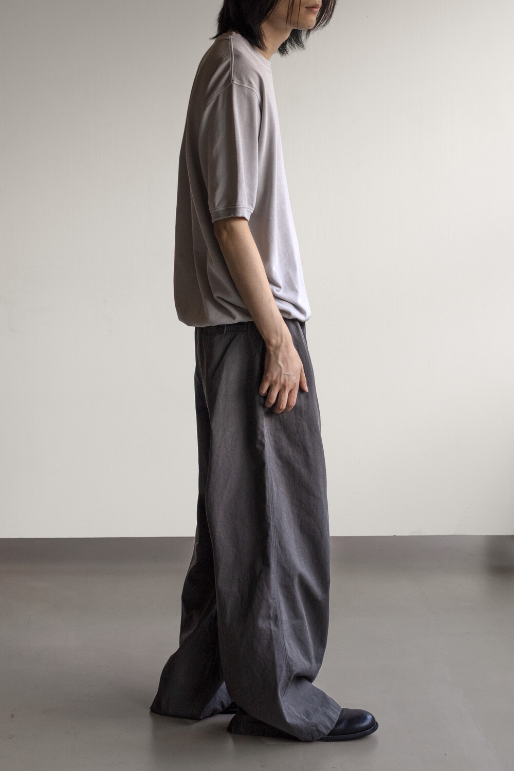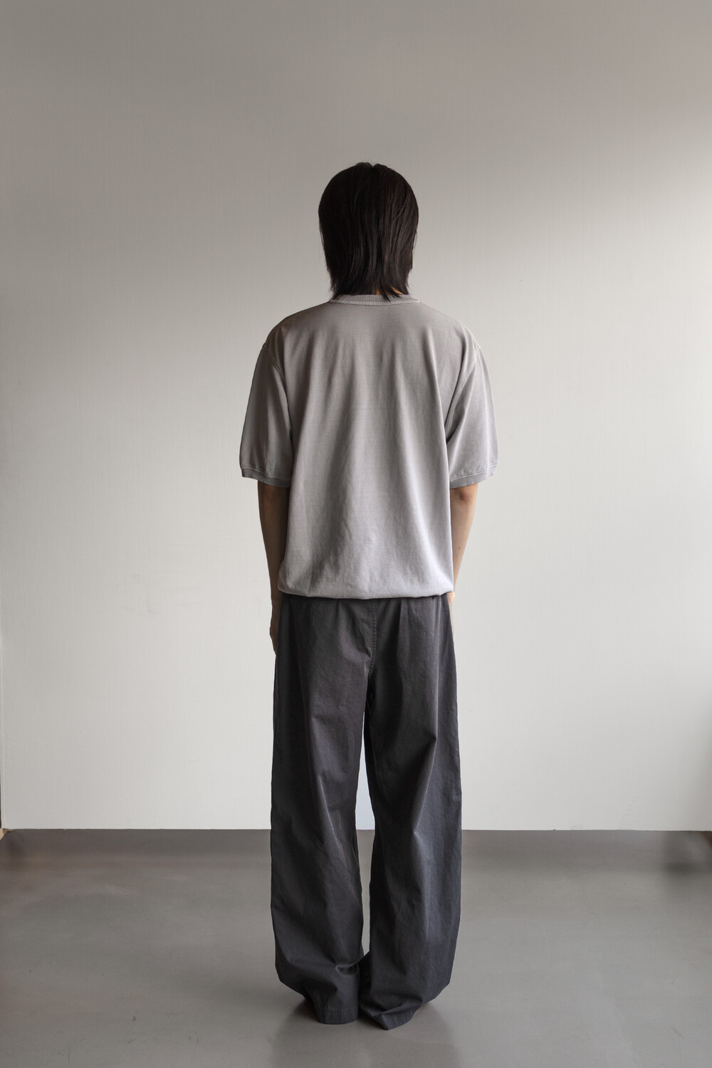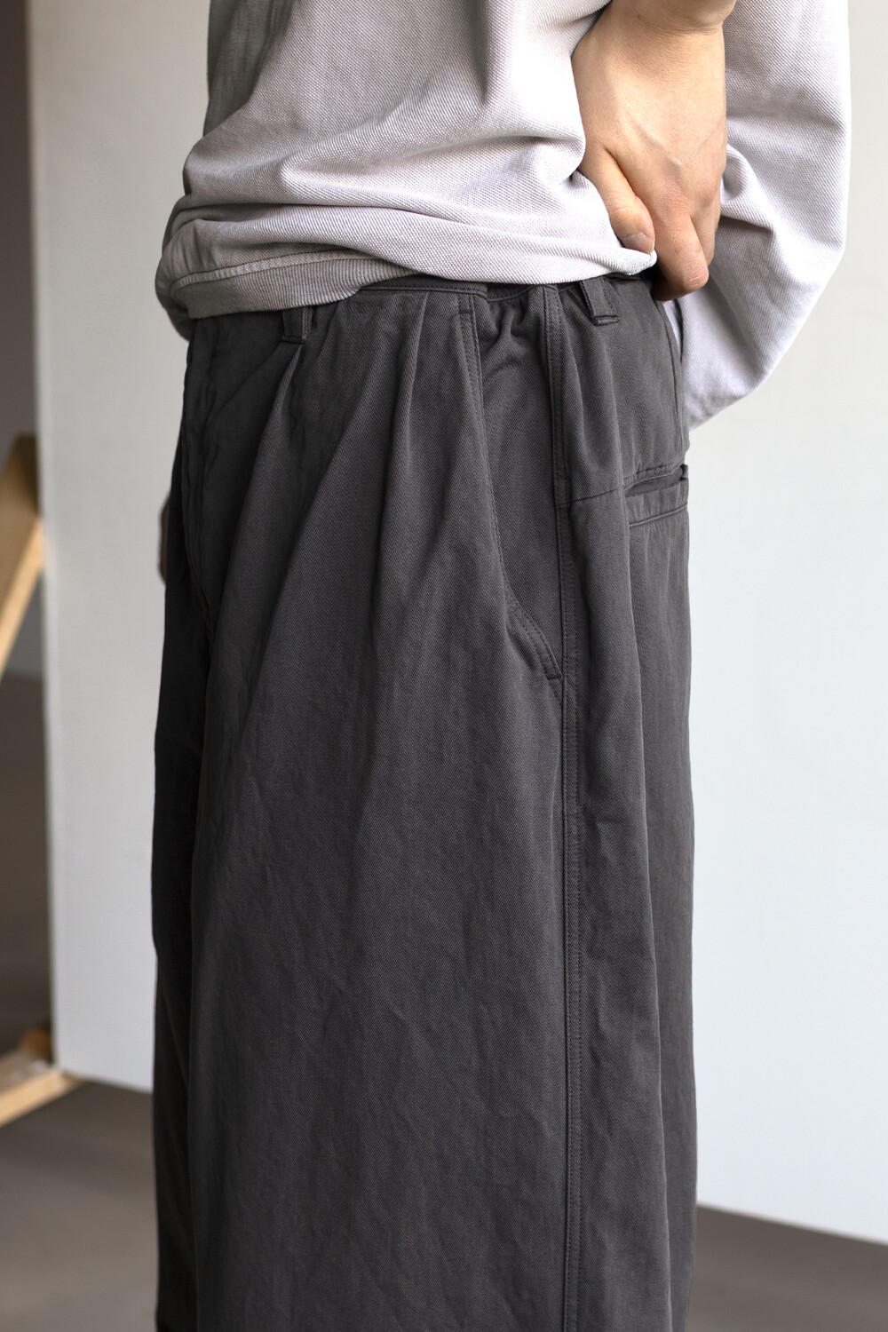 선명하고 깊은 골의, 튼튼한 짜임의 20수 코튼 드릴 원단을 사용. 소프트한 턱 설치로 상동의 여유감. 전반적으로 여유 있는 실루엣의 <washed chino pants>입니다.
