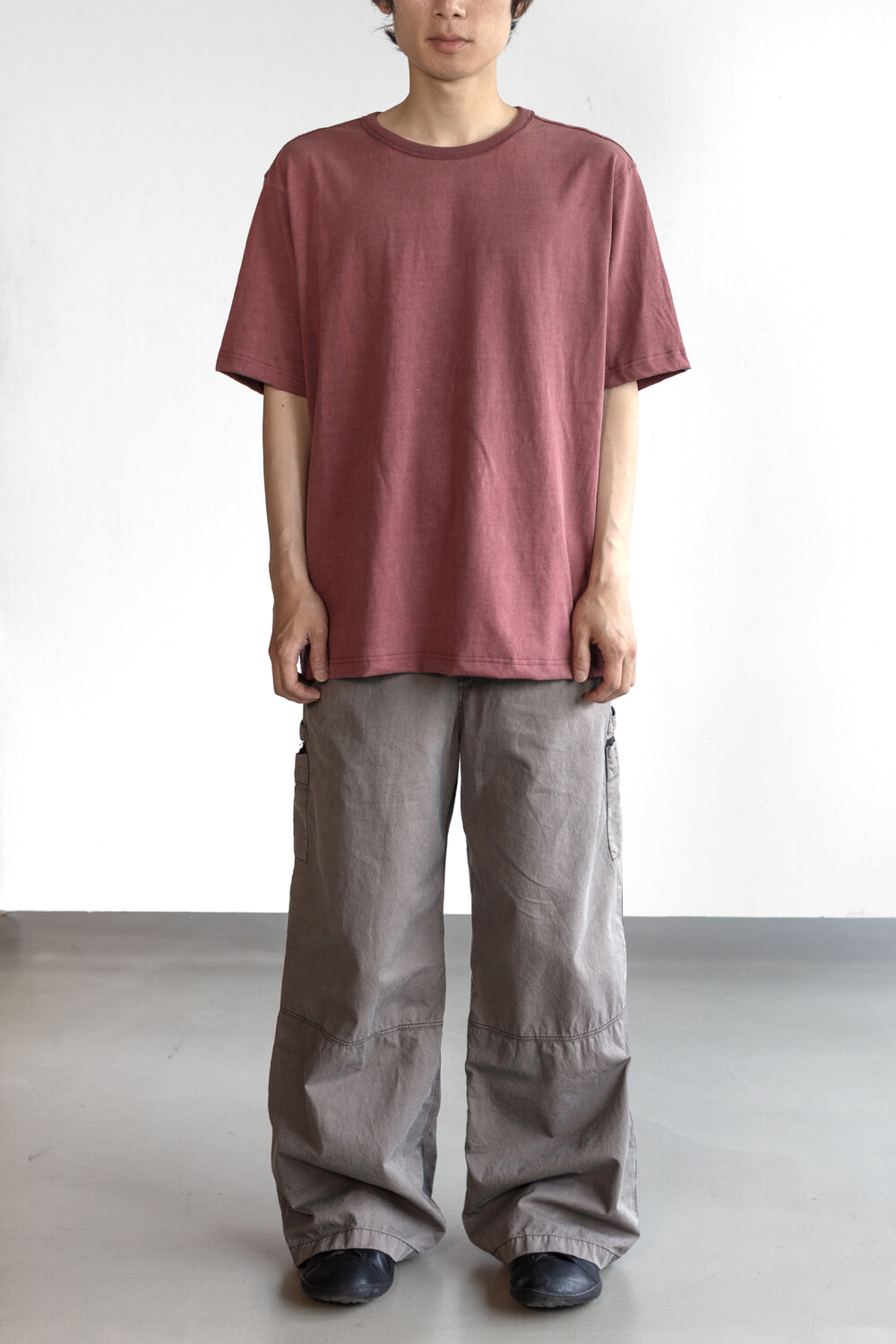 피그먼트 방식으로 염색된 20수 코튼 원단을 사용, 어깨라인 체인 스티치, 넥라인은 변형을 최소화하기 위해 바인딩 처리함.
