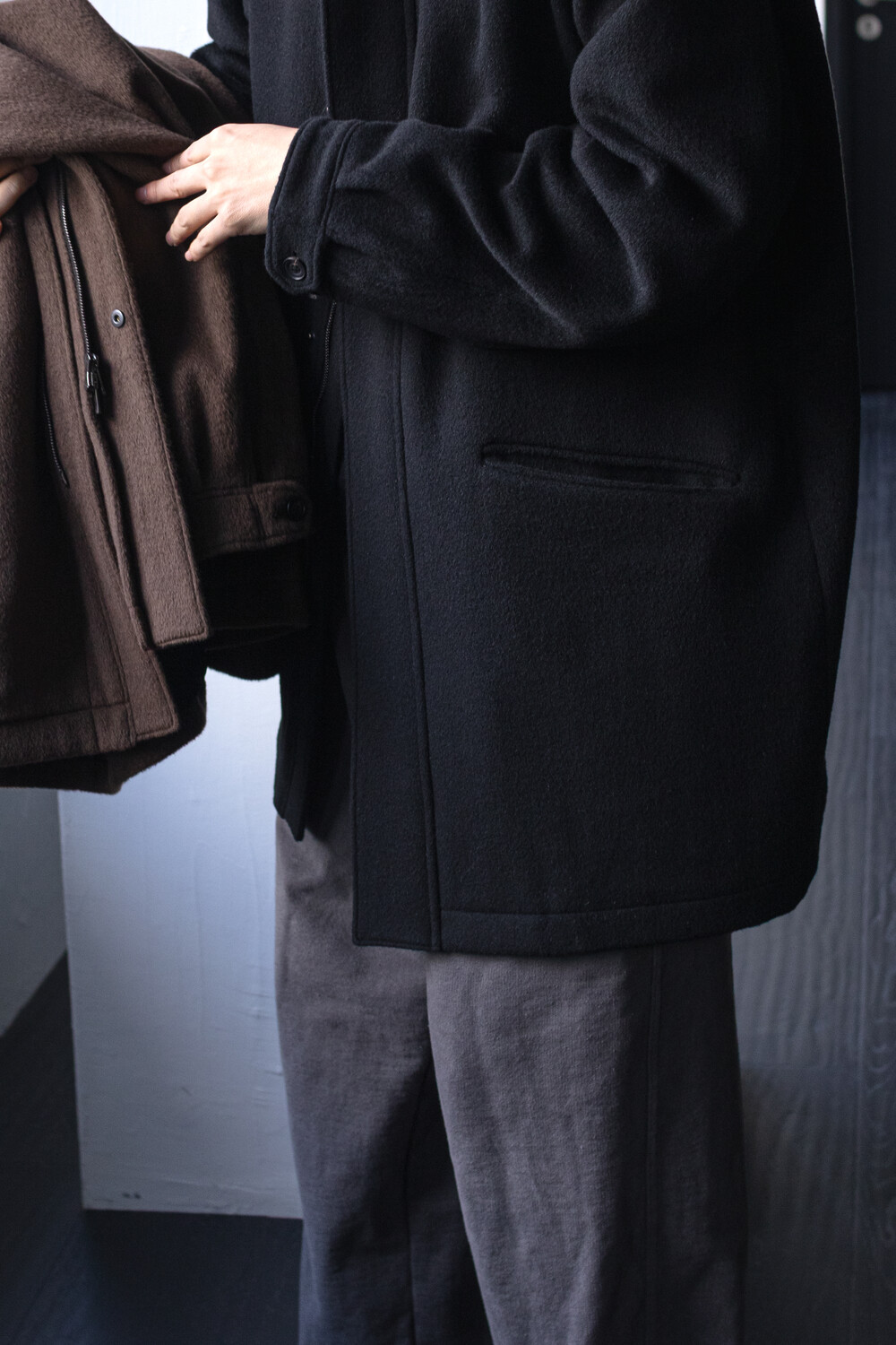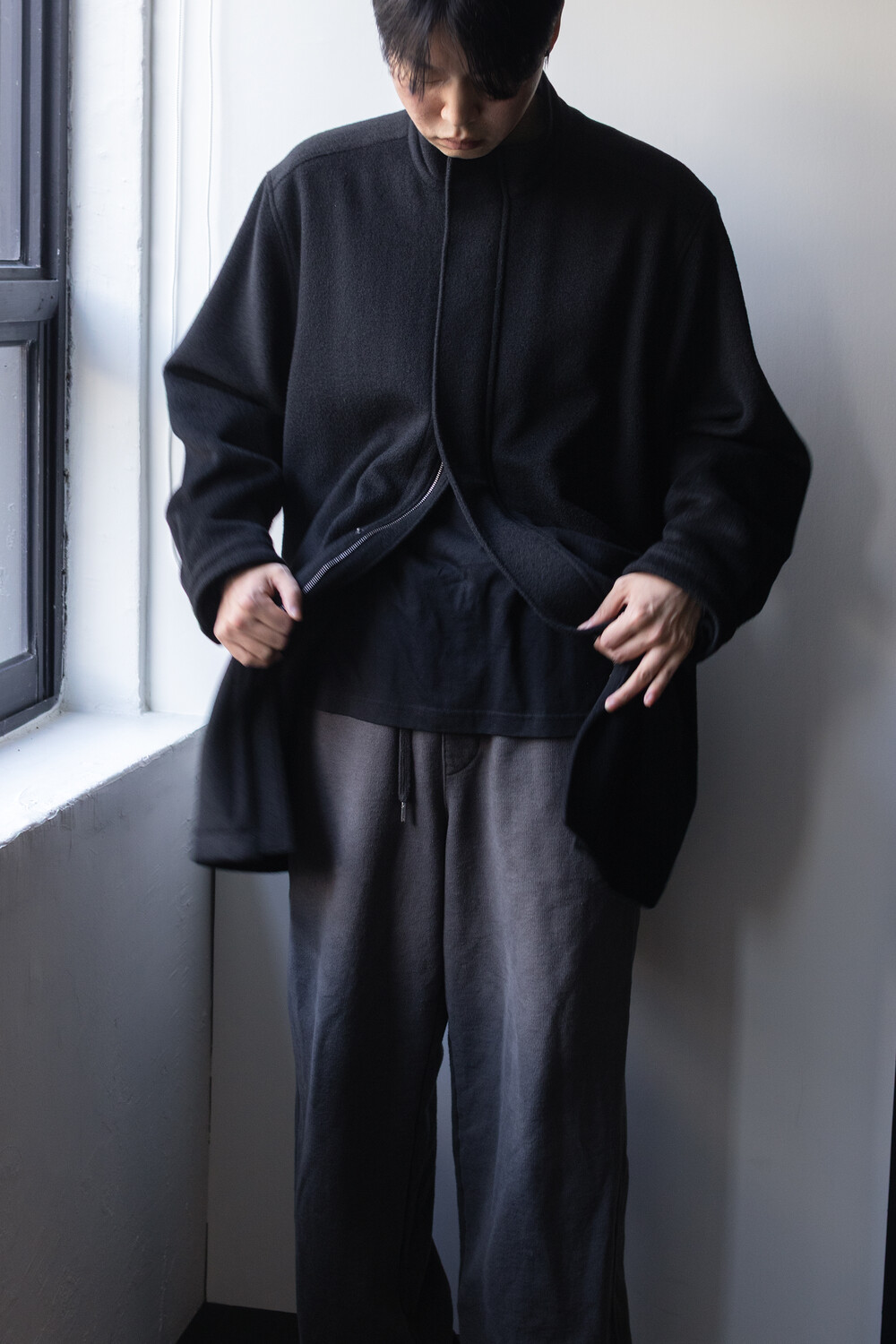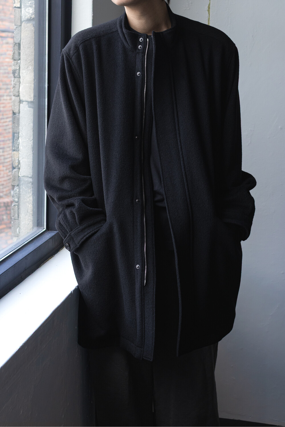 24시즌 알파카 모즈 파카에서부드럽고 유려한 착용감의 울/앙고라 소재를 겉감으로. 엑셀라 지퍼등의 부속 사양. 실루엣 미세조정과 함께 기장감 키움 등의 수정이 있었습니다.