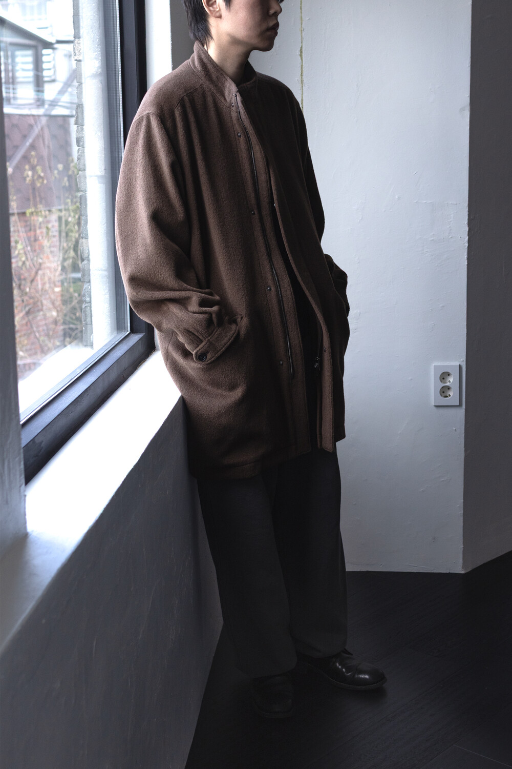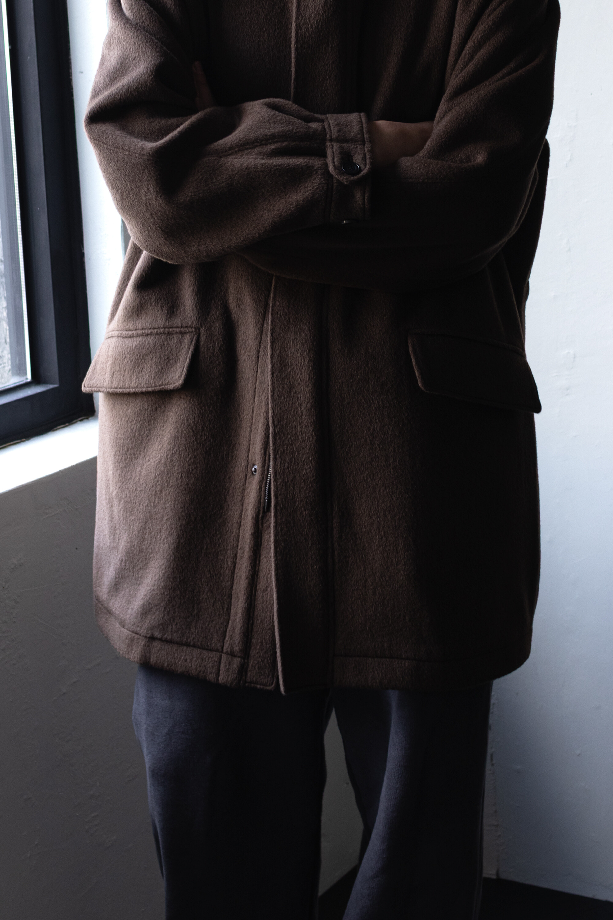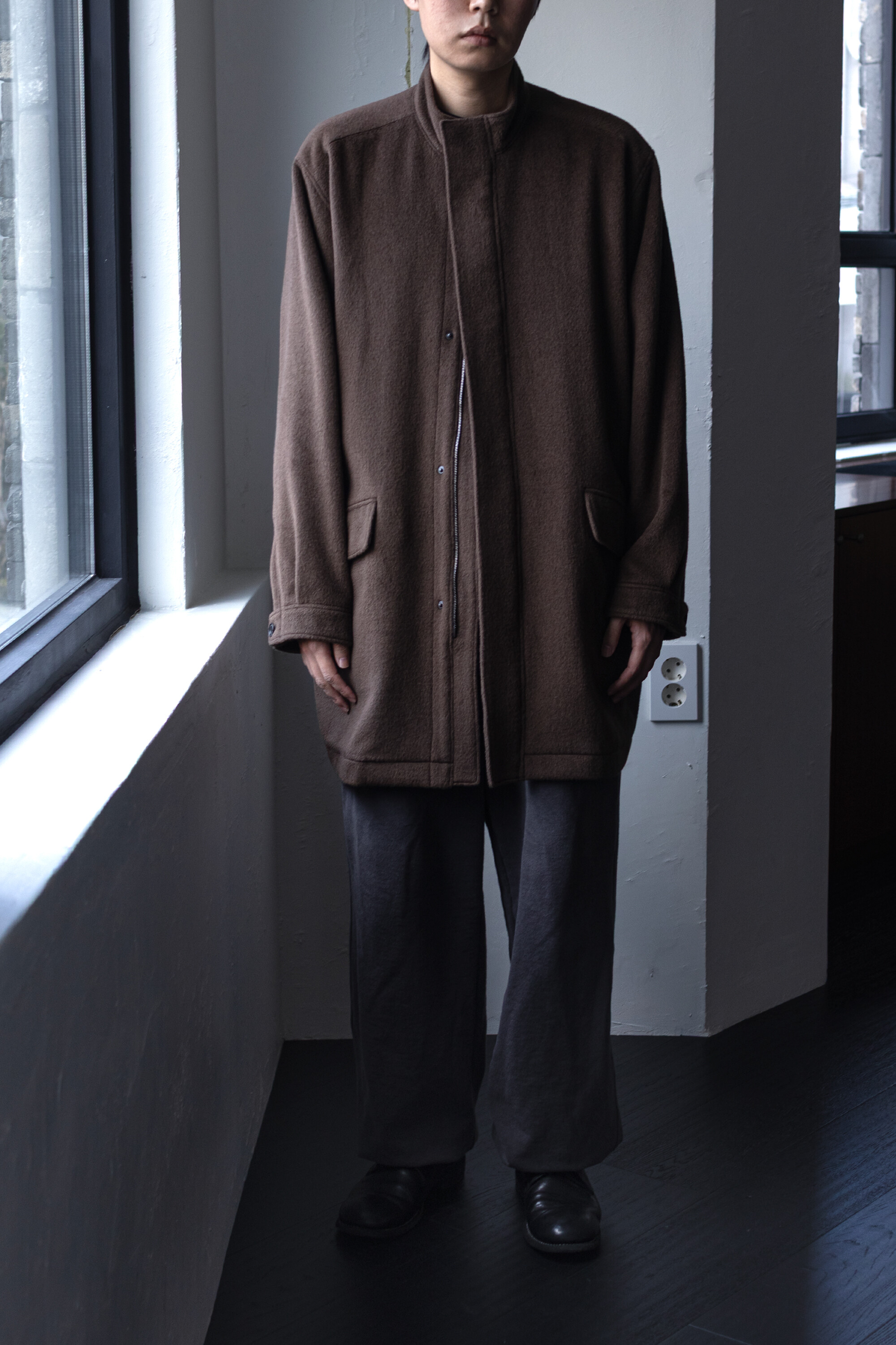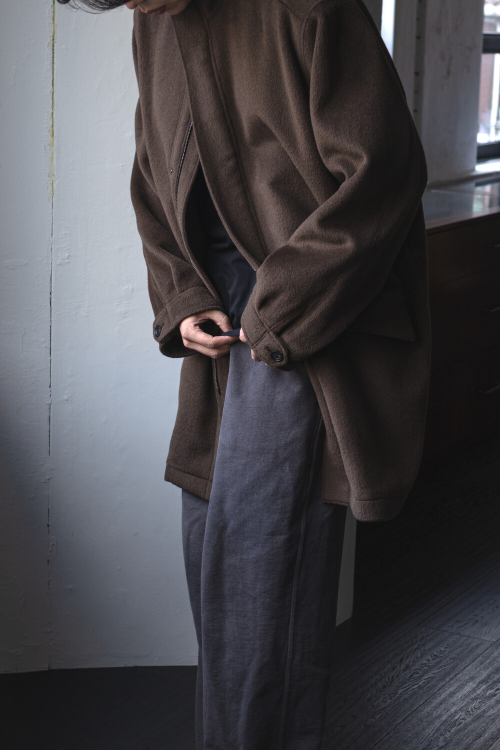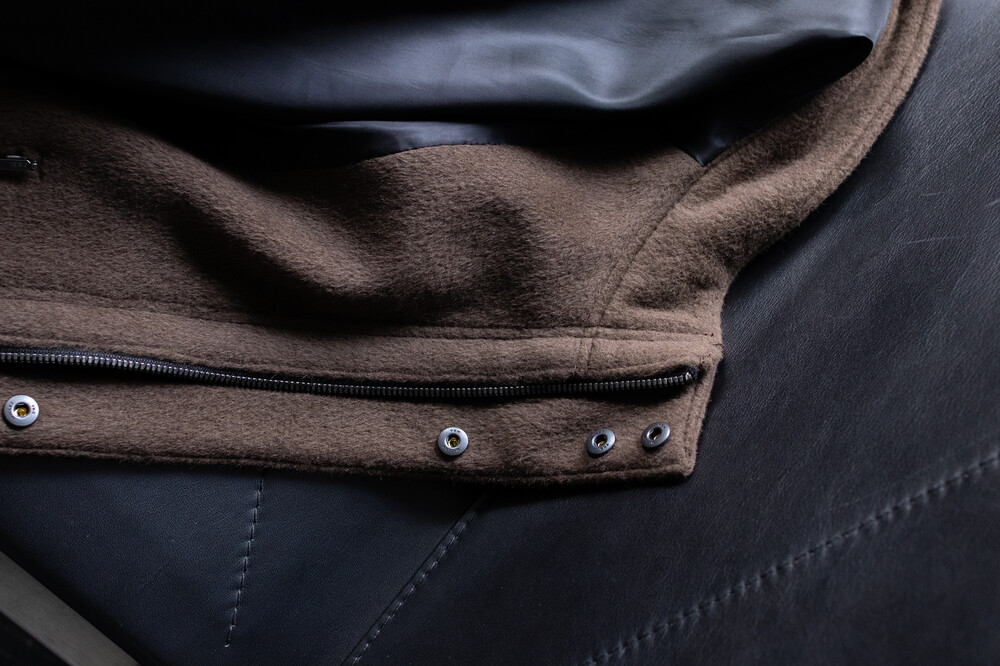 24시즌 알파카 모즈 파카에서부드럽고 유려한 착용감의 울/앙고라 소재를 겉감으로. 엑셀라 지퍼등의 부속 사양. 실루엣 미세조정과 함께 기장감 키움 등의 수정이 있었습니다.