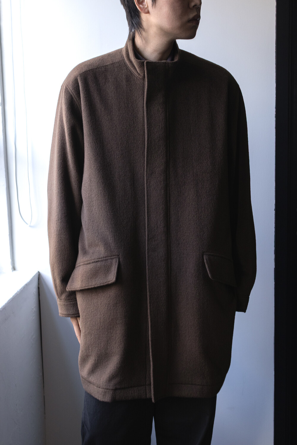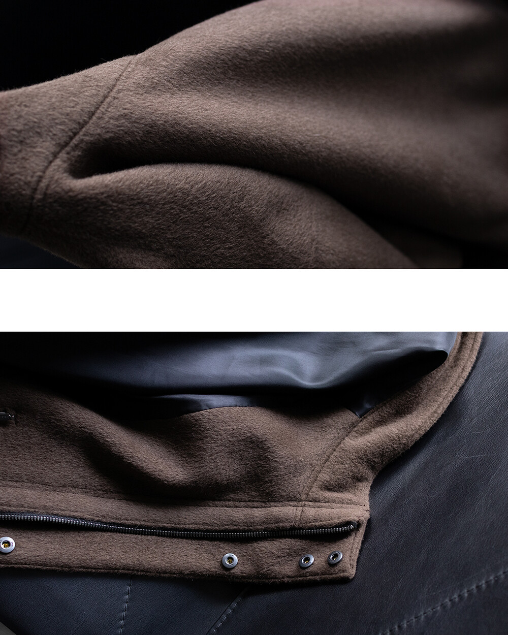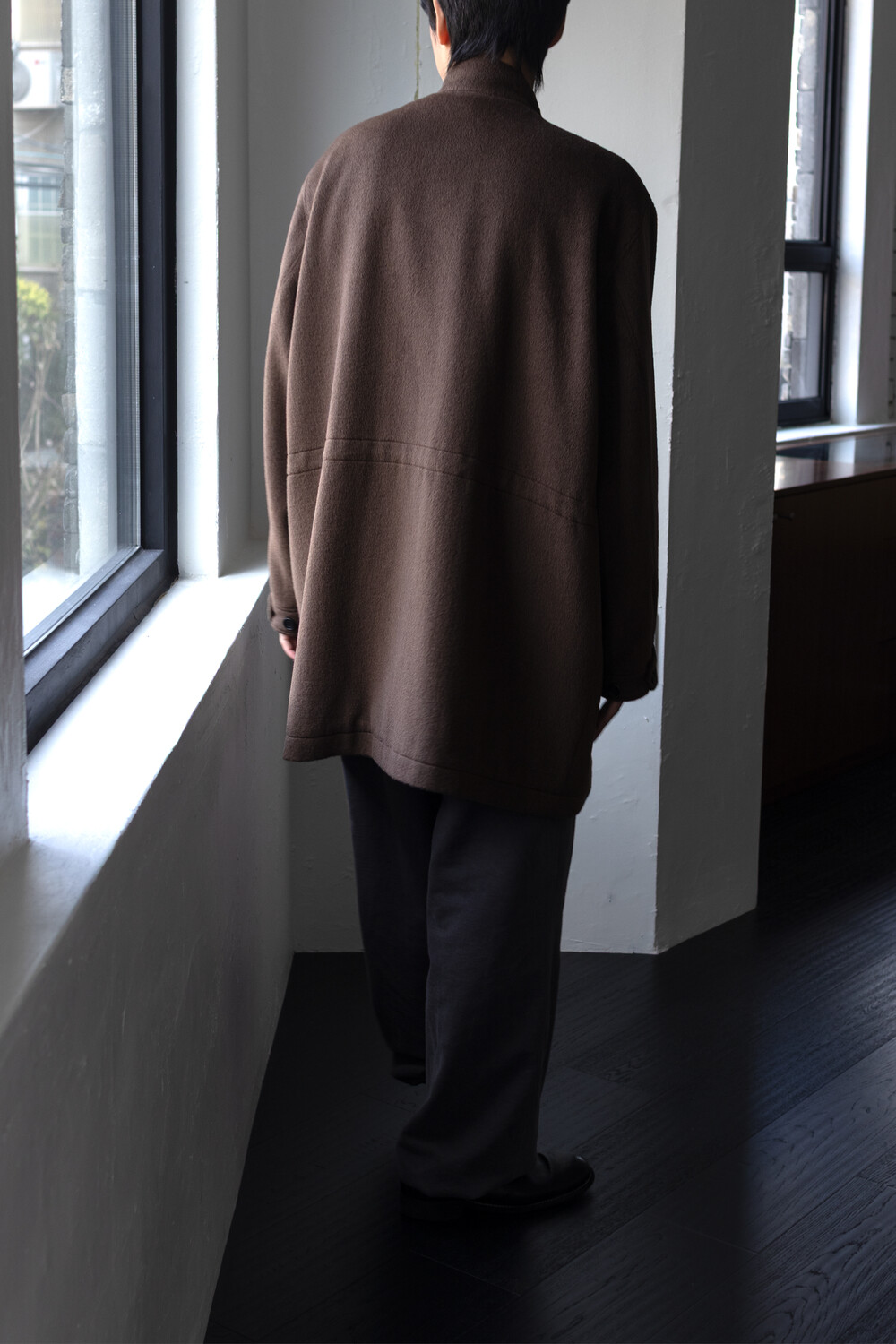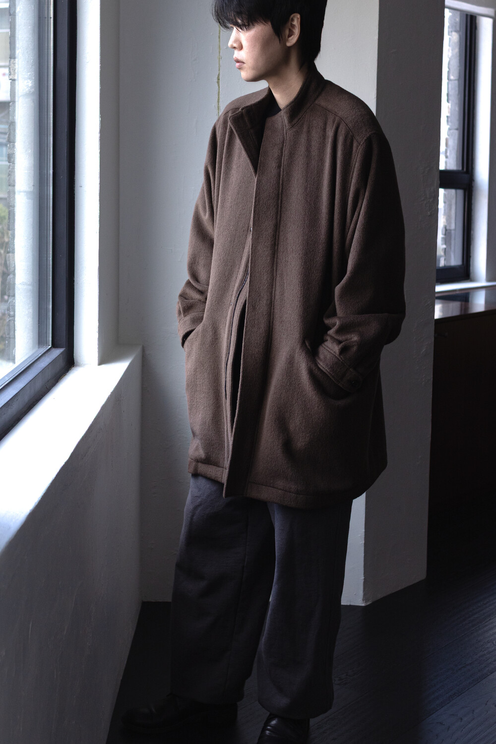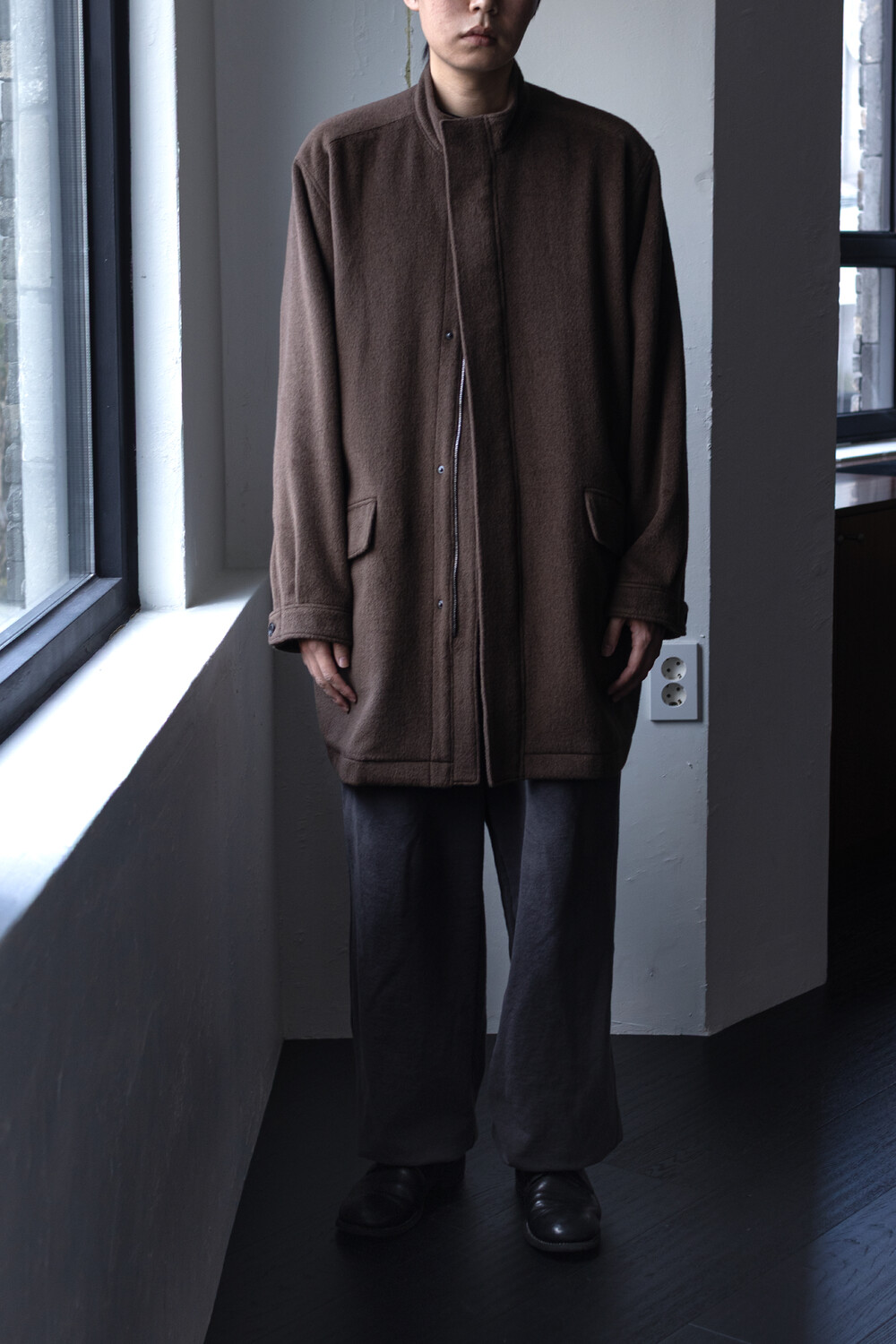 24시즌 알파카 모즈 파카에서부드럽고 유려한 착용감의 울/앙고라 소재를 겉감으로. 엑셀라 지퍼등의 부속 사양. 실루엣 미세조정과 함께 기장감 키움 등의 수정이 있었습니다.