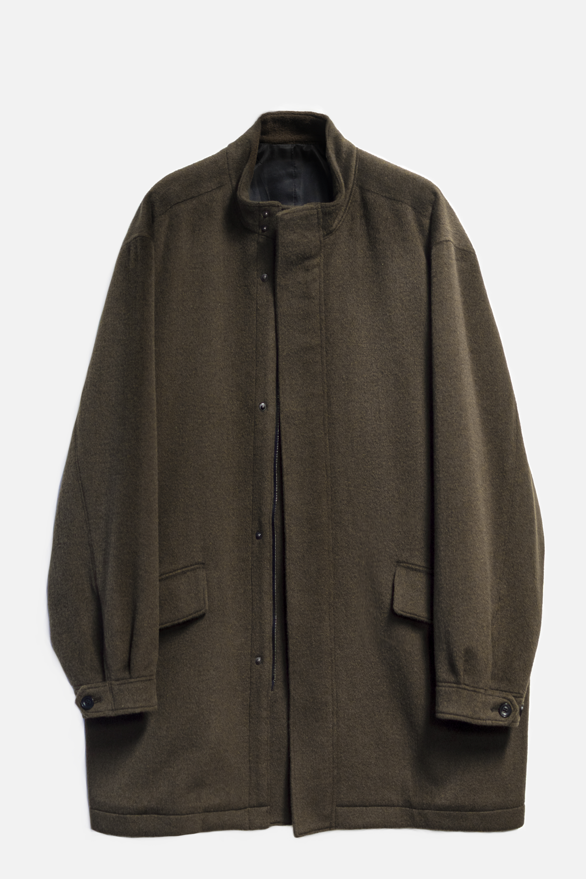 넥을 감싸는 하이넥 형태의 카라. 여유있는 실루엣으로 겹겹이 레이어드하여 착용할 수 있는 울 앙고라 모즈 파카입니다.