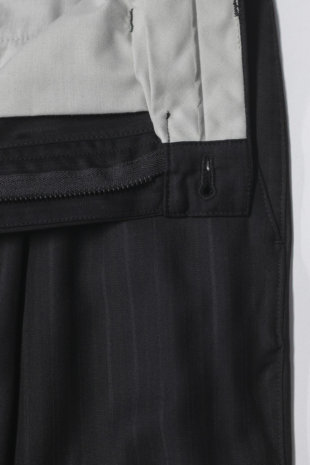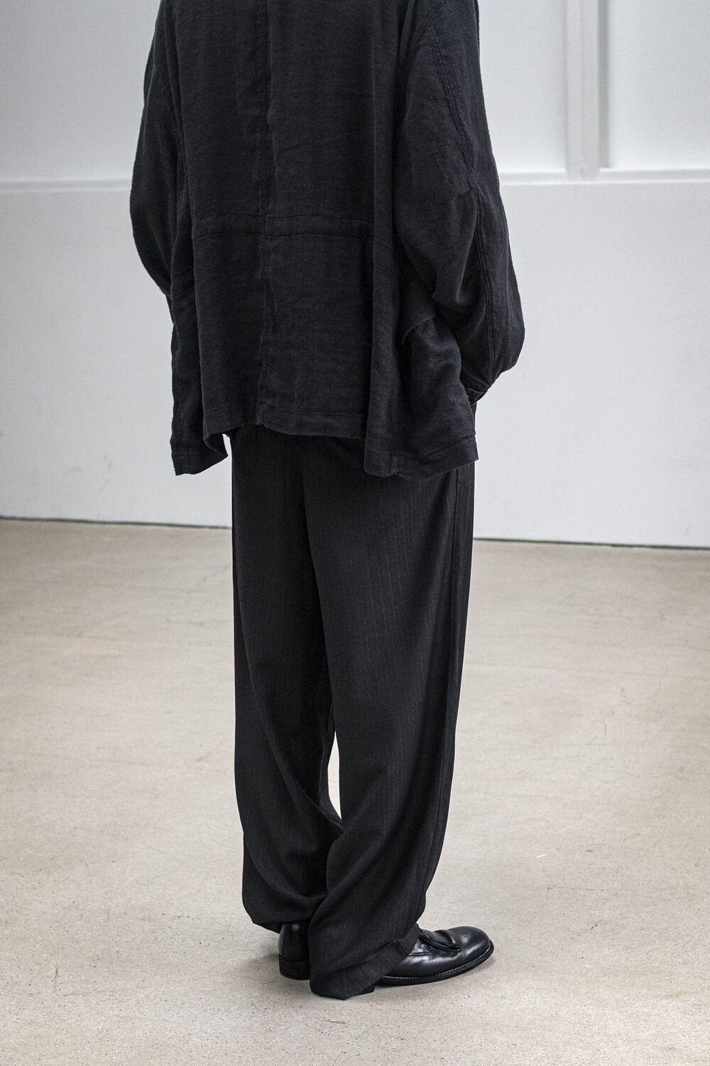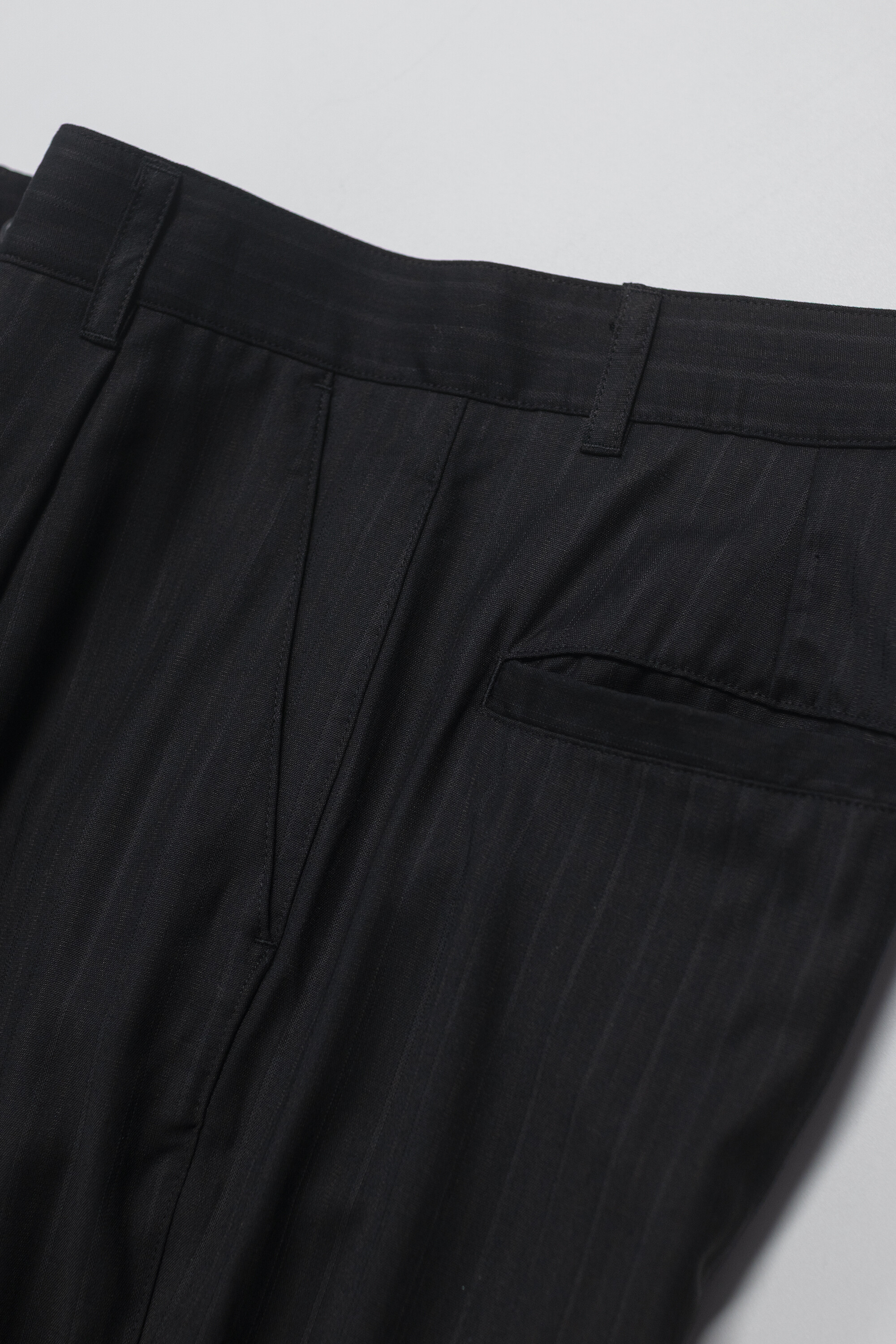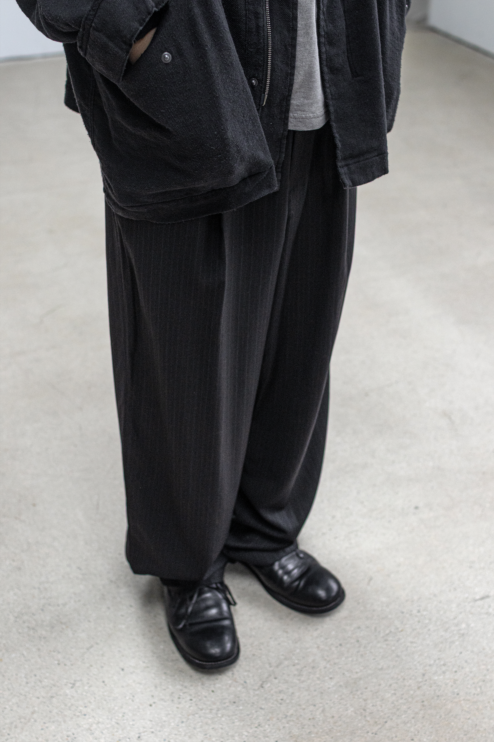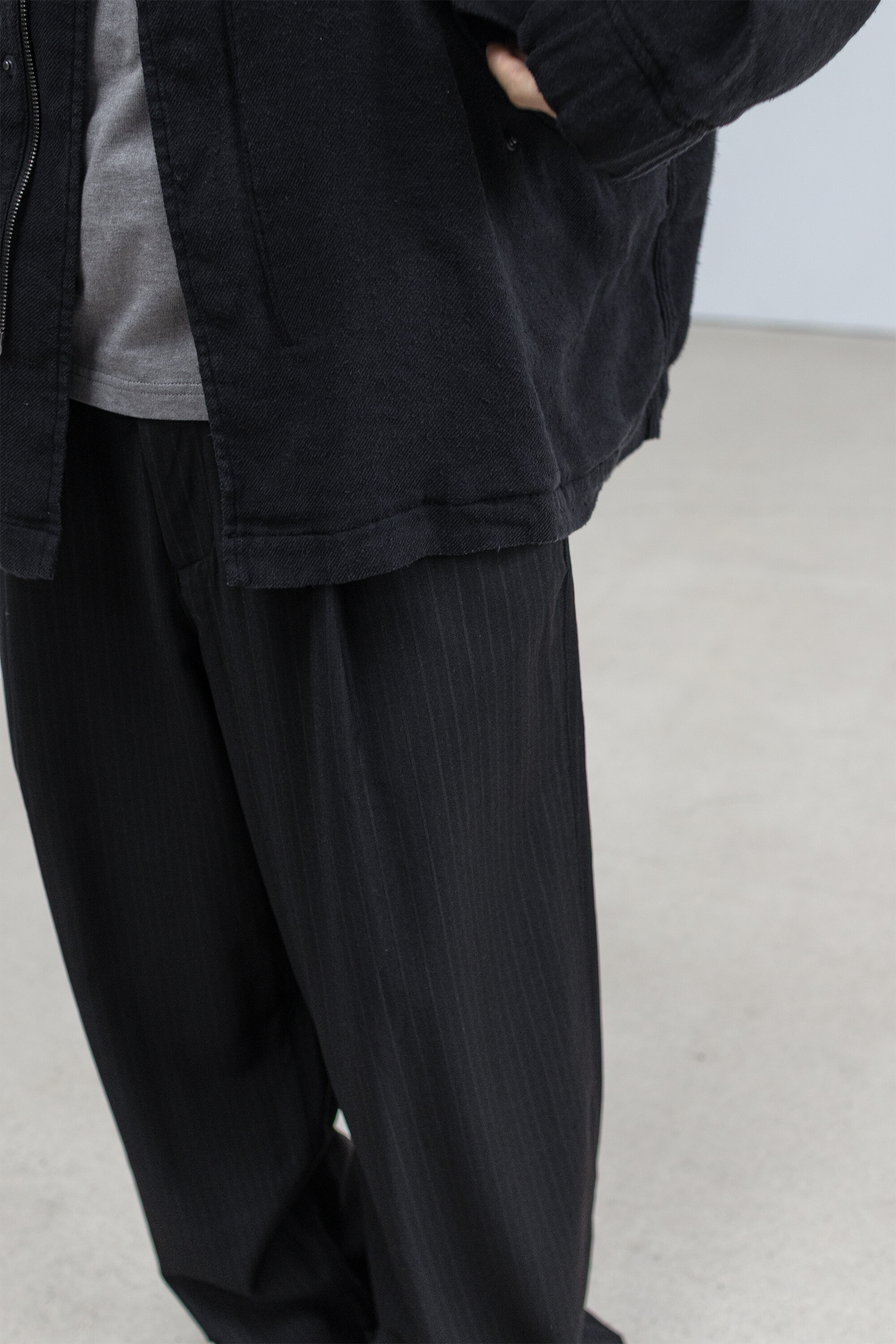 차분한 인상 안에 옅은 세로 결이 은은하게 드러나는 <울 스트라이프 트라우저>입니다.