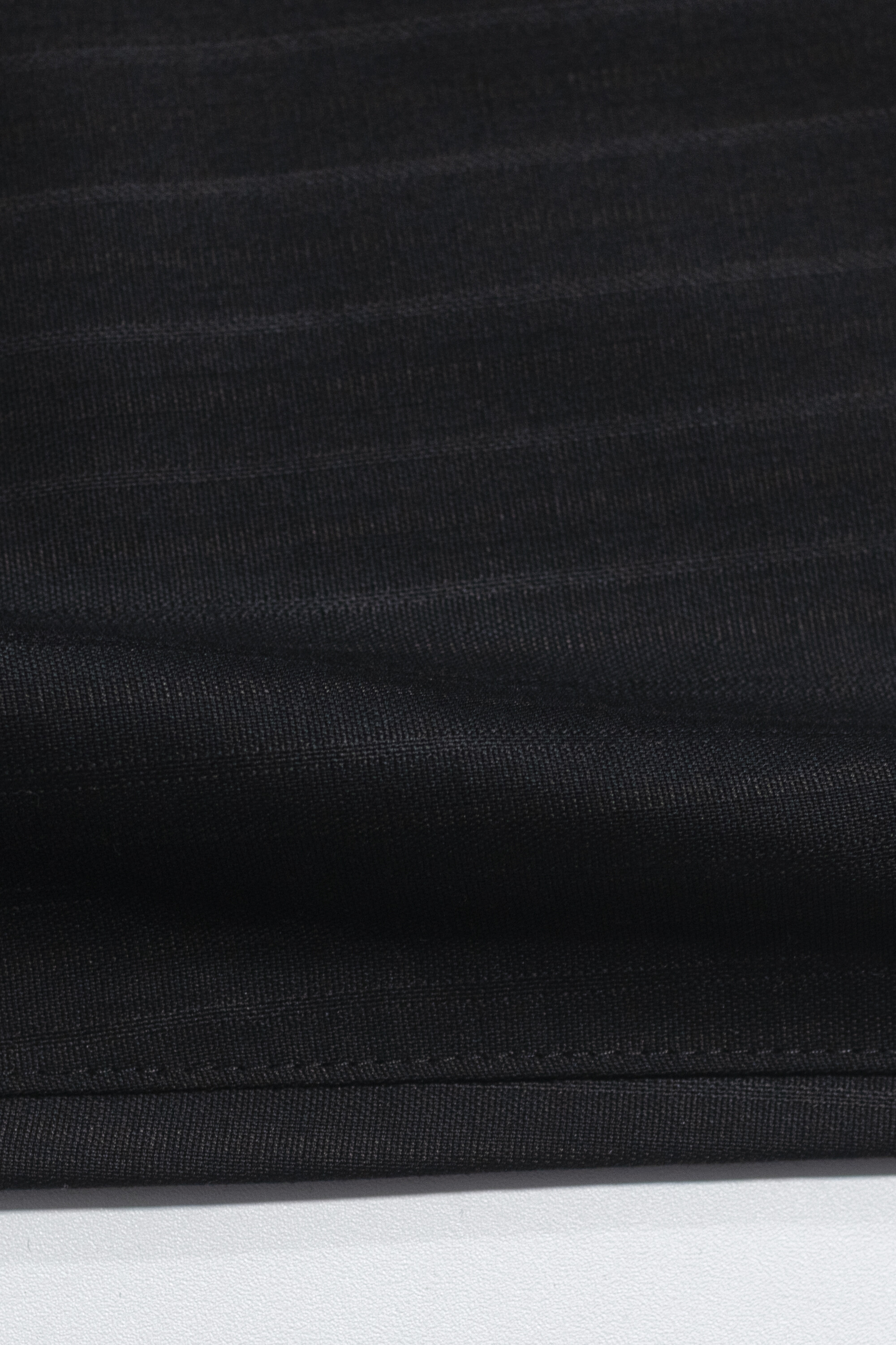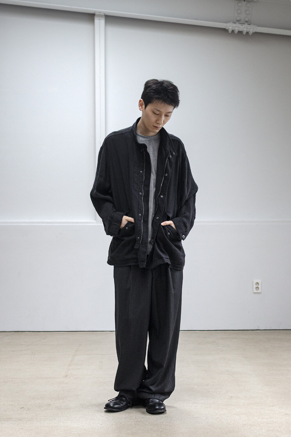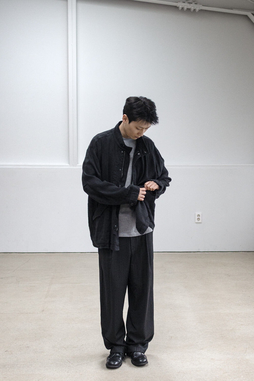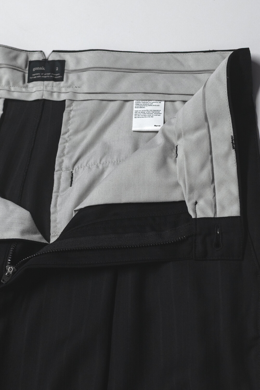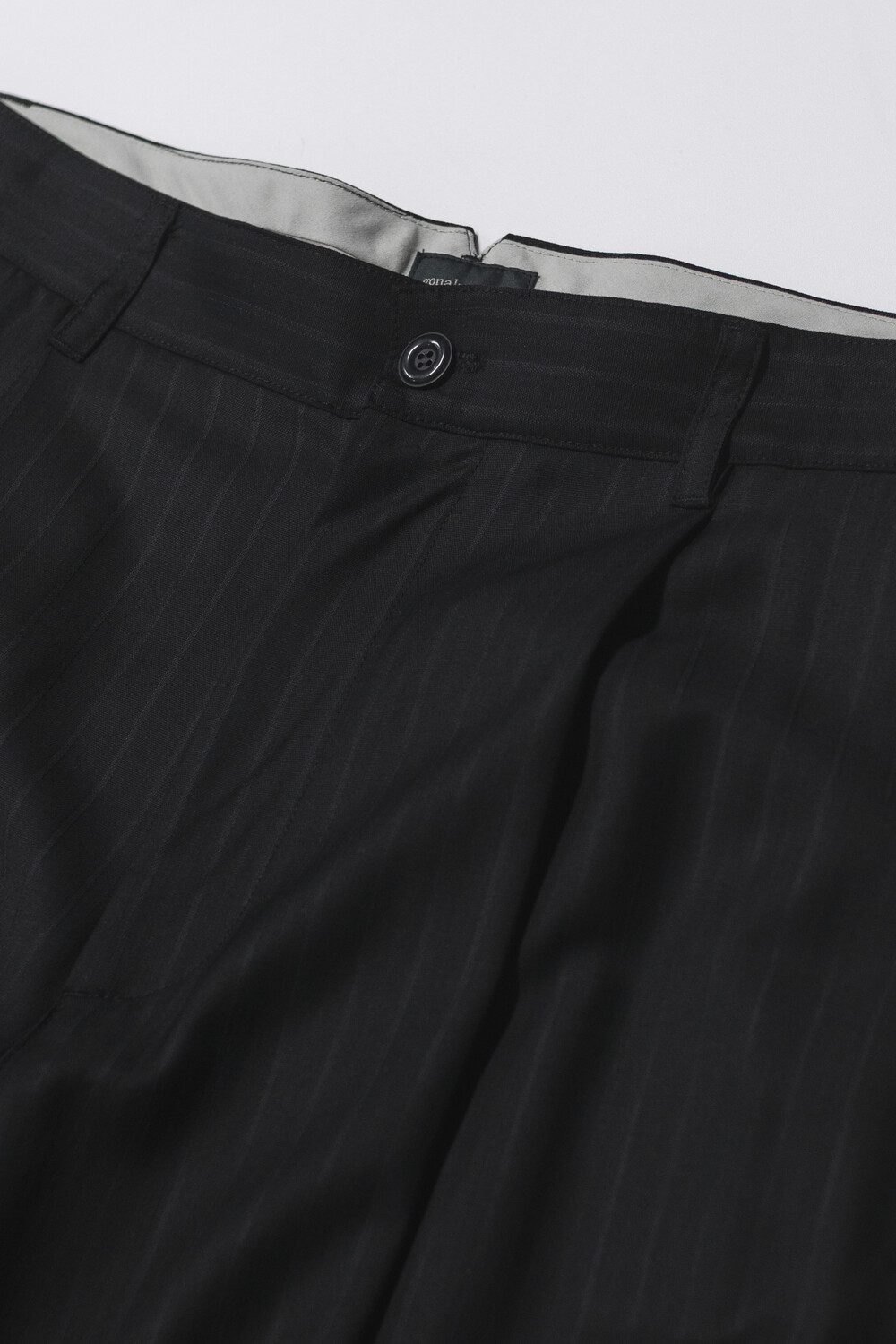차분한 인상 안에 옅은 세로 결이 은은하게 드러나는 <울 스트라이프 트라우저>입니다.